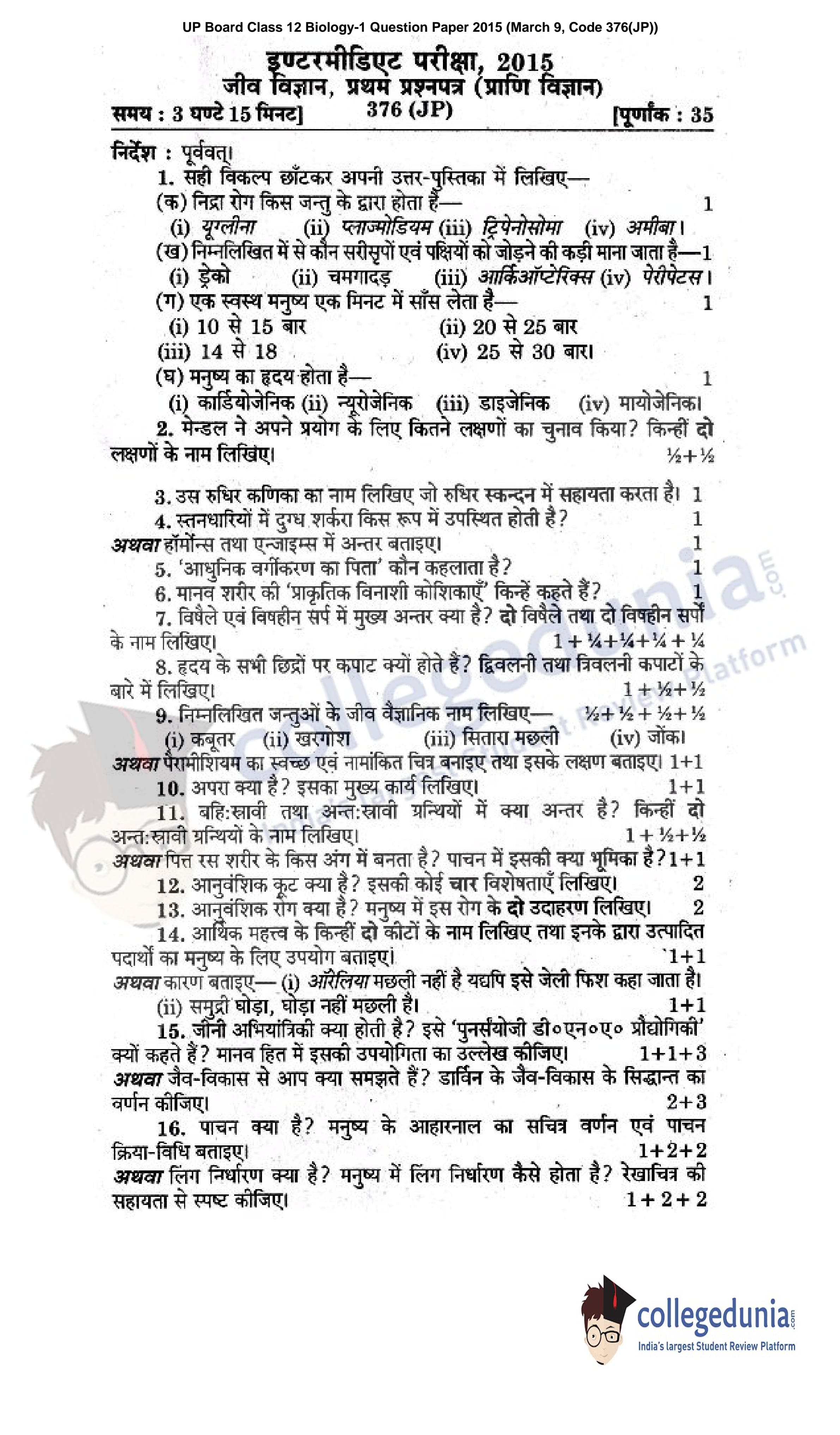 UP Board Class 12 Biology-1 Question Paper 2015 with Answer Key Code 376(JP) is available for download. The exam was conducted by the Uttar Pradesh Madhyamik Shiksha Parishad (UPMSP) on March 9, 2015 in the Afternoon Session 2 PM to 5:15 PM. The medium of paper was Hindi. The question paper comprised a total of 16 questions.