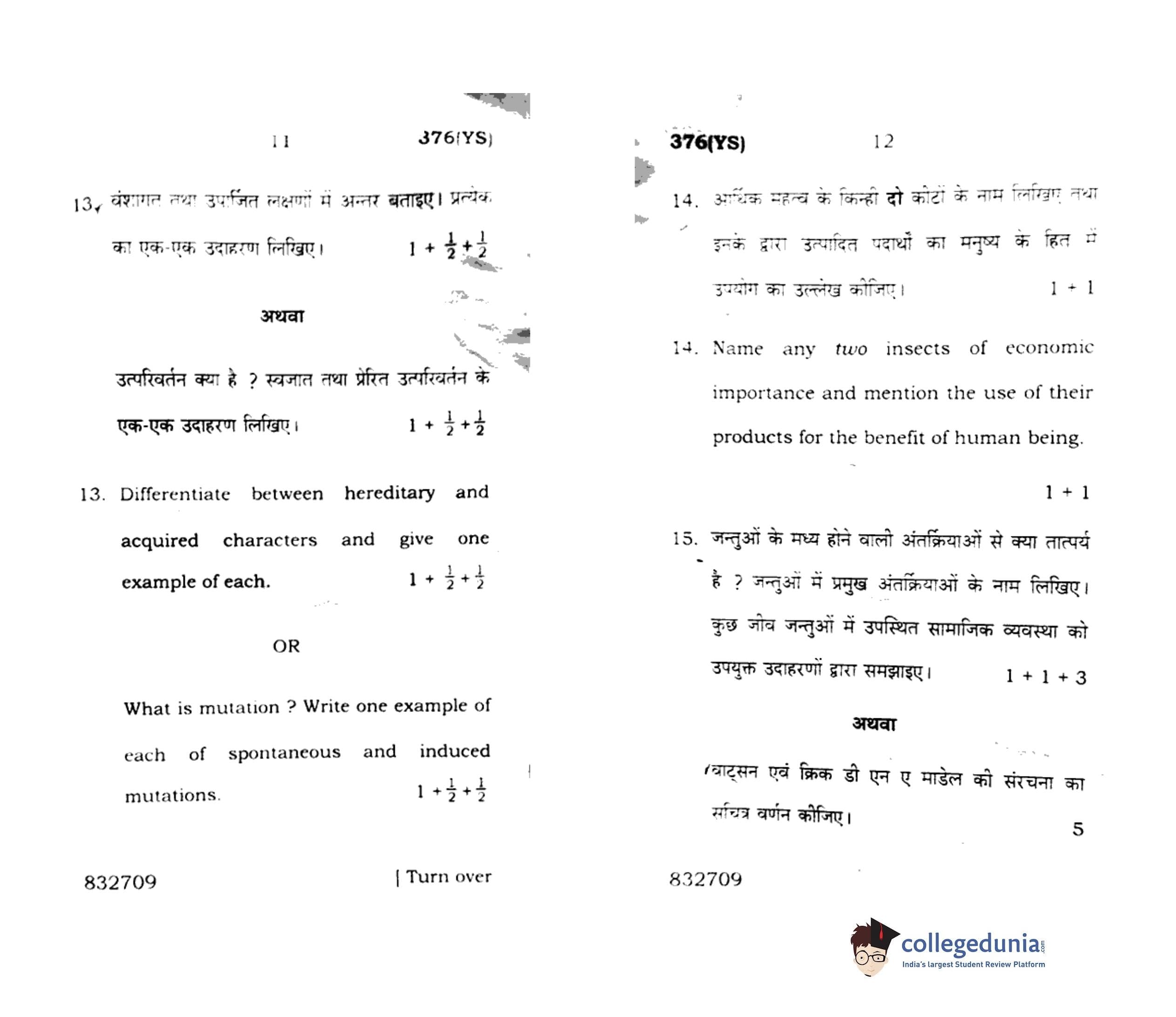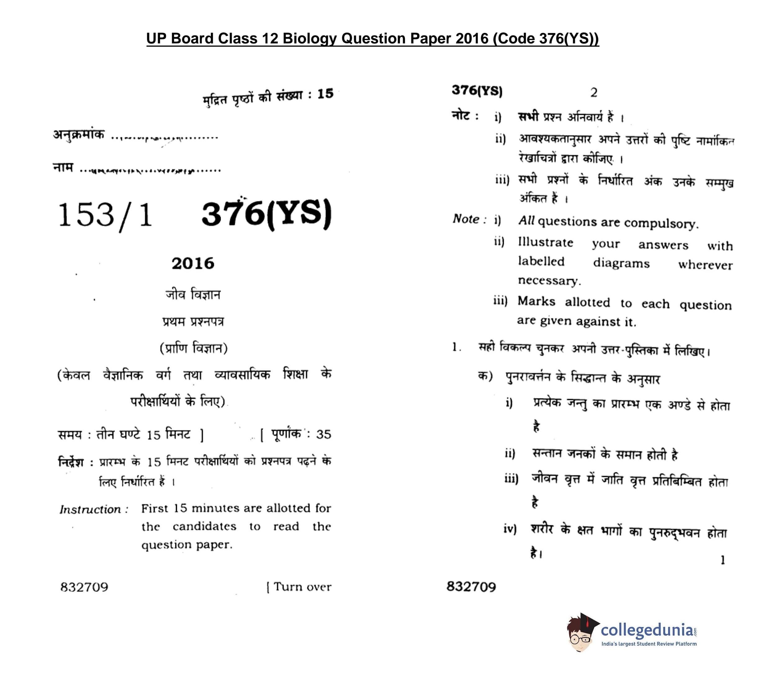 UP Board Class 12 Biology-1 Question Paper 2016 with Answer Key Code 376(YS) is available for download. The exam was conducted by the Uttar Pradesh Madhyamik Shiksha Parishad (UPMSP) on March 3, 2016 in the Afternoon Session 2 PM to 5:15 PM. The medium of paper was English and Hindi. The question paper comprised a total of 16 questions.