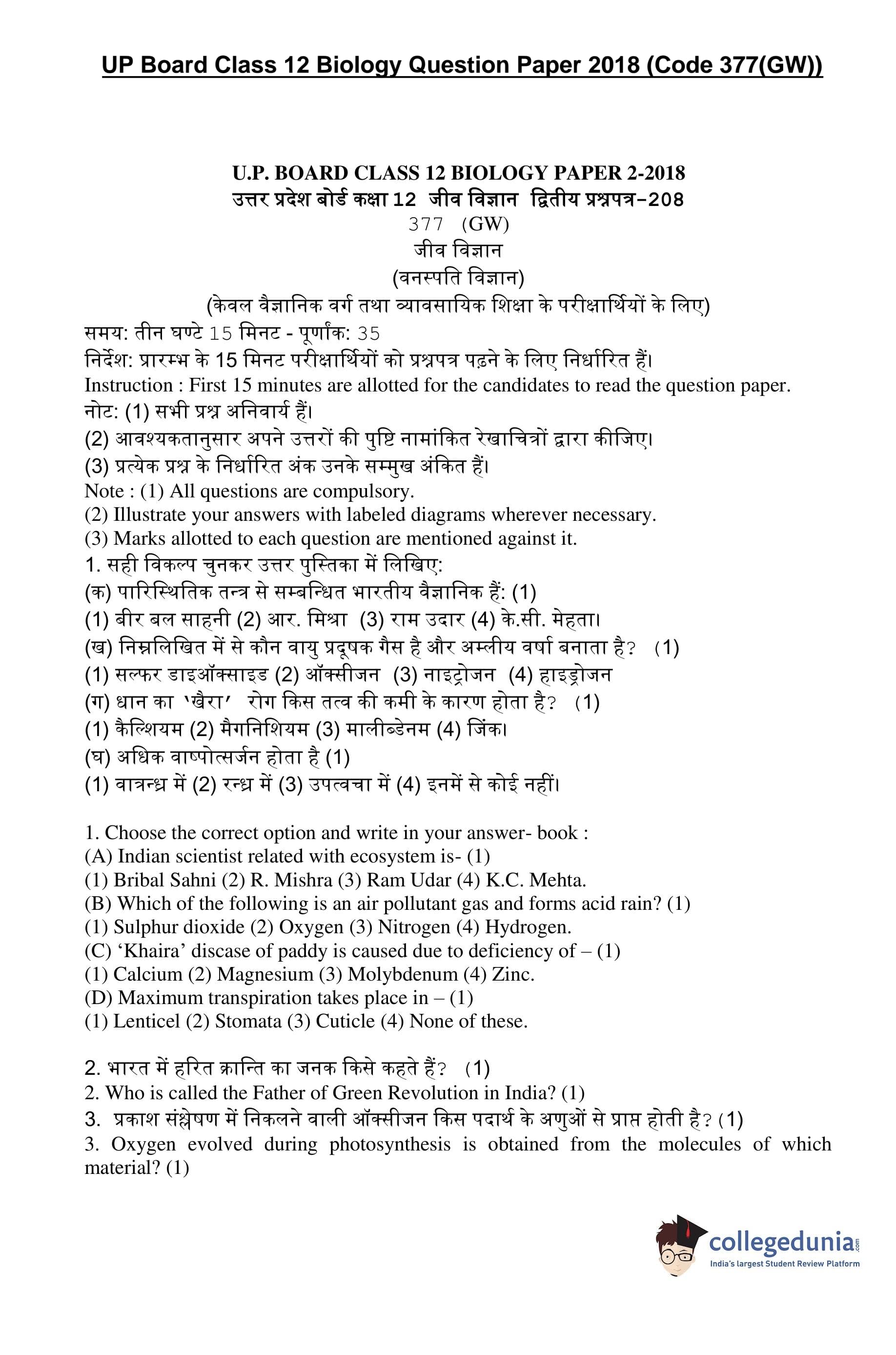 UP Board Class 12 Biology-2 Question Paper 2018 with Answer Key Code 377(GW) is available for download. The exam was conducted by the Uttar Pradesh Madhyamik Shiksha Parishad (UPMSP) on March 7, 2018 in the Afternoon Session 2 PM to 5:15 PM. The medium of paper was English and Hindi. The question paper comprised a total of 16 questions.