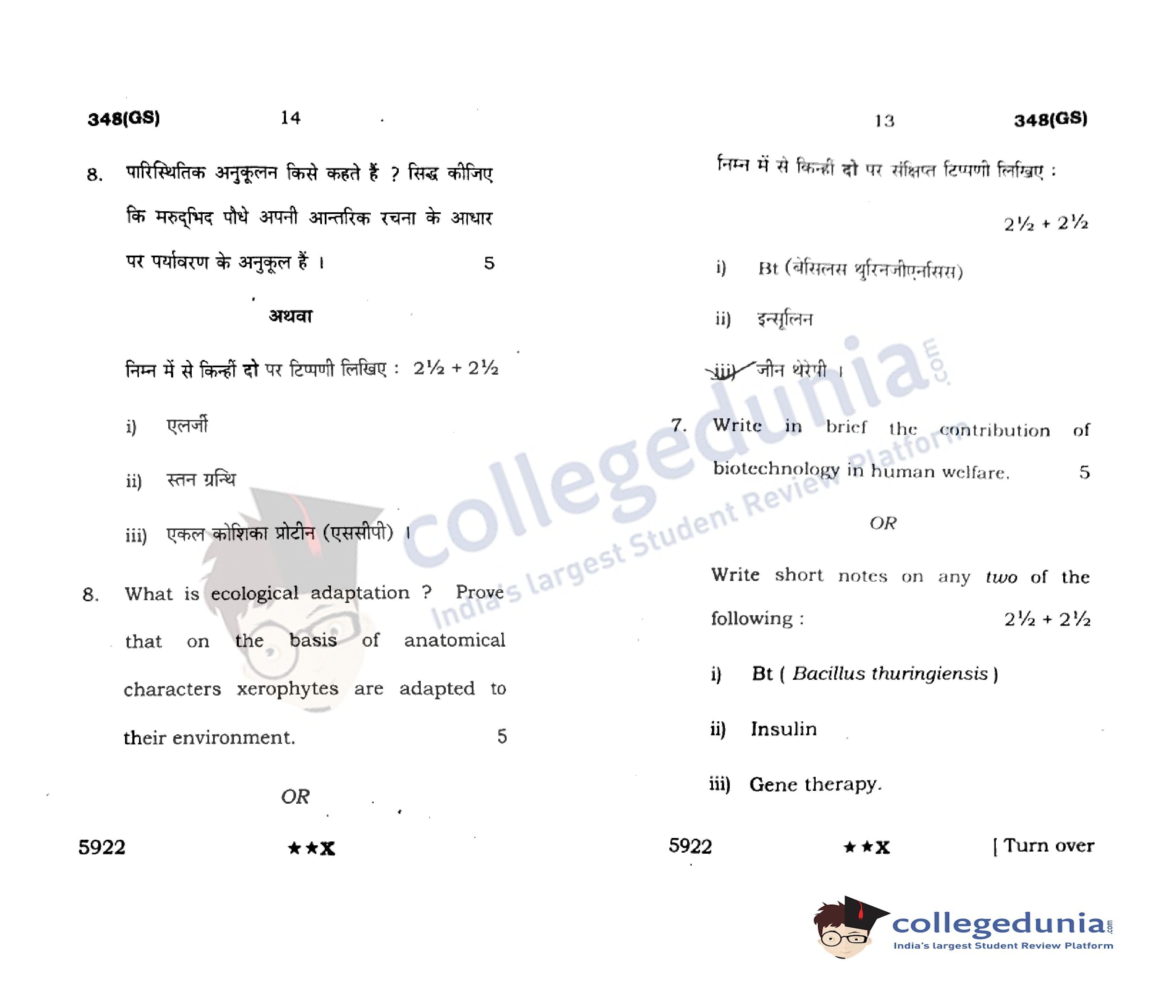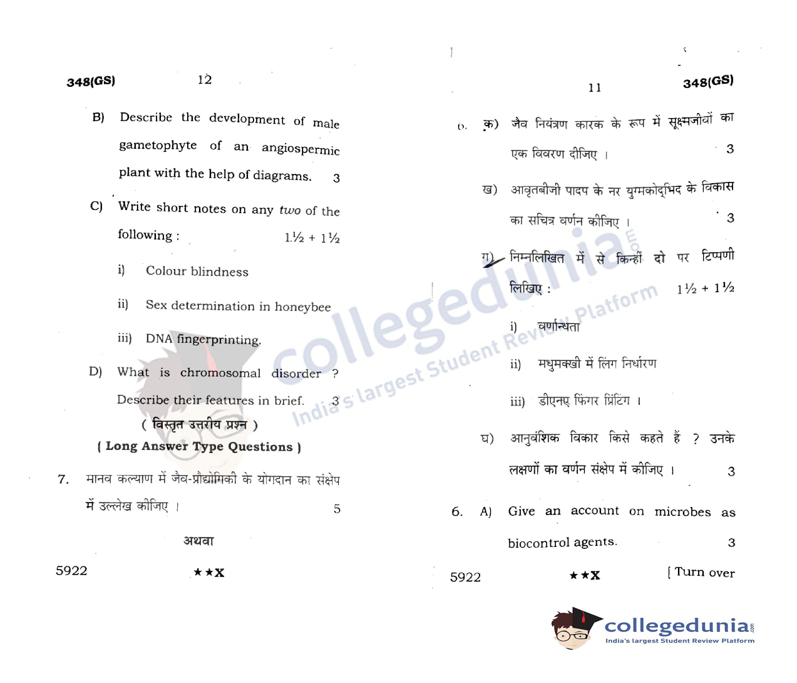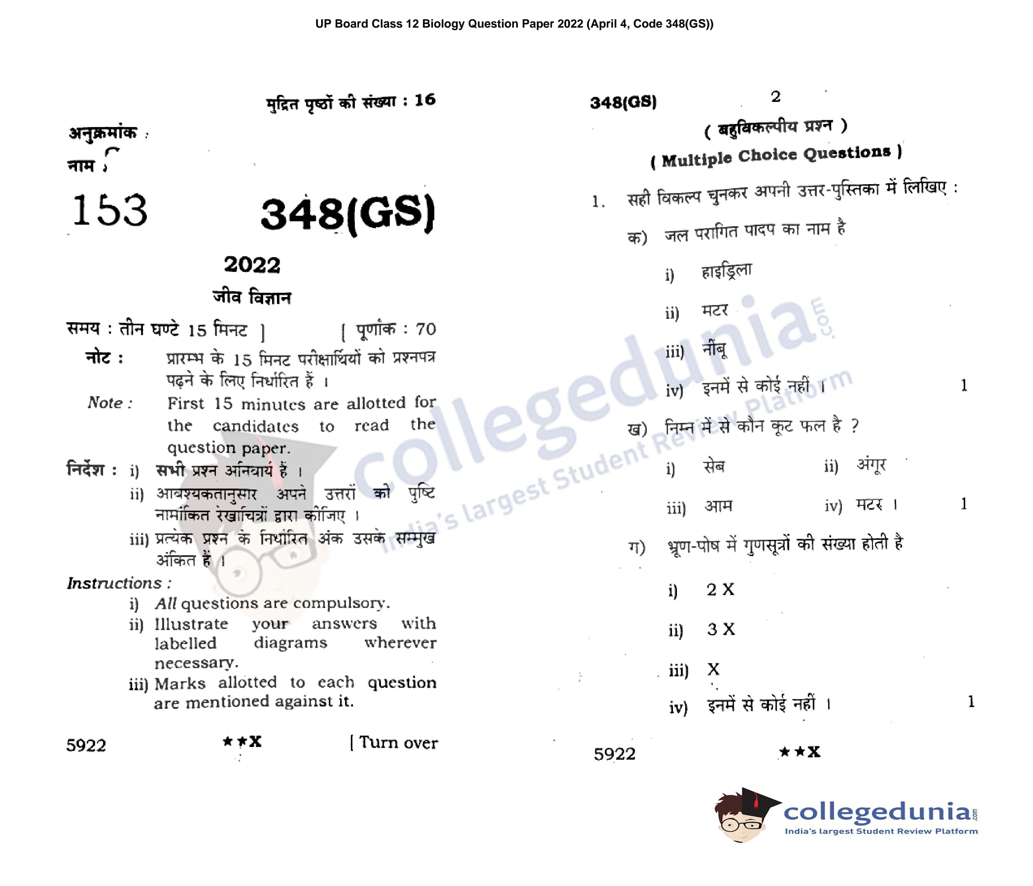 UP Board Class 12 Biology Code 348(GS) Question Paper 2022 with Answer Key (April 4)