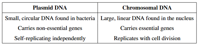 Quick Tip: Remember: Plasmid DNA is extra-chromosomal and circular, while chromosomal DNA carries essential genetic information.