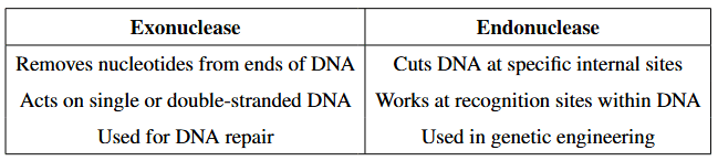 Quick Tip: Remember: Exonuclease removes nucleotides from the ends, while endonuclease cuts within the DNA sequence at specific sites.