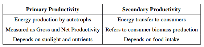 Quick Tip: Remember: Primary productivity = plants (photosynthesis); Secondary productivity = consumers (energy transfer).