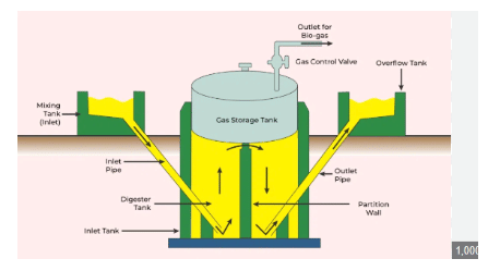 A biogas plant is a system that converts organic waste such as animal dung, plant material, and kitchen waste into biogas through anaerobic digestion. The biogas produced is primarily composed of methane (\ch{CH4) and carbon dioxide (\ch{CO2), which can be used for cooking and electricity generation.