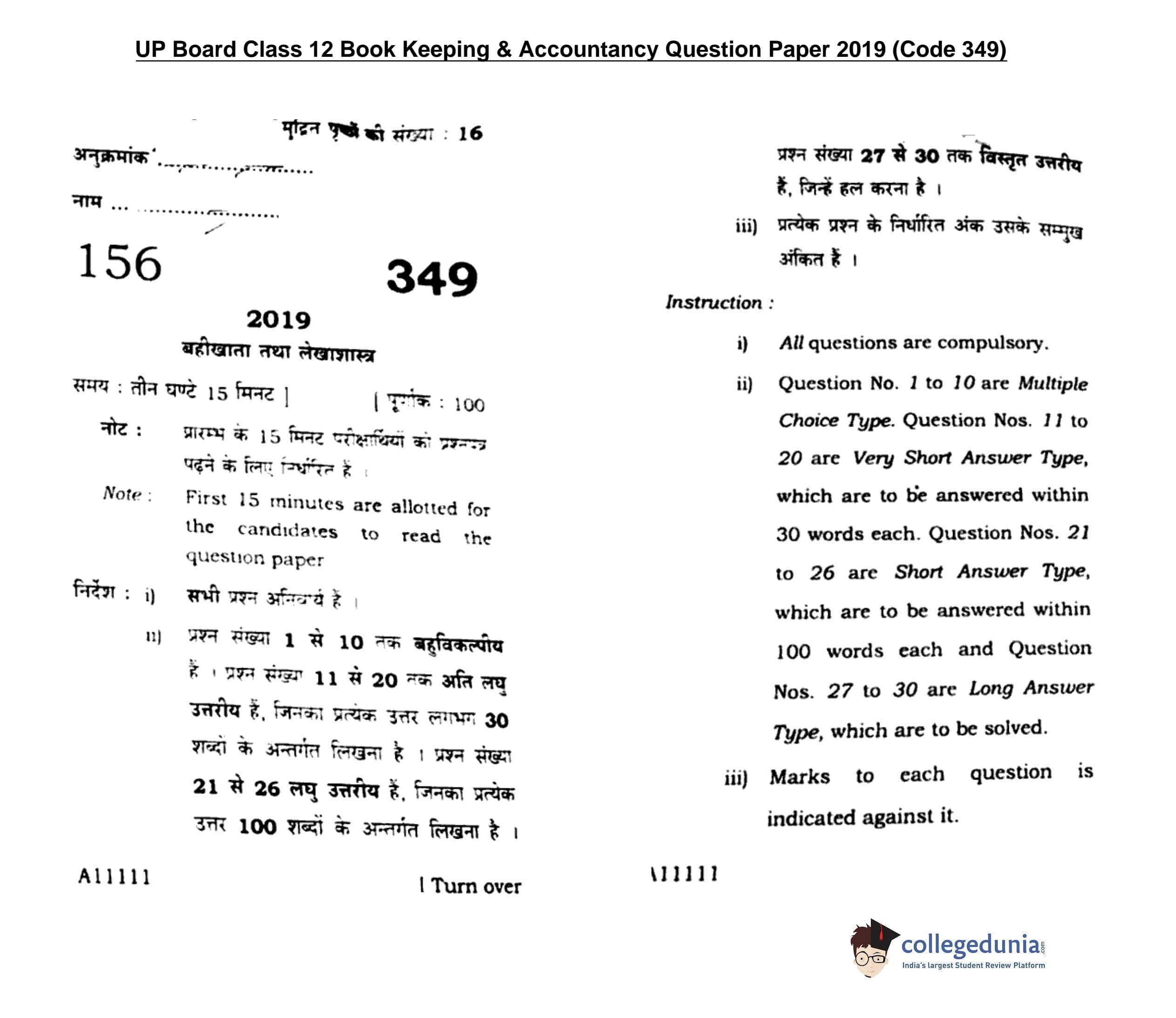 UP Board Class 12 Bookkeeping And Accountancy Question Paper 2019 with Answer Key Code 349 is available for download. The exam was conducted by the Uttar Pradesh Madhyamik Shiksha Parishad (UPMSP) on February 14, 2019 in the Morning Session 8 AM to 11:15 AM. The medium of paper was English and Hindi. The question paper comprised a total of 30 questions.