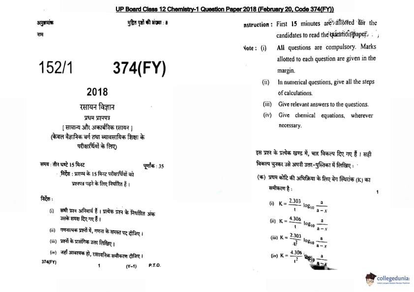 UP Board Class 12 Chemistry-1 Code 374(FY) Question Paper 2018 with Answer Key (February 20)