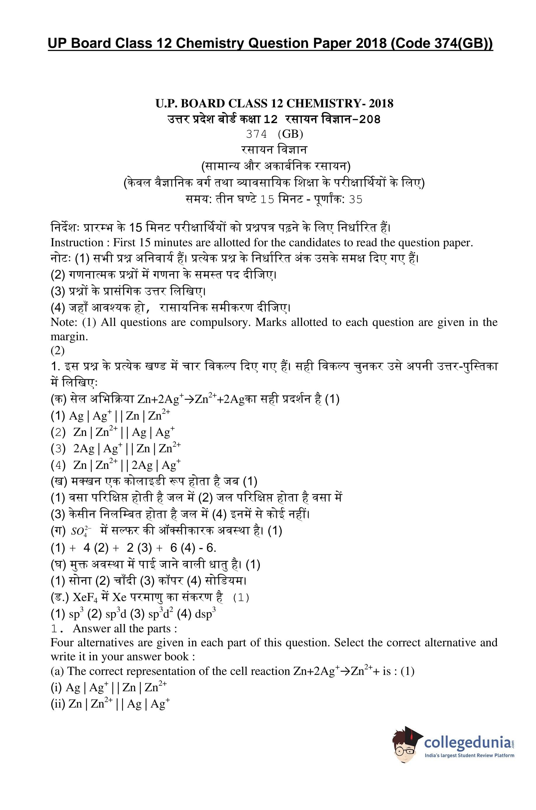 UP Board Class 12 Chemistry-1 Question Paper 2018 with Answer Key Code 374(GB) is available for download. The exam was conducted by the Uttar Pradesh Madhyamik Shiksha Parishad (UPMSP) on February 20, 2018 in the Afternoon Session 2 PM to 5:15 PM. The medium of paper was English and Hindi. The question paper comprised a total of 7 questions.