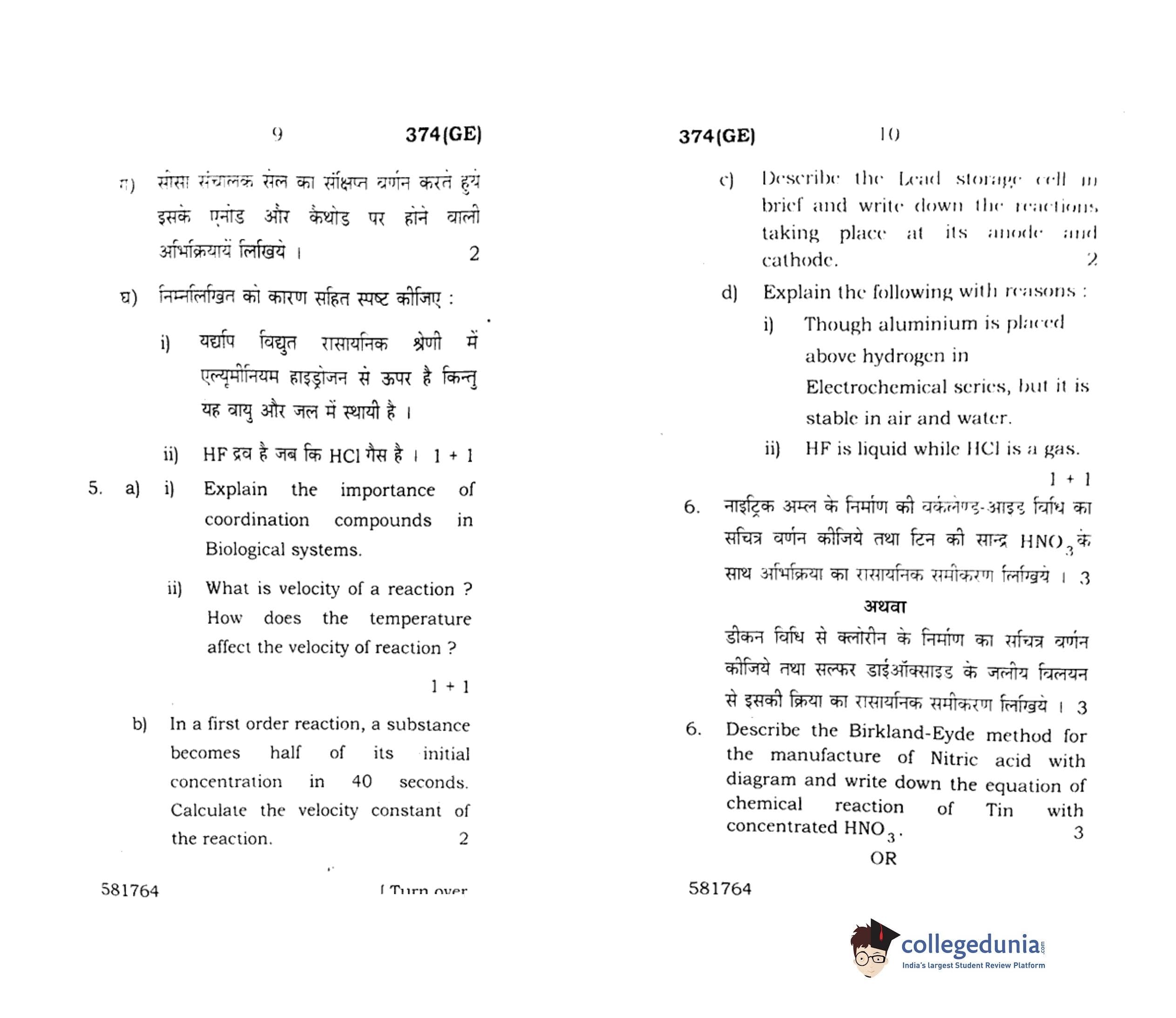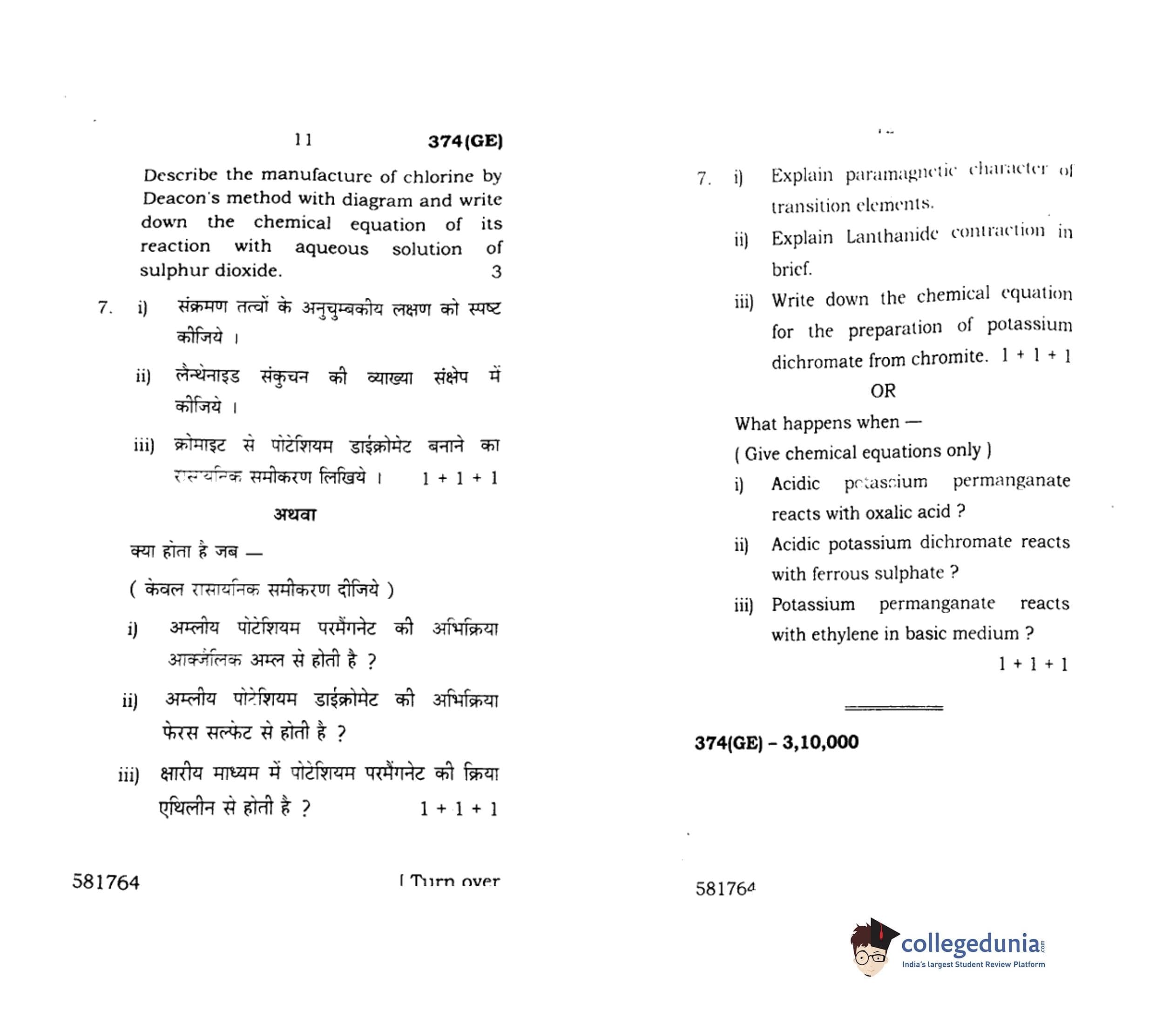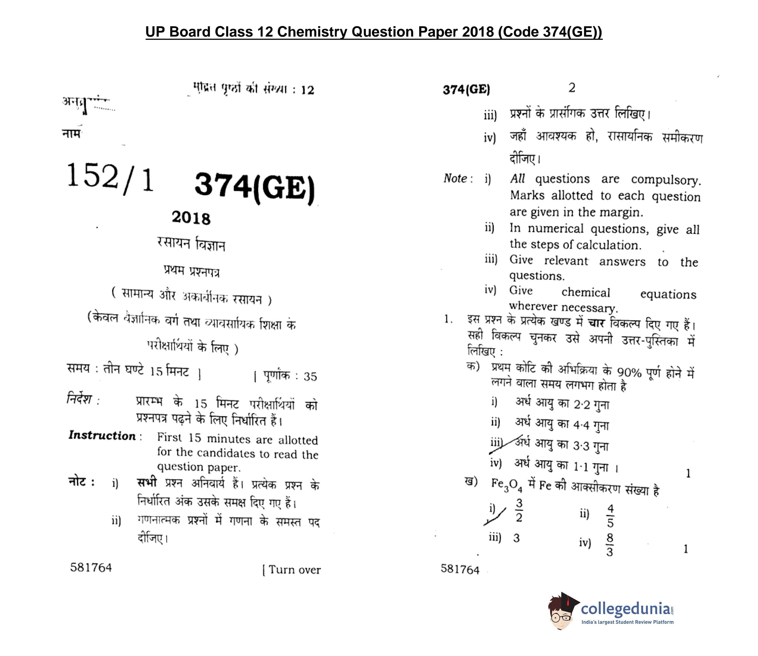 UP Board Class 12 Chemistry-1 Question Paper 2018 with Answer Key Code 374(GE) is available for download. The exam was conducted by the Uttar Pradesh Madhyamik Shiksha Parishad (UPMSP) on February 20, 2018 in the Afternoon Session 2 PM to 5:15 PM. The medium of paper was English and Hindi. The question paper comprised a total of 7 questions.
