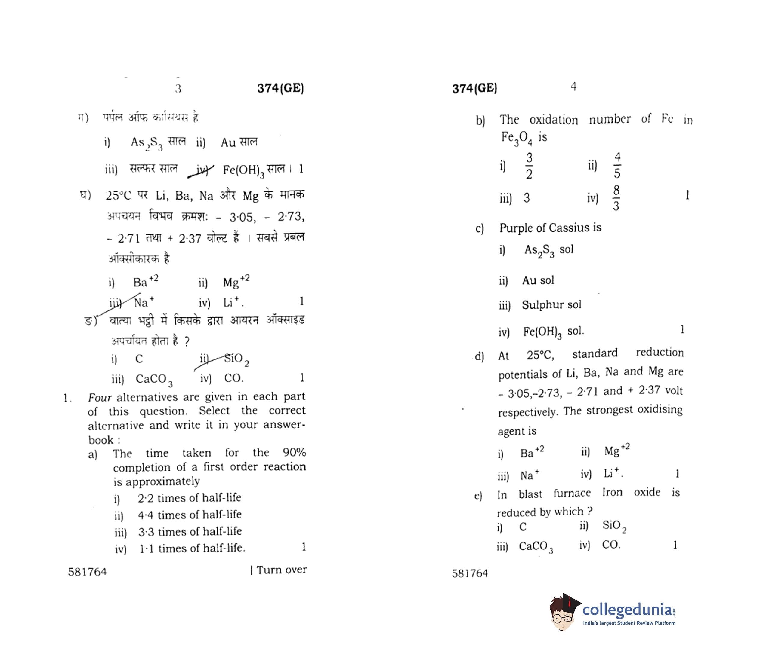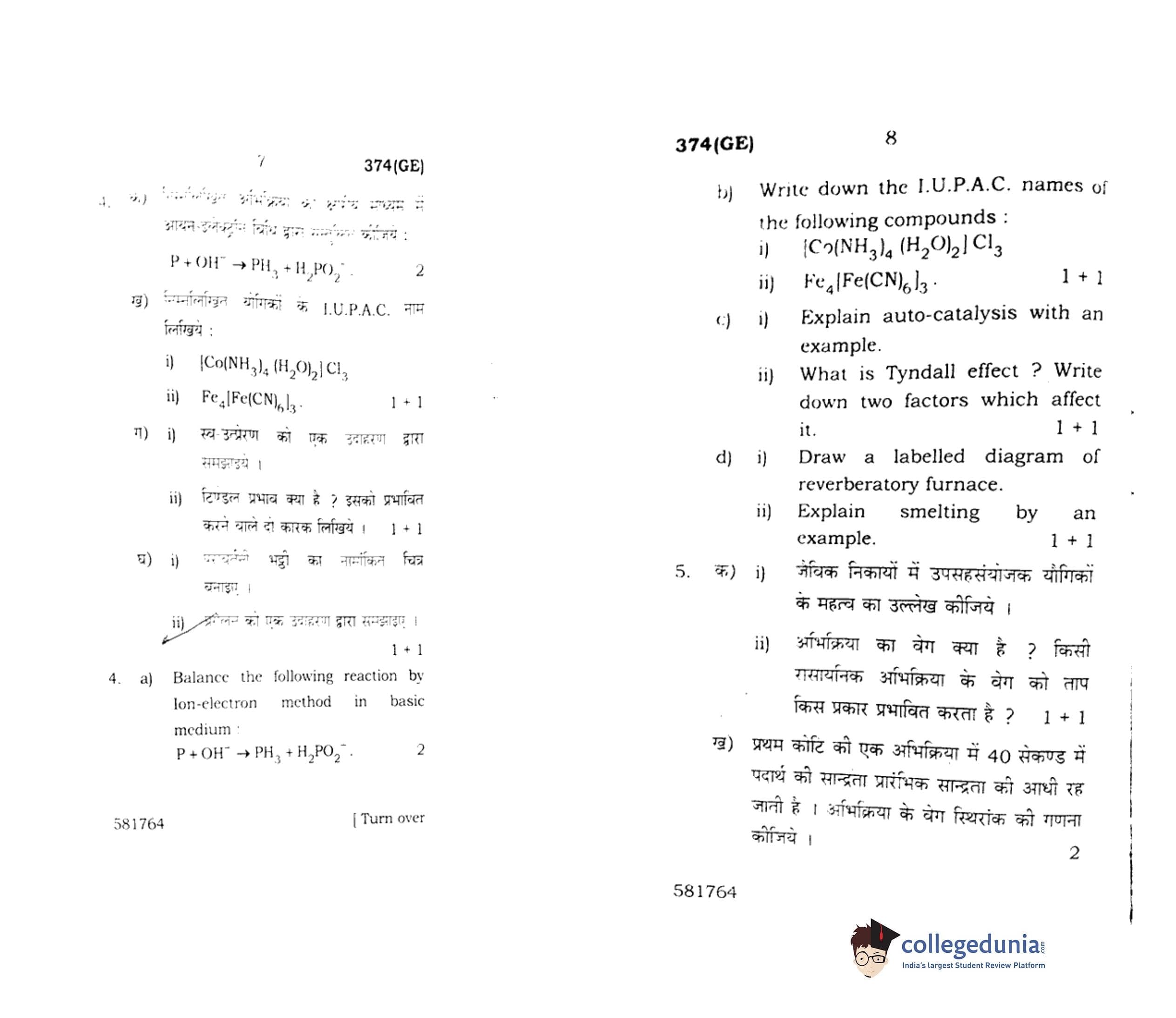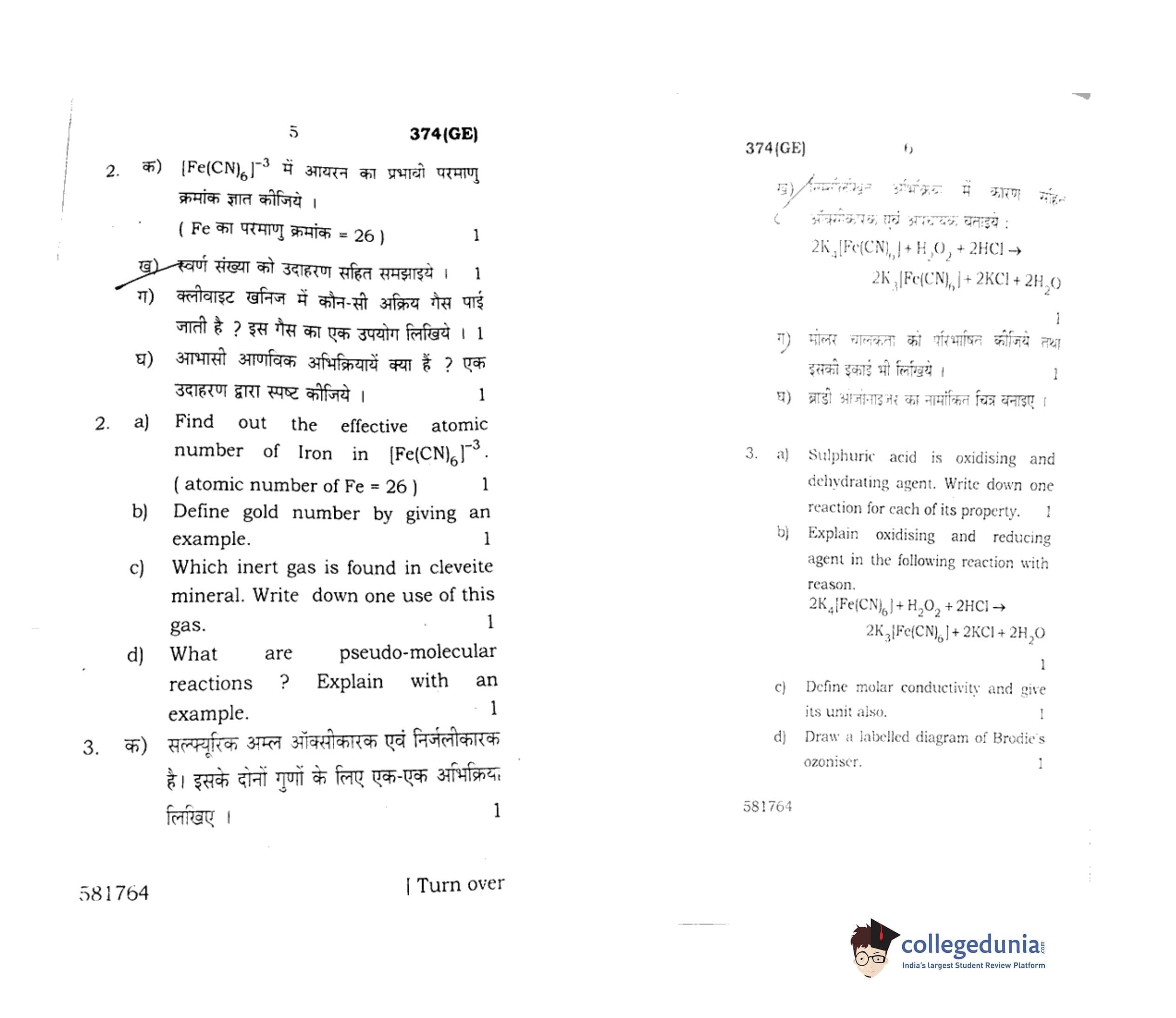 UP Board Class 12 Chemistry-1 Question Paper 2018 with Answer Key Code 374(GE) is available for download. The exam was conducted by the Uttar Pradesh Madhyamik Shiksha Parishad (UPMSP) on February 20, 2018 in the Afternoon Session 2 PM to 5:15 PM. The medium of paper was English and Hindi. The question paper comprised a total of 7 questions.