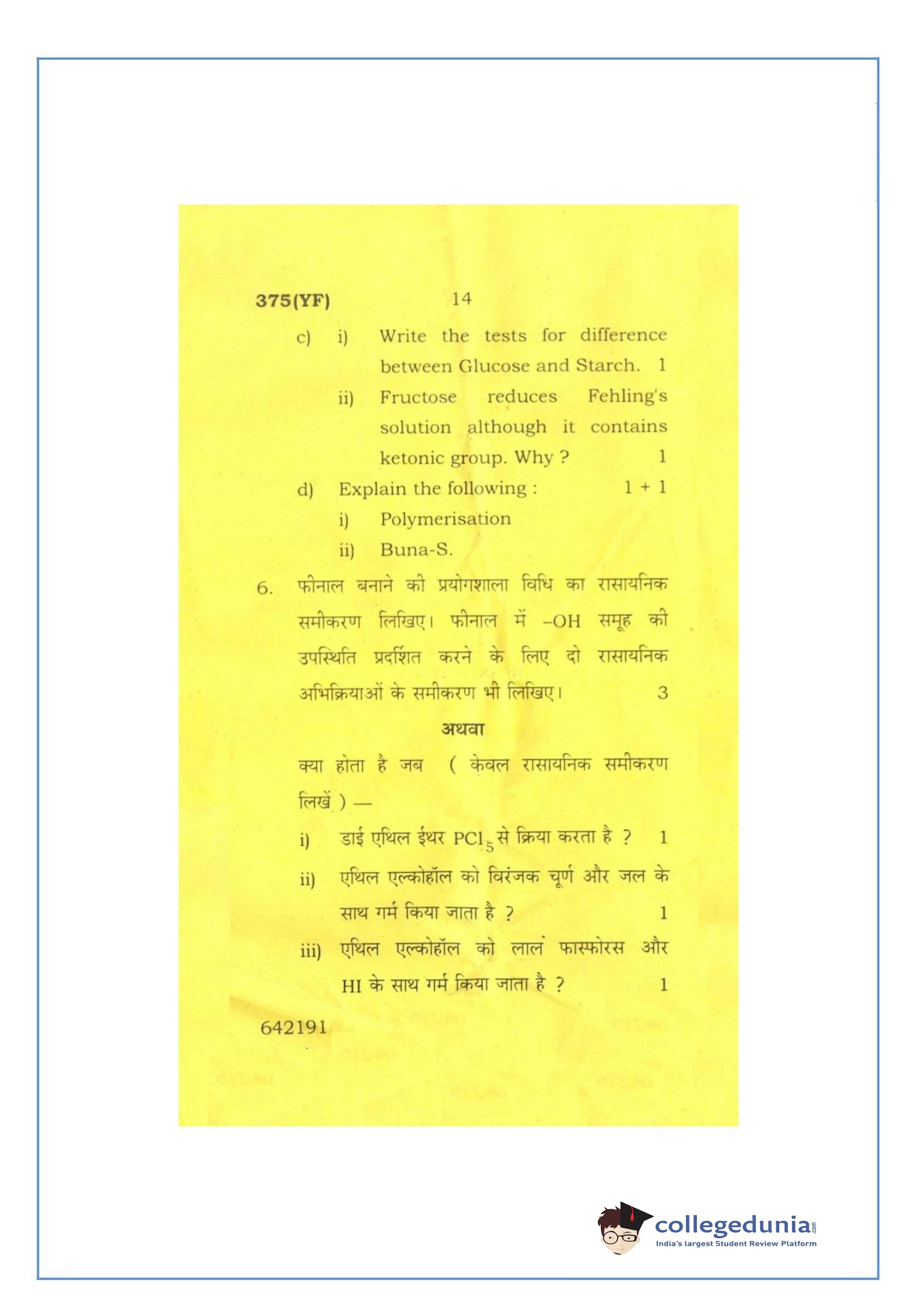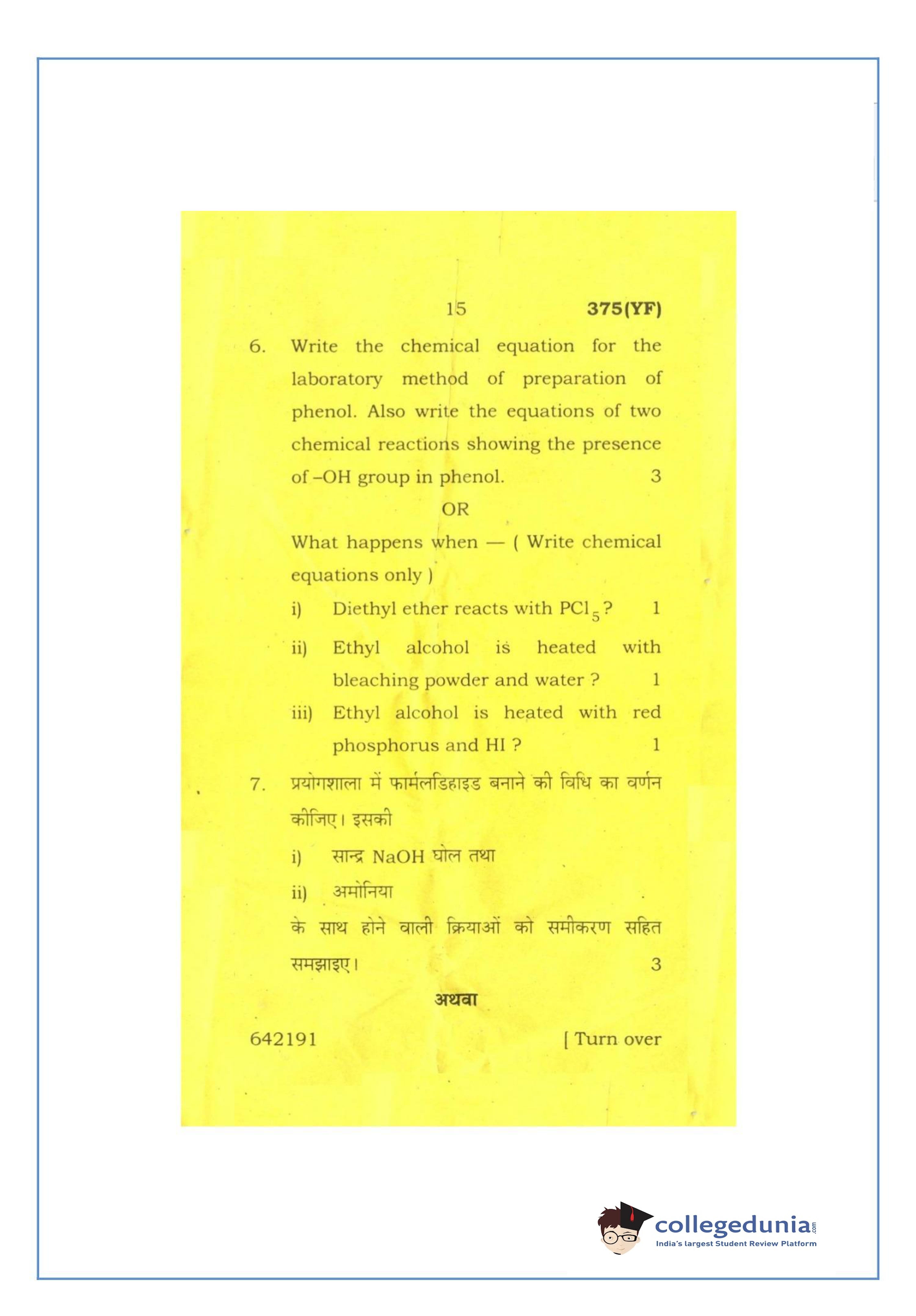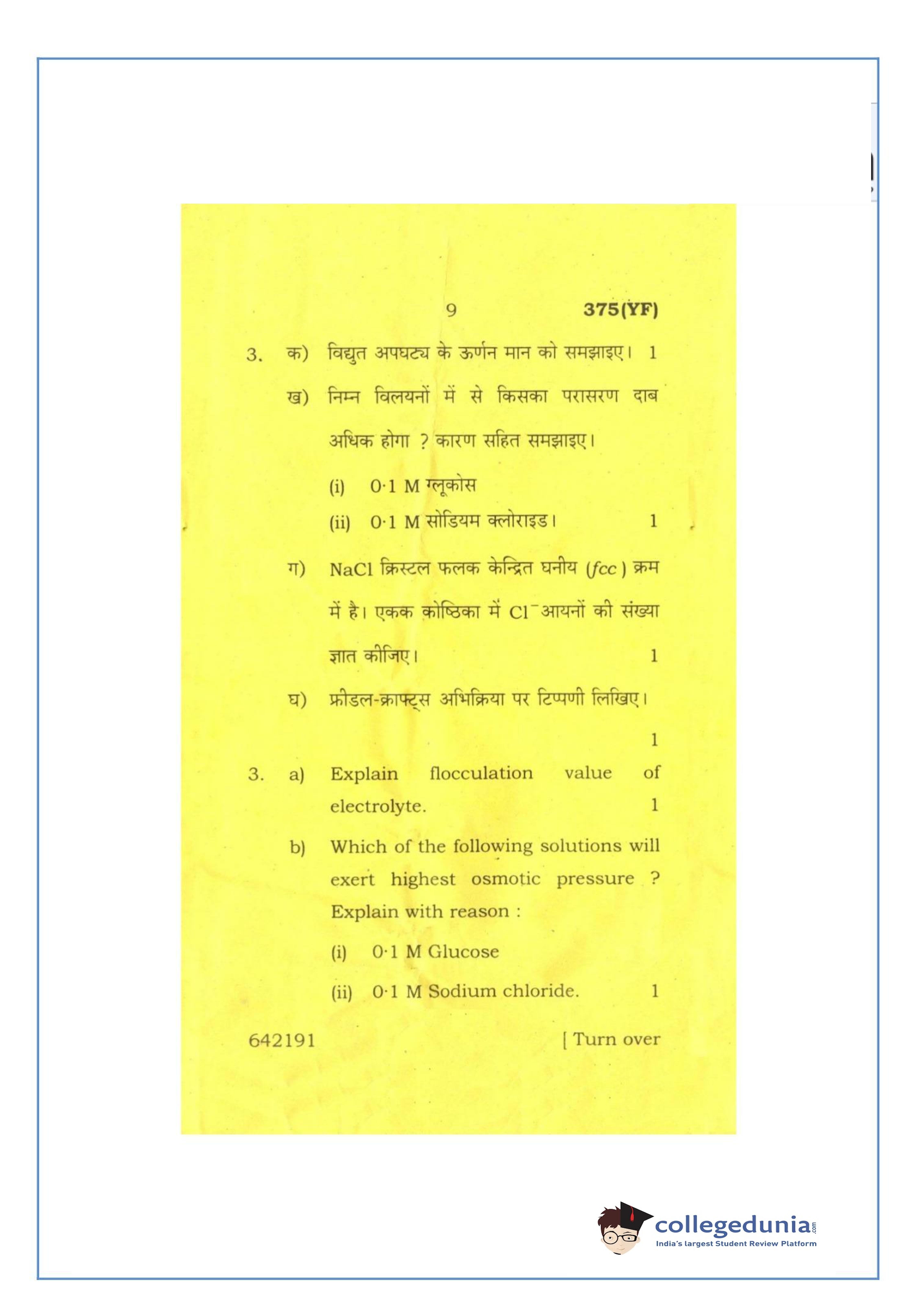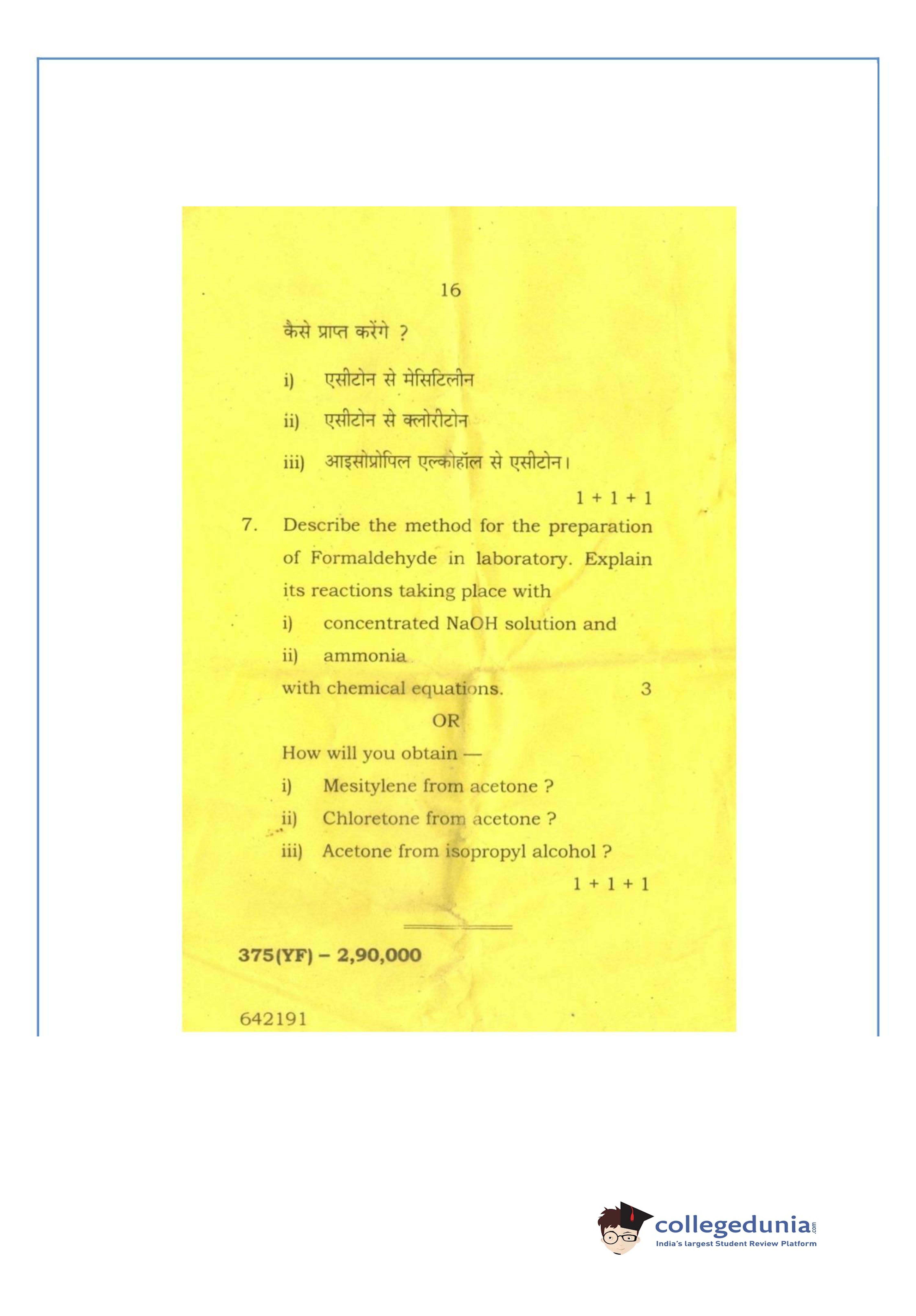 UP Board Class 12 Chemistry-2 Question Paper 2016 with Answer Key Code 375(YF) is available for download. The exam was conducted by the Uttar Pradesh Madhyamik Shiksha Parishad (UPMSP) on March 2, 2016 in the Afternoon Session 2 PM to 5:15 PM. The medium of paper was English and Hindi. The question paper comprised a total of 7 questions.