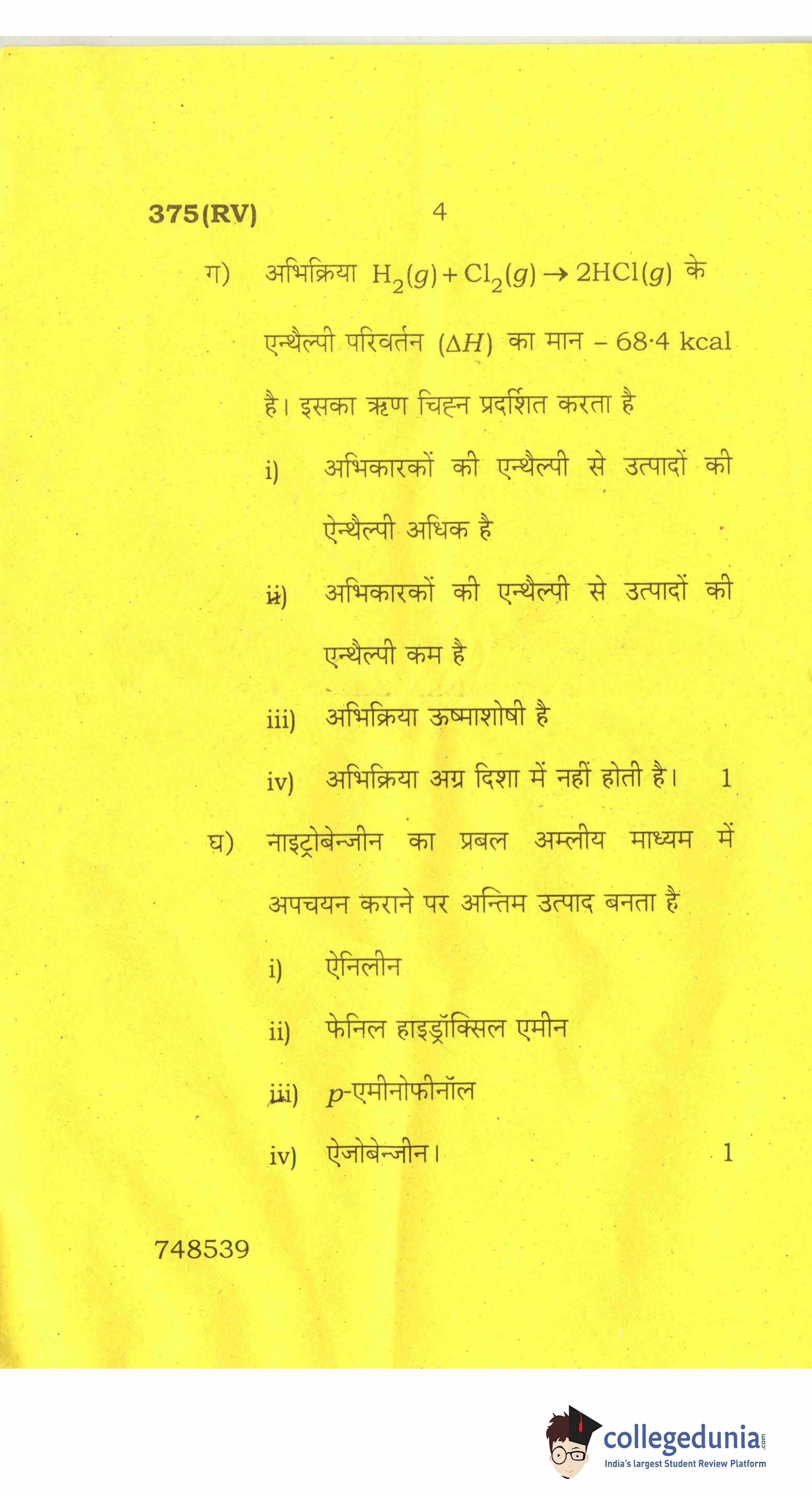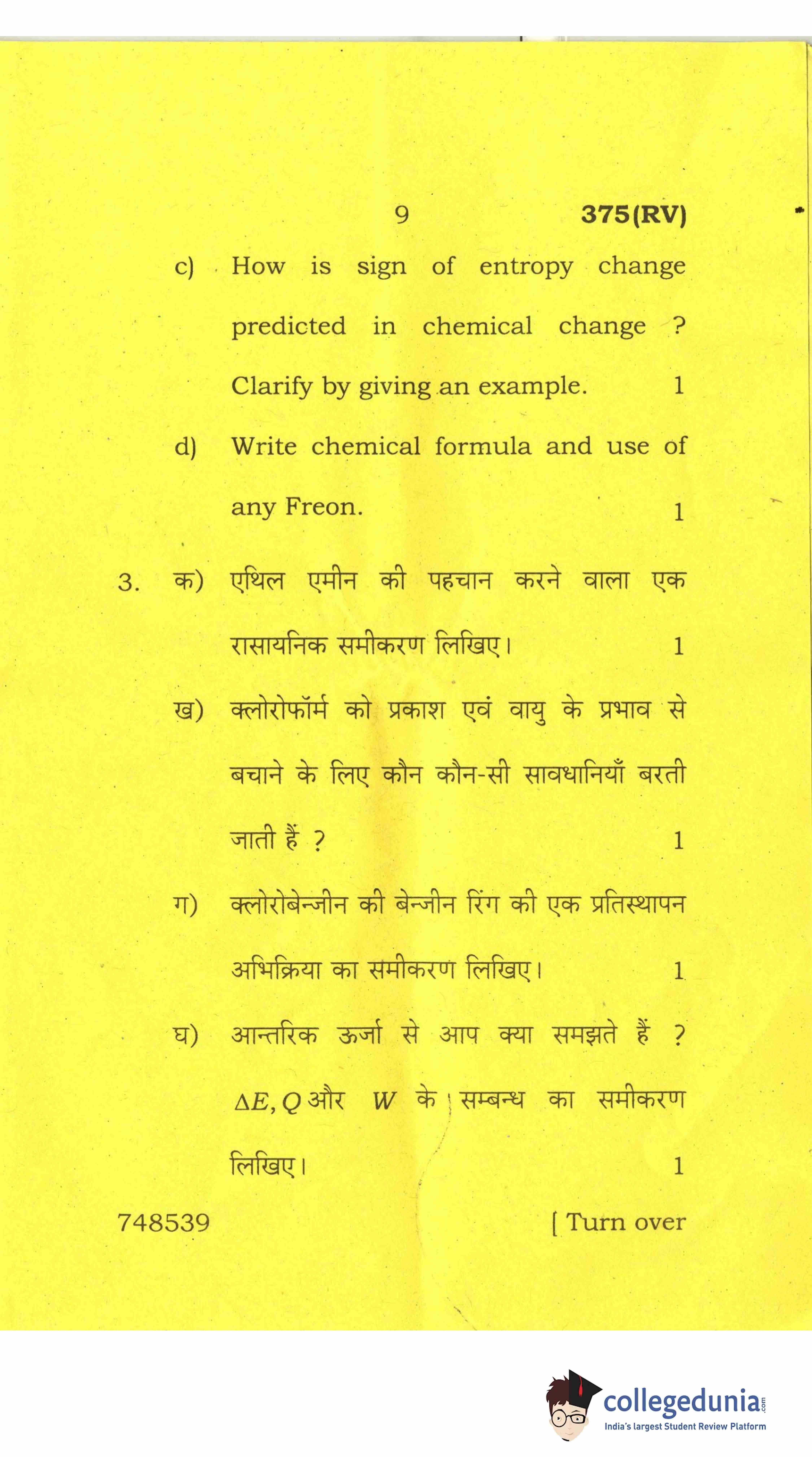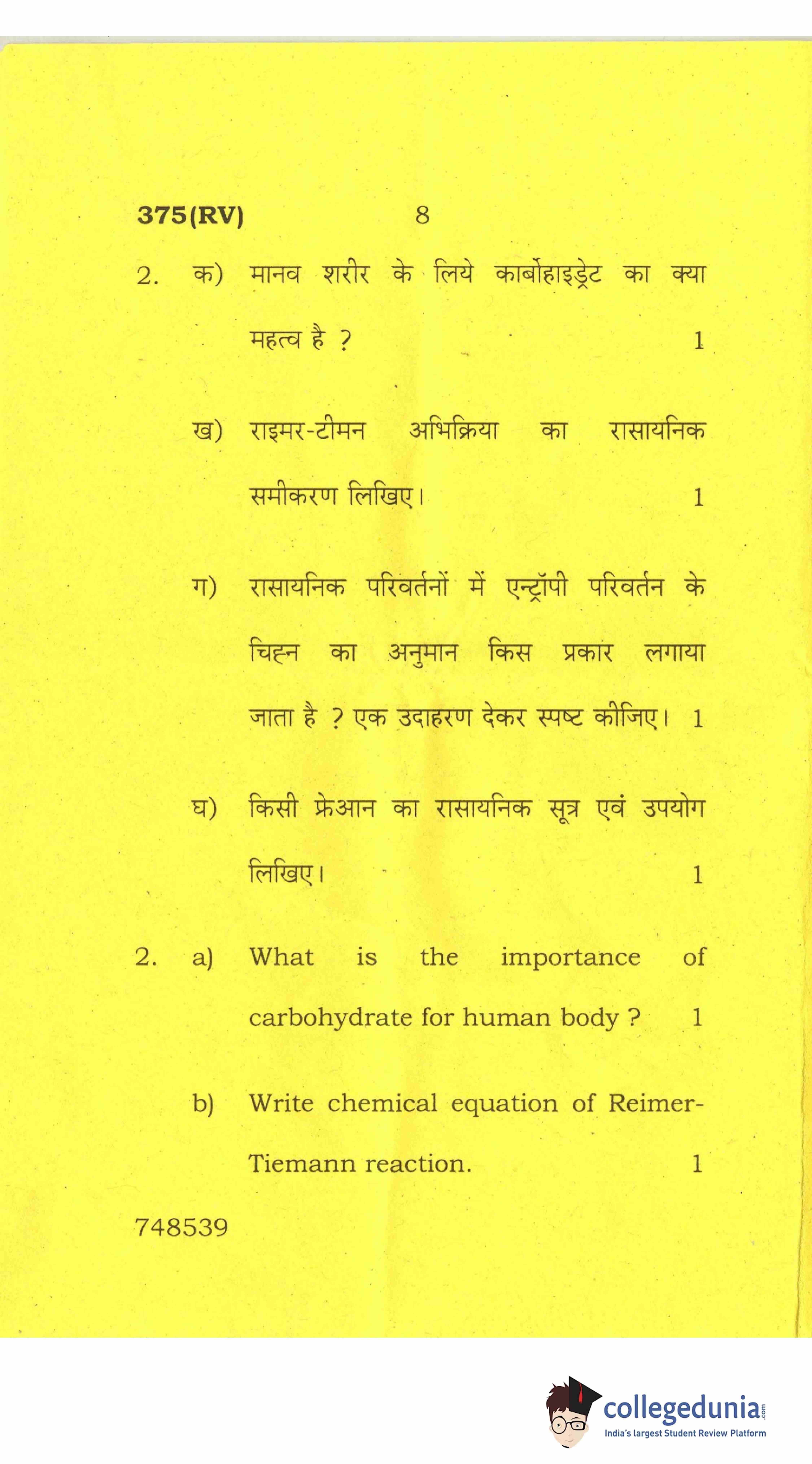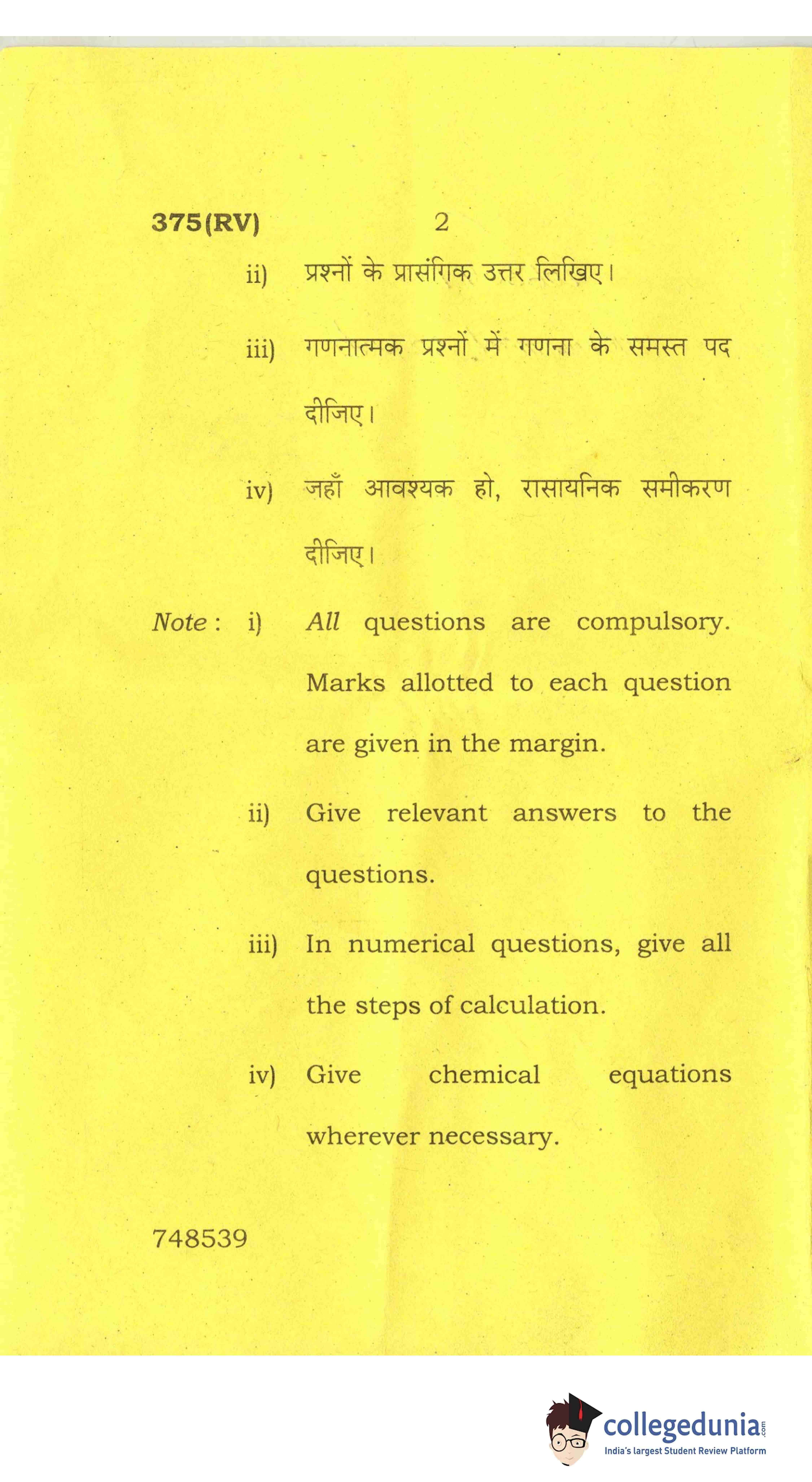 UP Board Class 12 Chemistry-2 Question Paper 2017 with Answer Key Code 375(RV) is available for download. The exam was conducted by the Uttar Pradesh Madhyamik Shiksha Parishad (UPMSP) on March 28, 2017 in the Afternoon Session 2 PM to 5:15 PM. The medium of paper was English and Hindi. The question paper comprised a total of 7 questions.