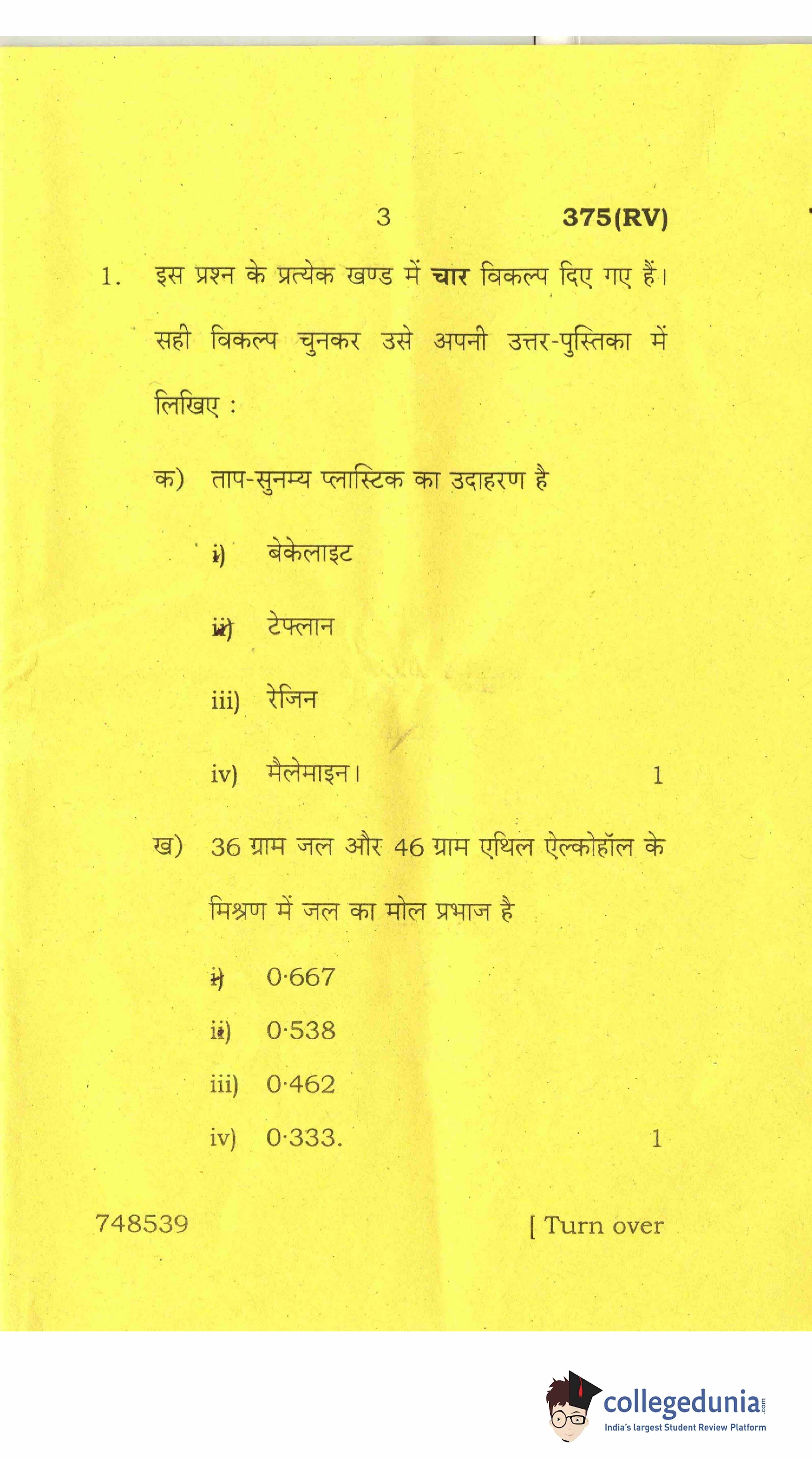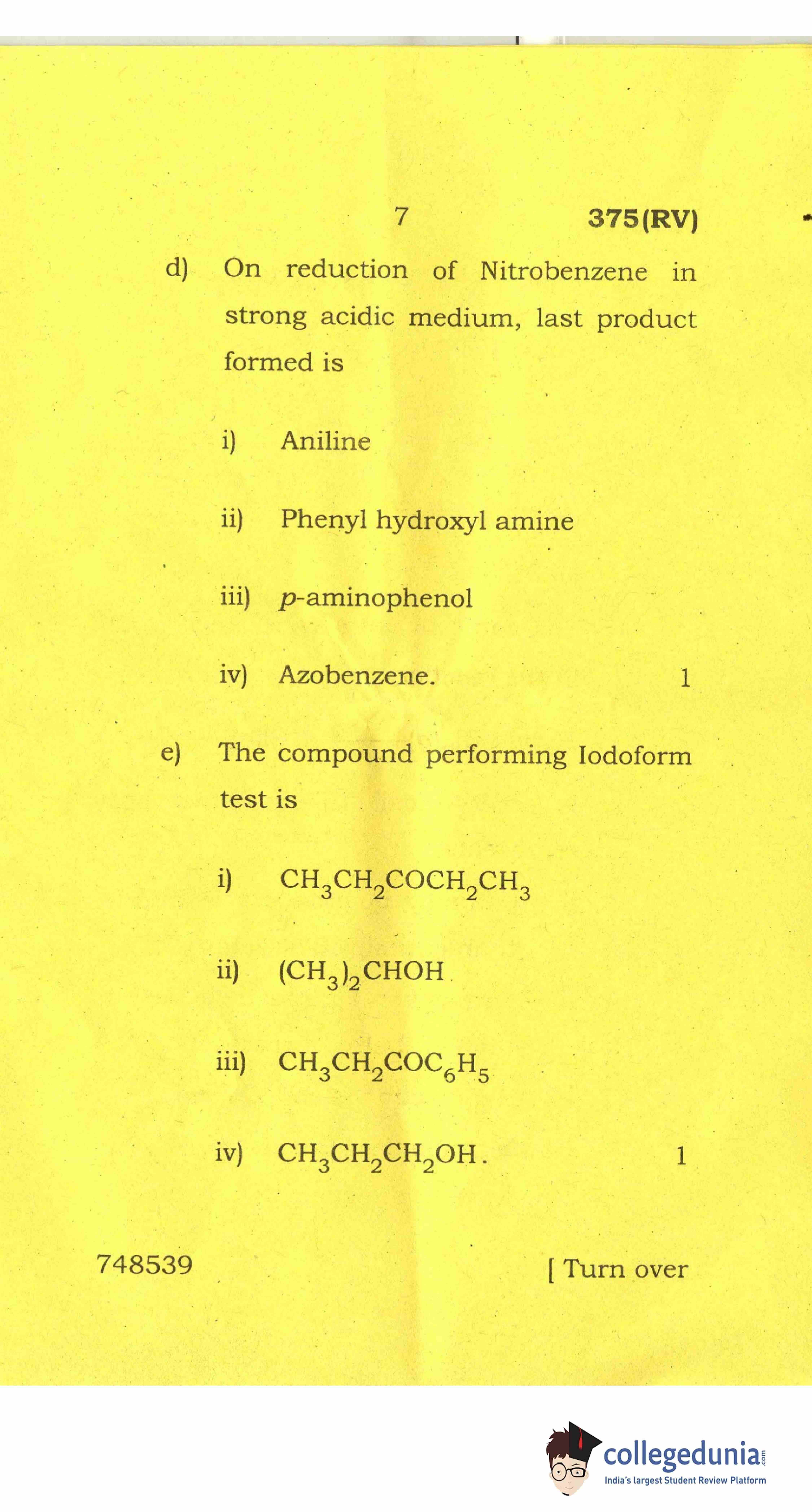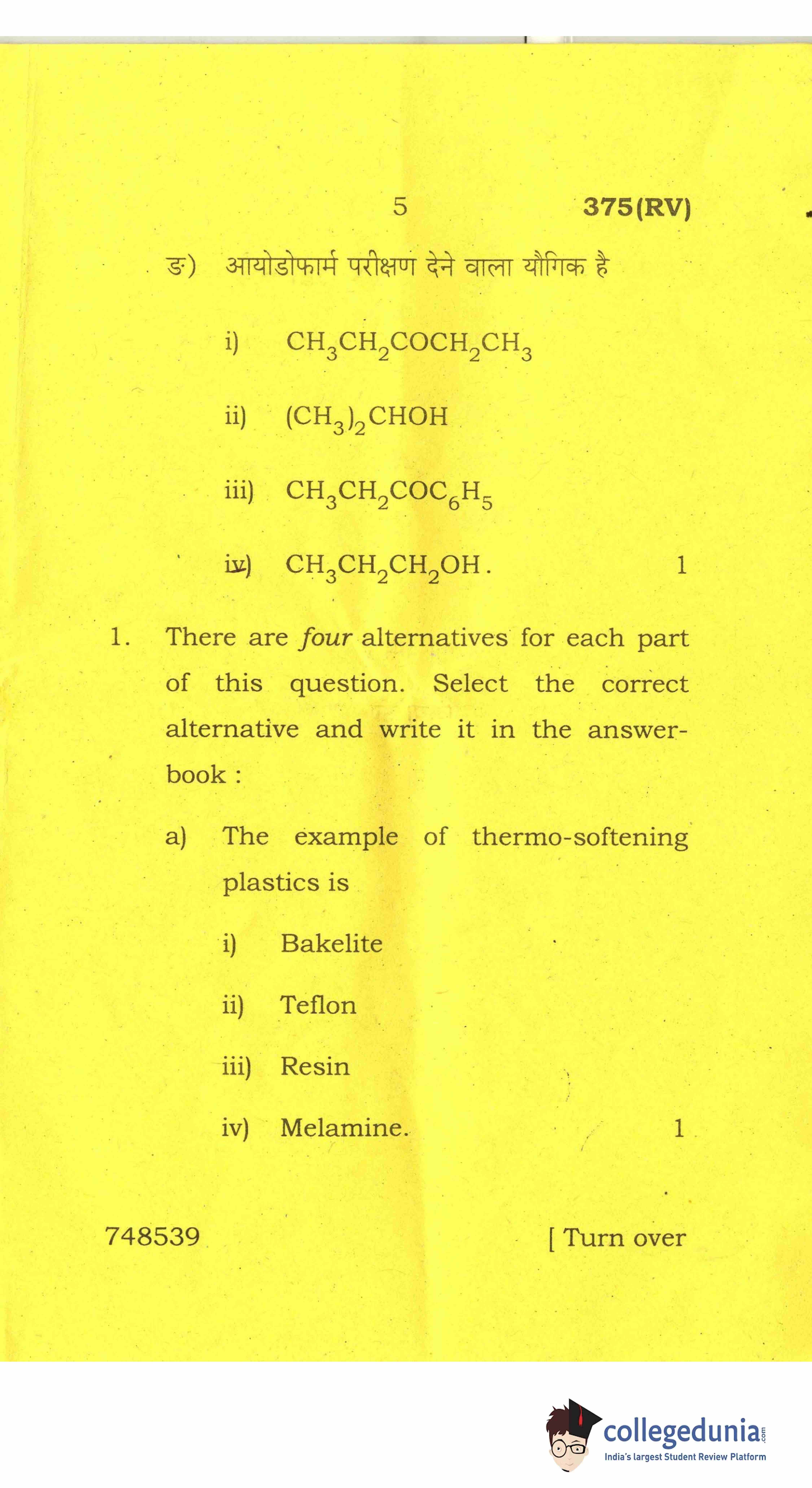 UP Board Class 12 Chemistry-2 Code 375(RV) Question Paper 2017 with Answer Key (March 28)