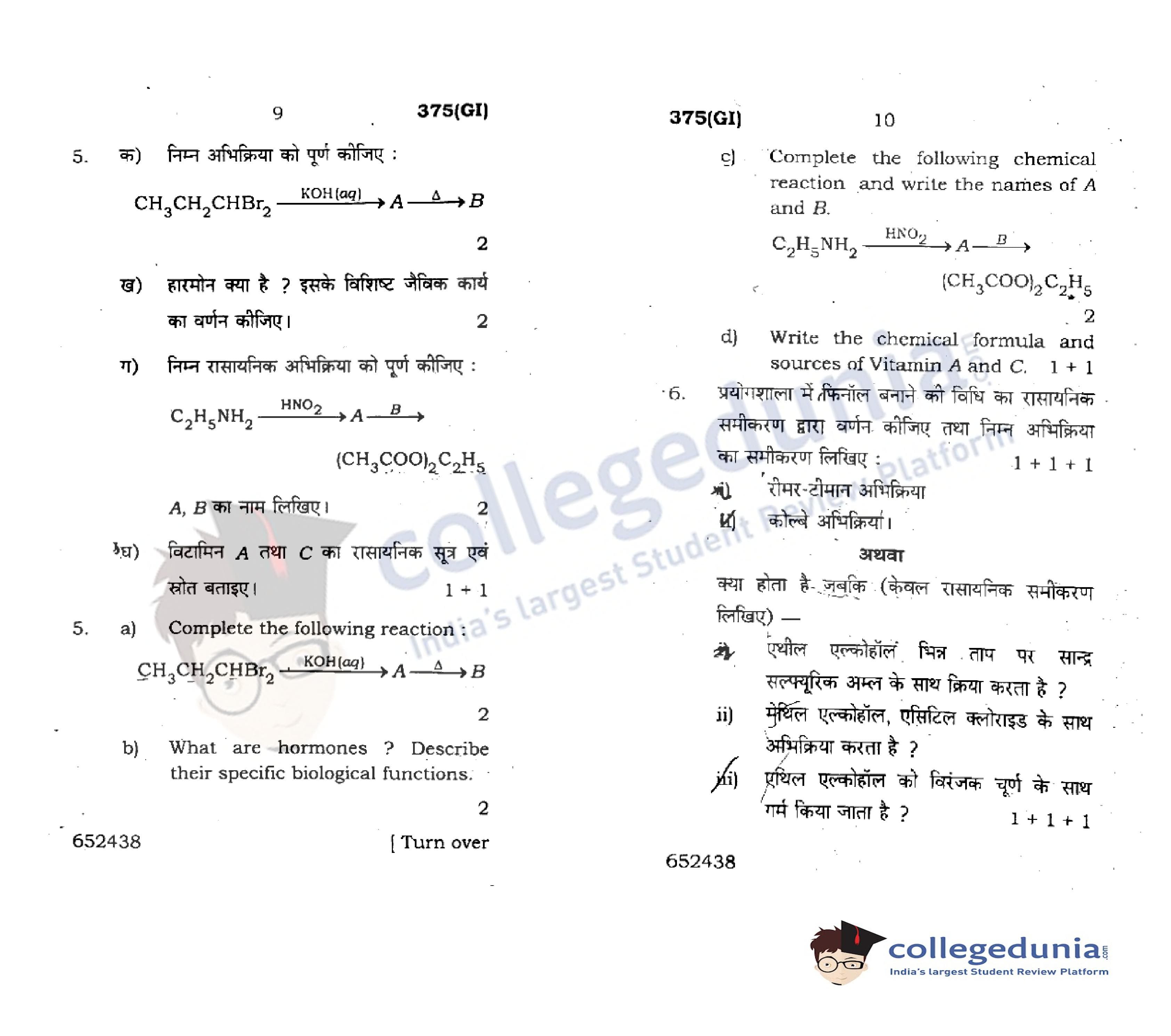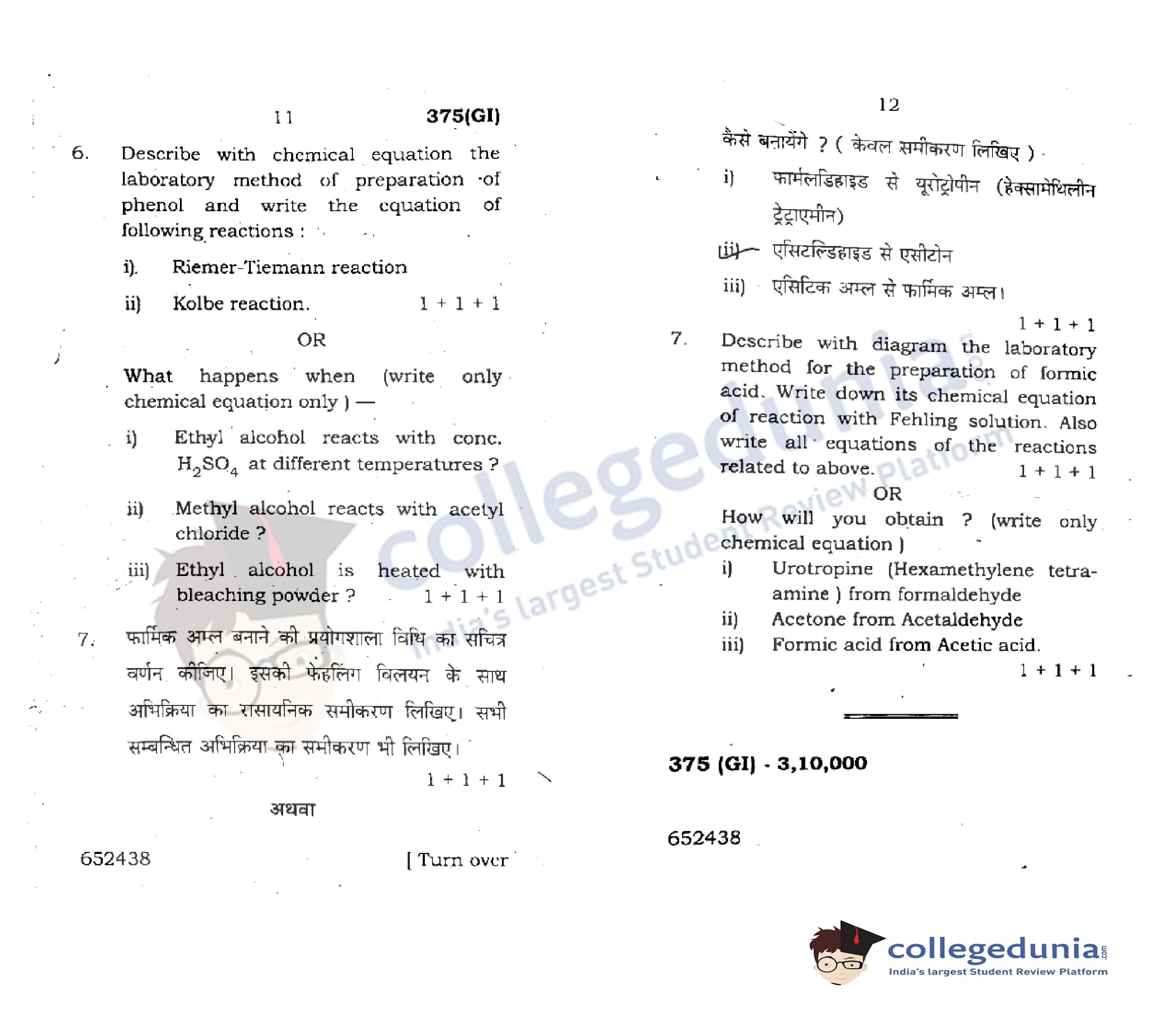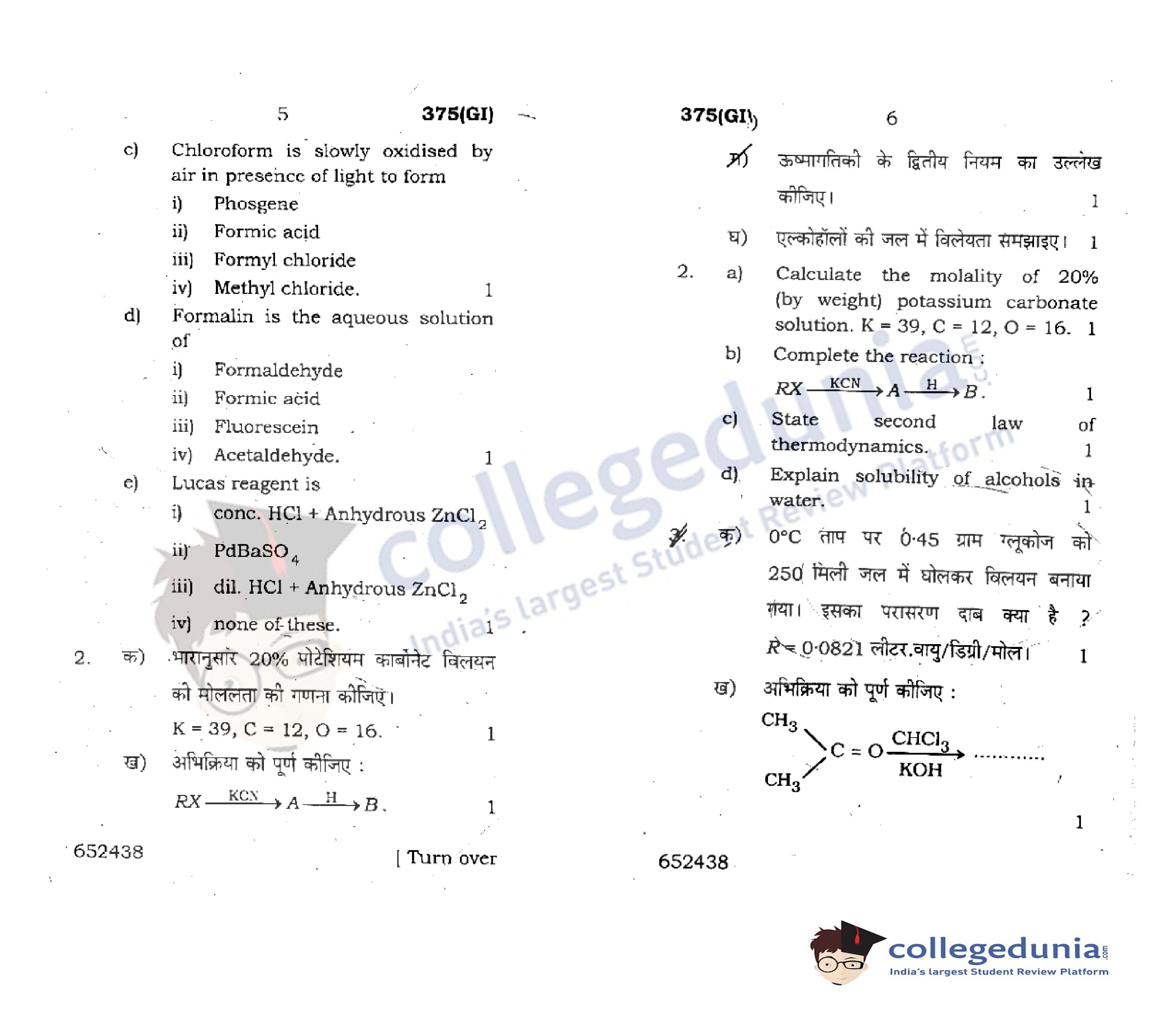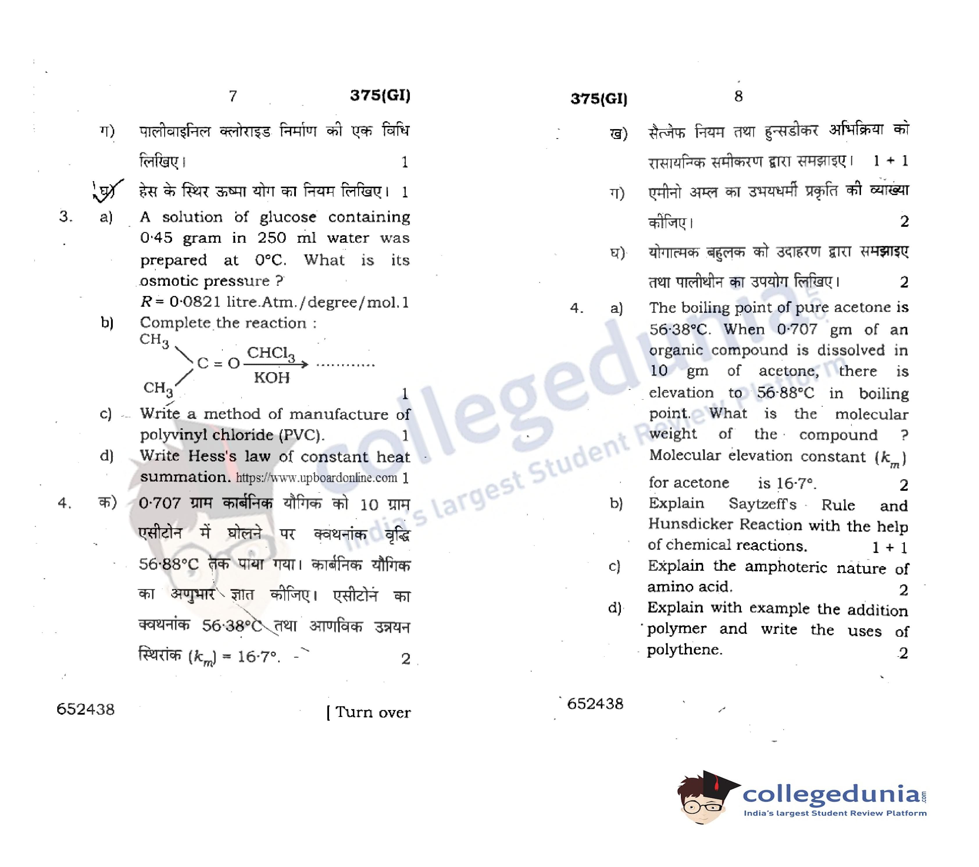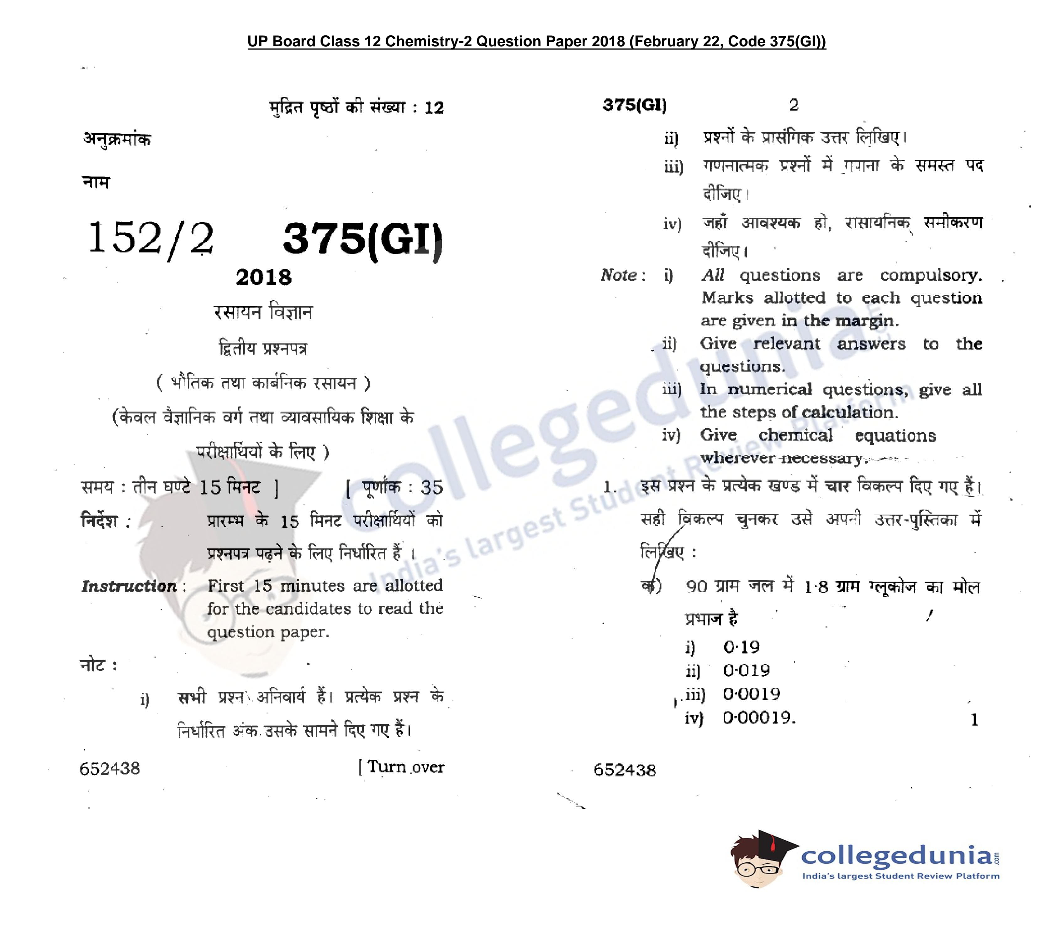 UP Board Class 12 Chemistry-2 Code 375(GI) Question Paper 2018 with Answer Key (February 22)