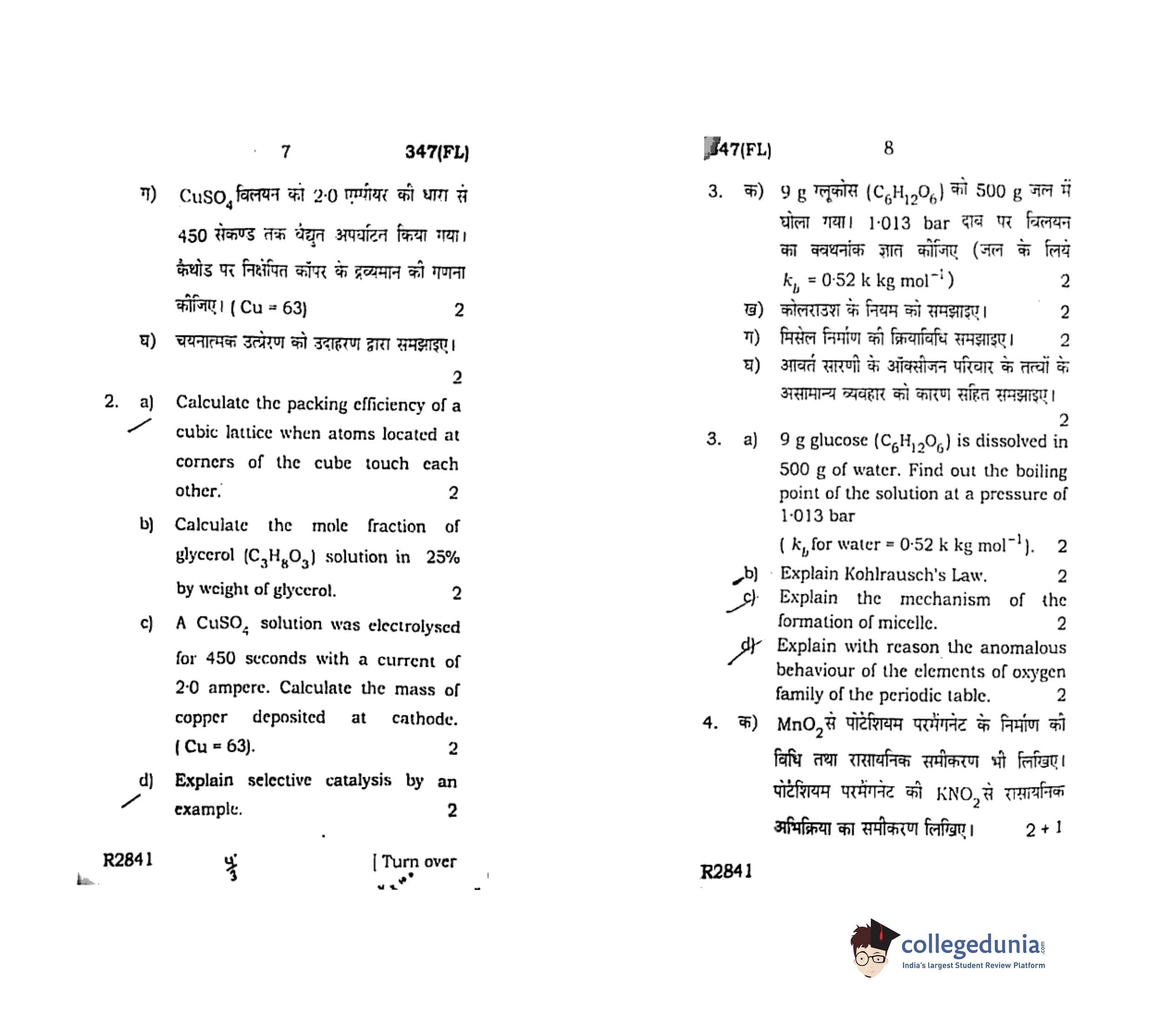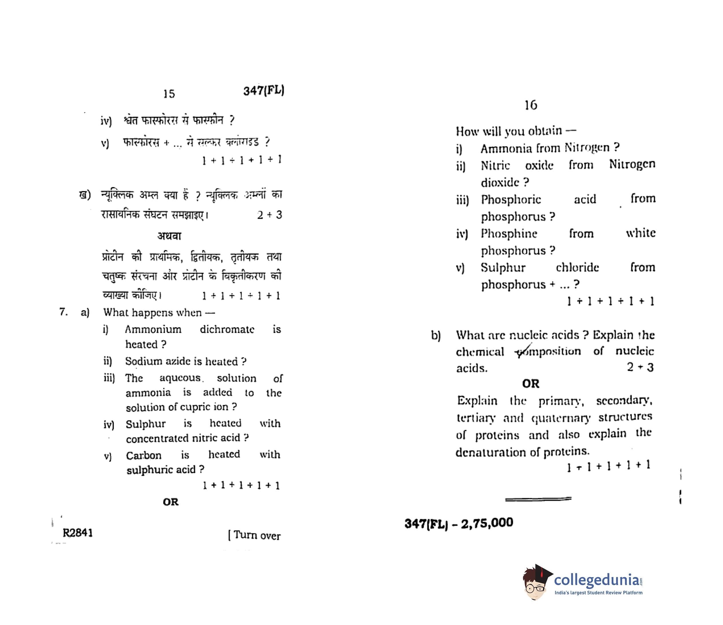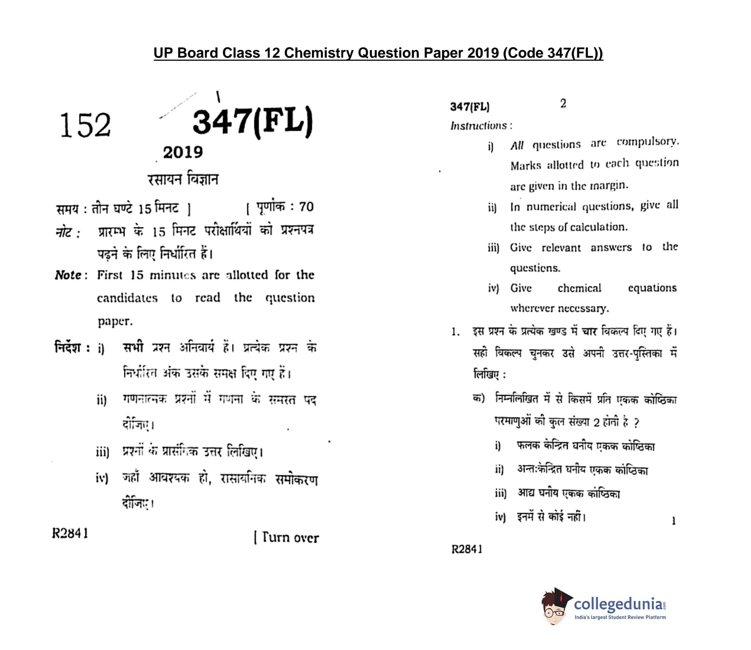 UP Board Class 12 Chemistry Question Paper 2019 with Answer Key Code 347(FL) is available for download. The exam was conducted by the Uttar Pradesh Madhyamik Shiksha Parishad (UPMSP) on February 15, 2019 in the Afternoon Session 2 PM to 5:15 PM. The medium of paper was English and Hindi. The question paper comprised a total of 7 questions.