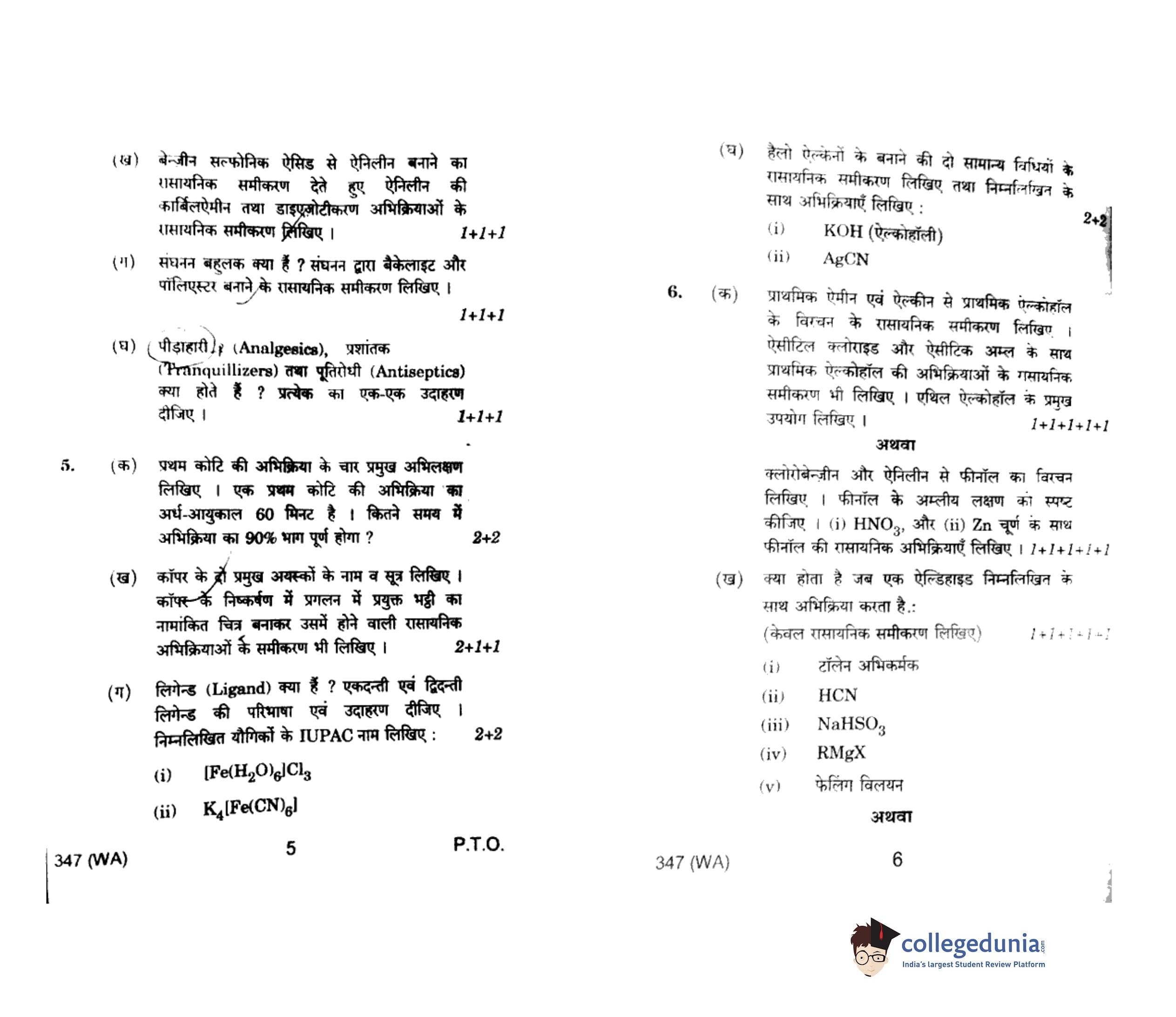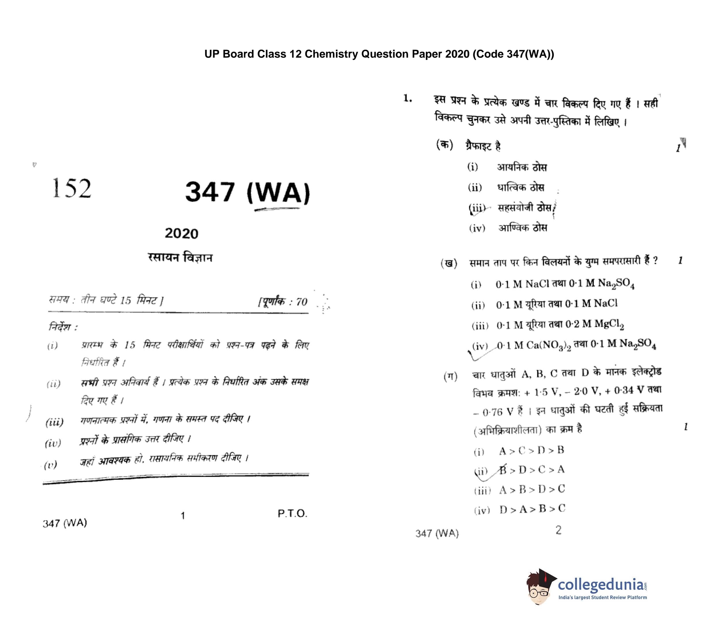 UP Board Class 12 Chemistry Code 347(WA) Question Paper 2020 with Answer Key (February 24)