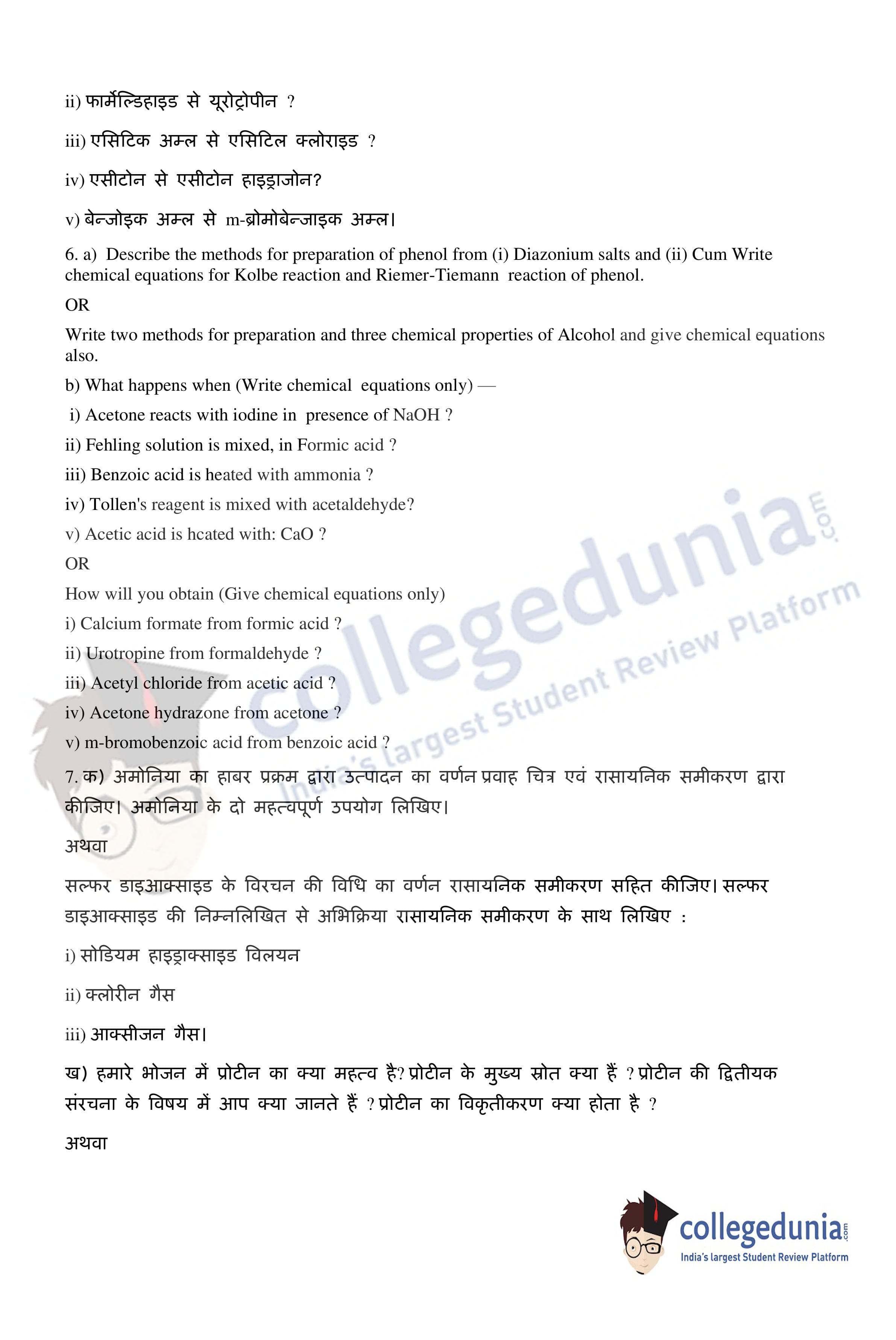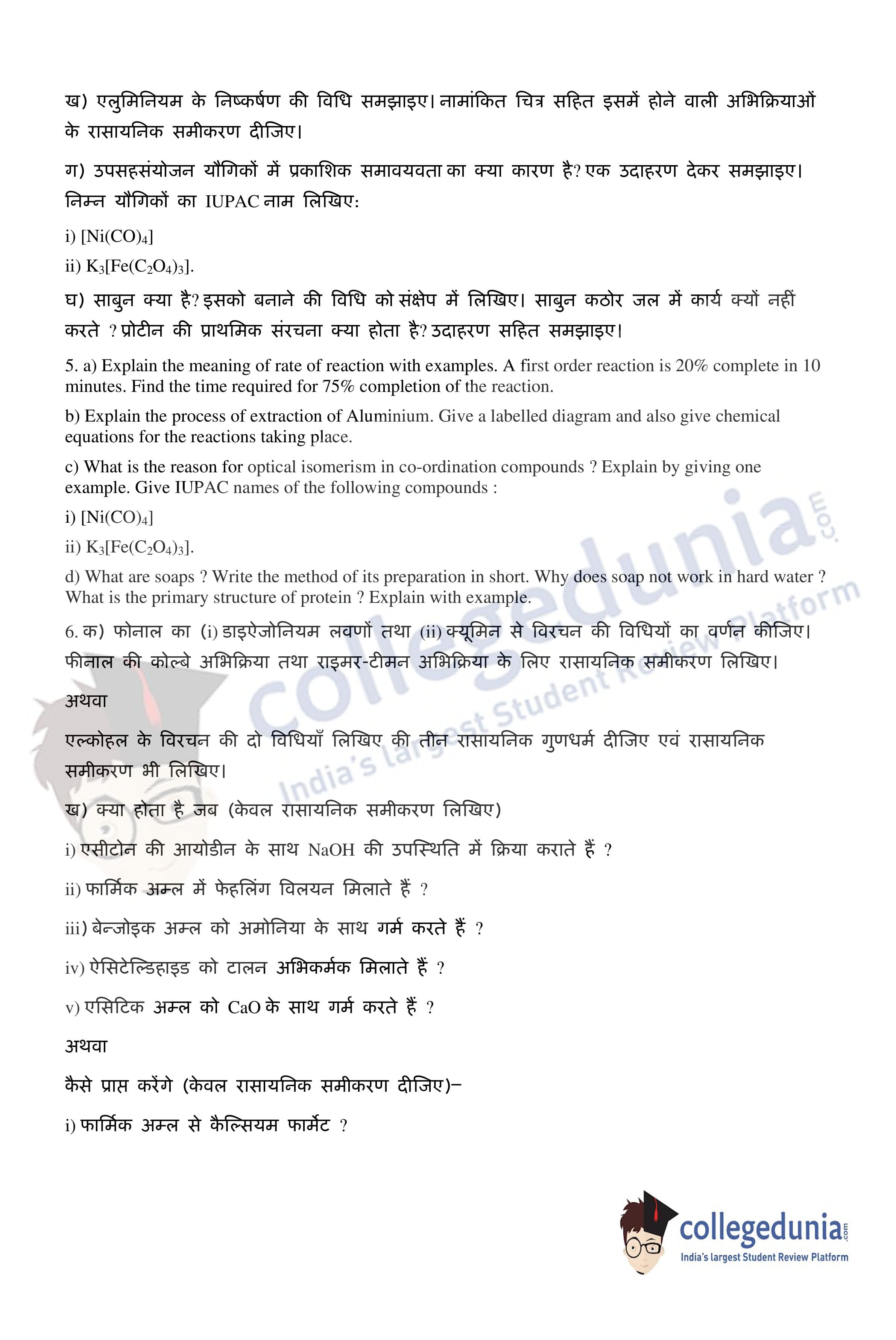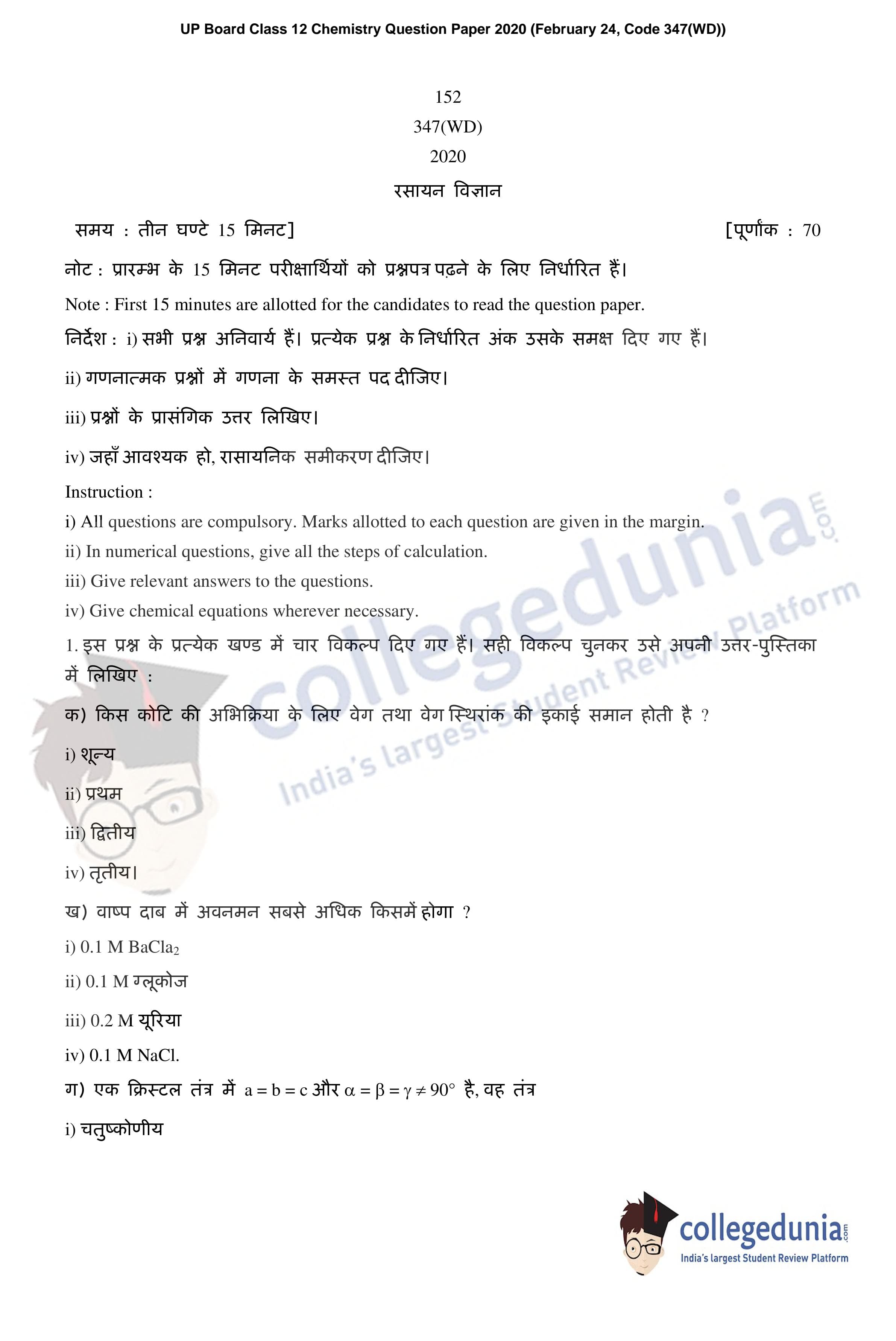 UP Board Class 12 Chemistry Code 347(WD) Question Paper 2020 with Answer Key (February 24)