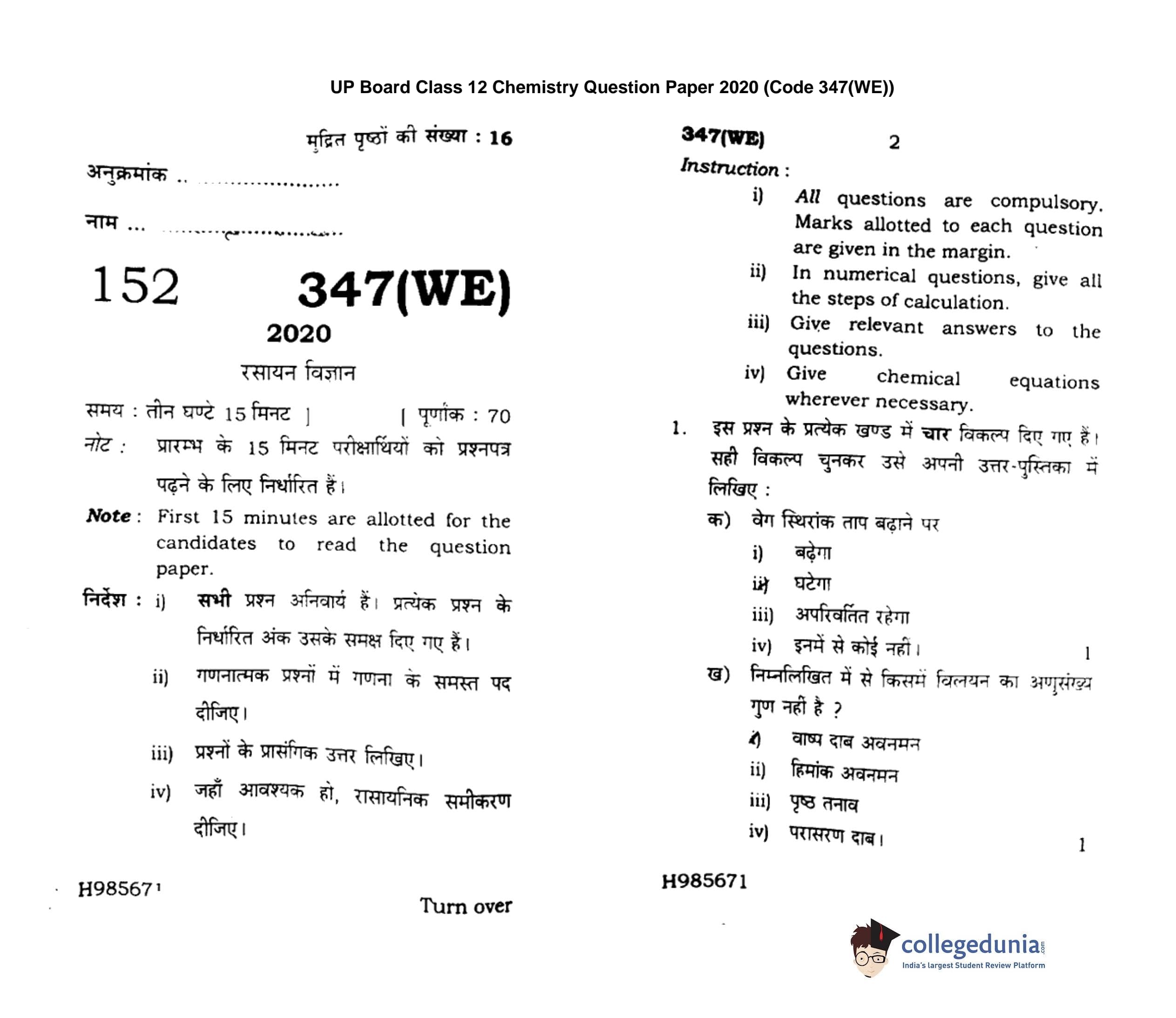 UP Board Class 12 Chemistry Question Paper 2020 with Answer Key Code 347(WE) is available for download. The exam was conducted by the Uttar Pradesh Madhyamik Shiksha Parishad (UPMSP) on February 24, 2020 in the Afternoon Session 2 PM to 5:15 PM. The medium of paper was English and Hindi. The question paper comprised a total of 7 questions.