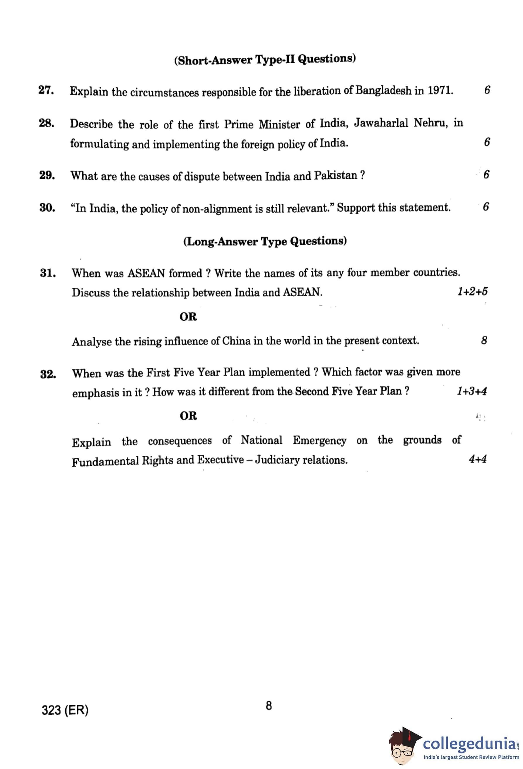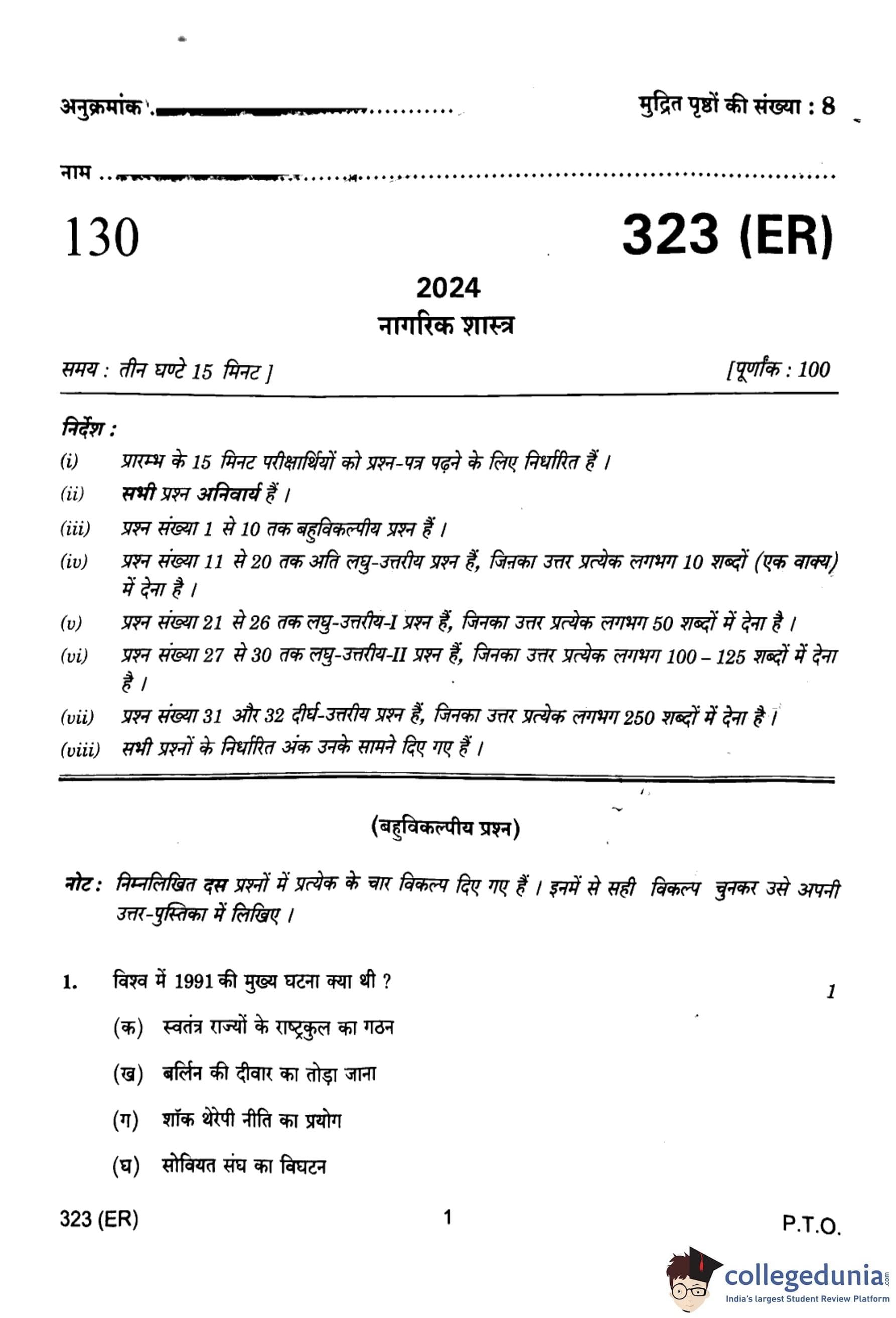 UP Board Class 12 Nagrik Shastra Question Paper 2024 (Code 323 ER) with Solutions