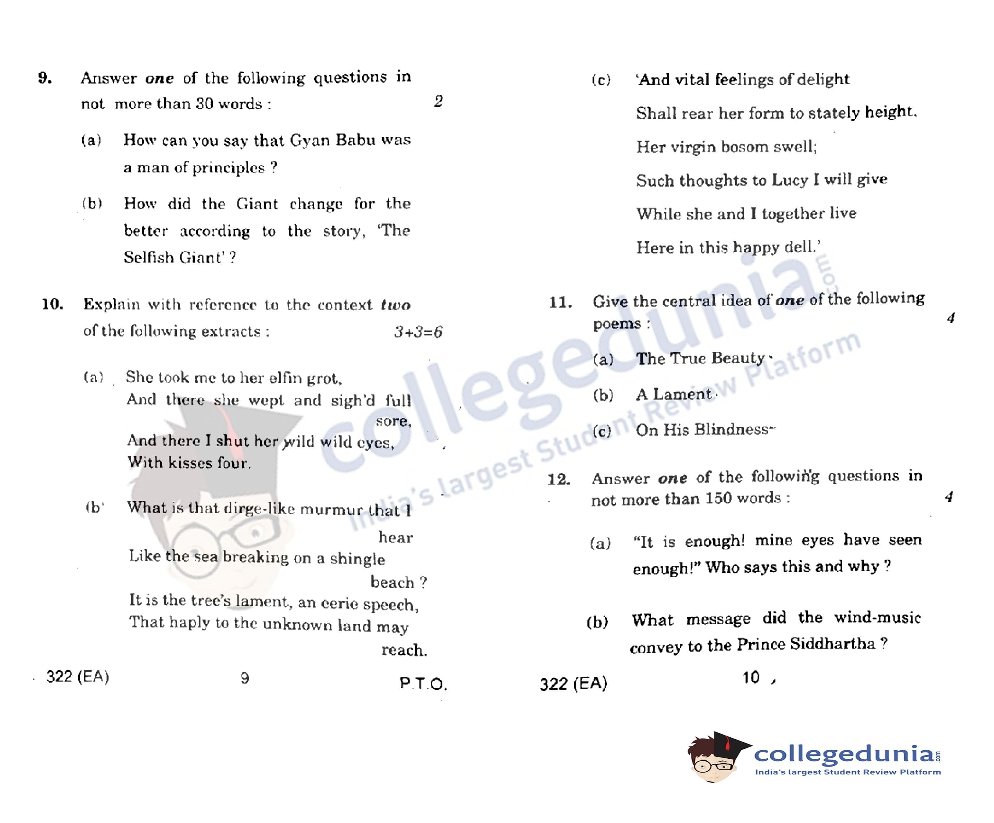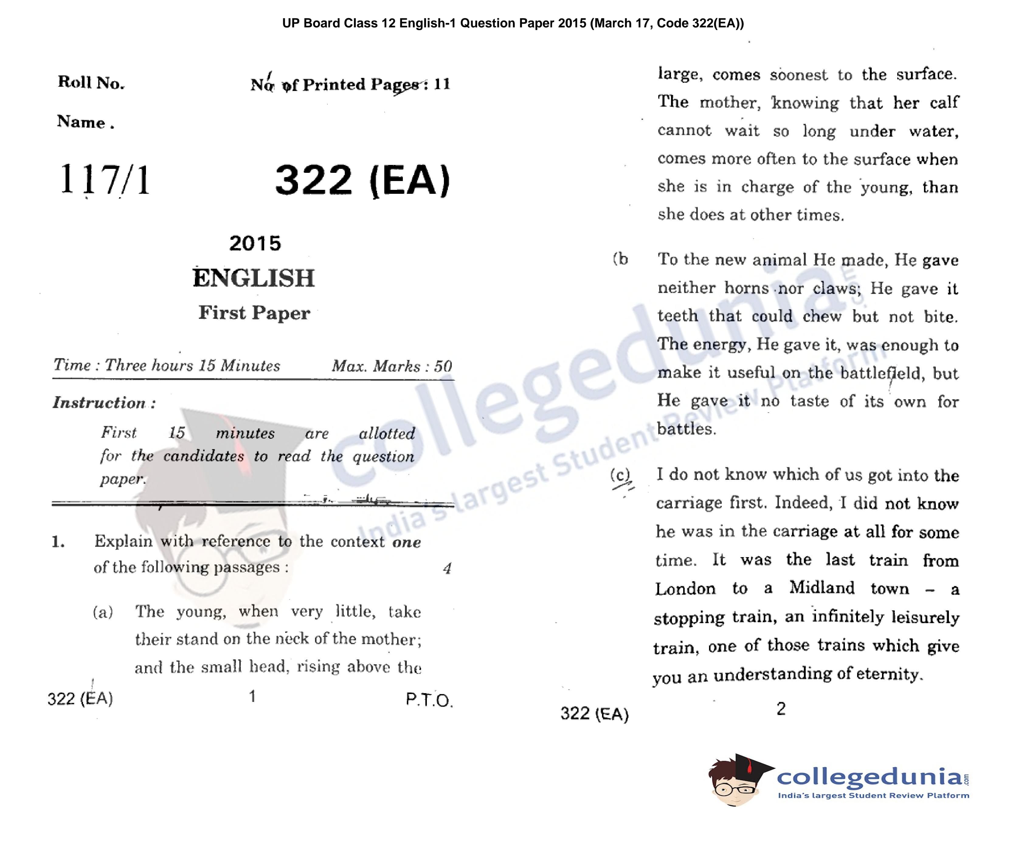 UP Board Class 12 English-1 Code 322(EA) Question Paper 2015 with Answer Key (March 17)