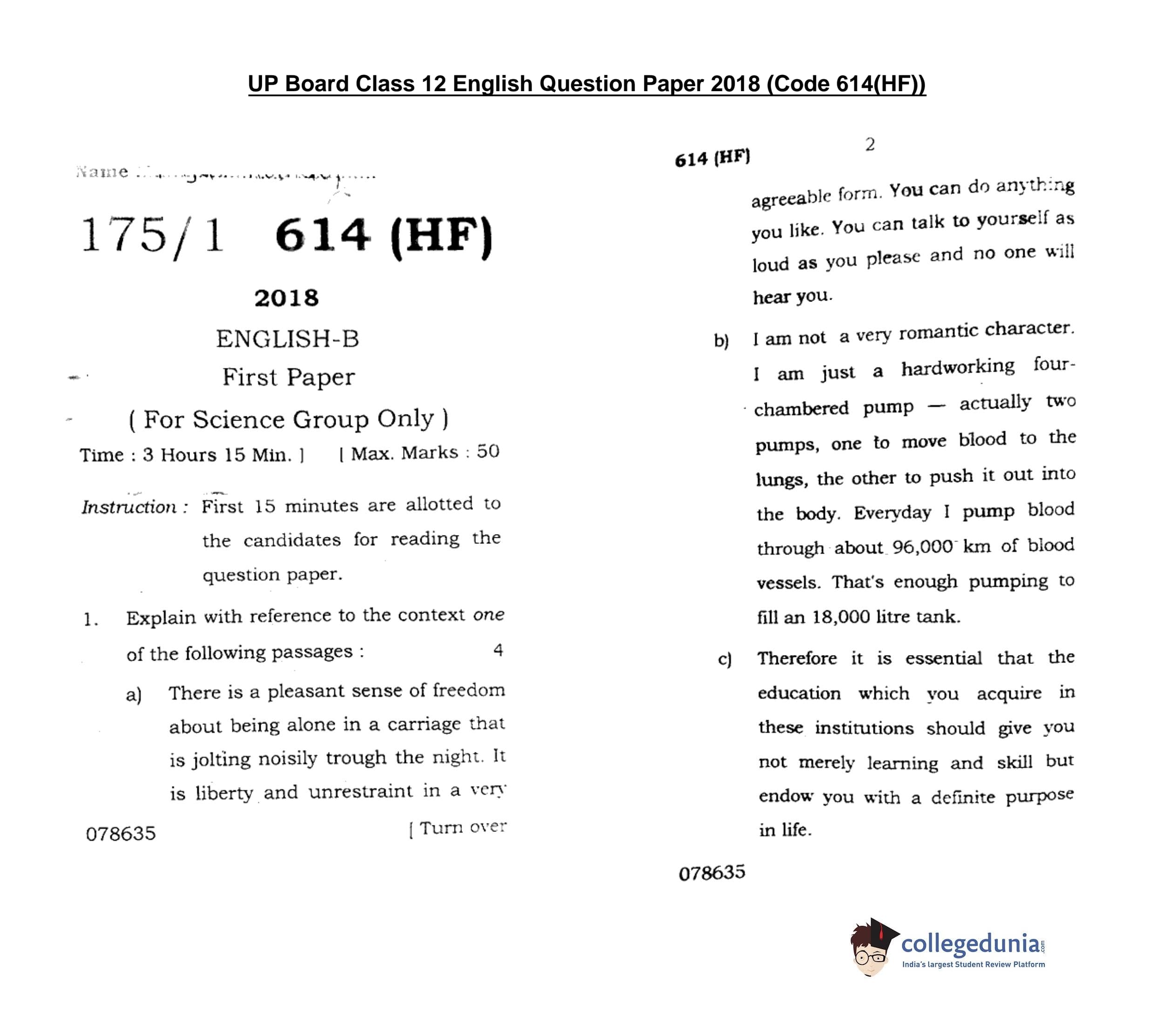 UP Board Class 12 English-B1 Code 614(HF) Question Paper 2018 with Answer Key (February 24)