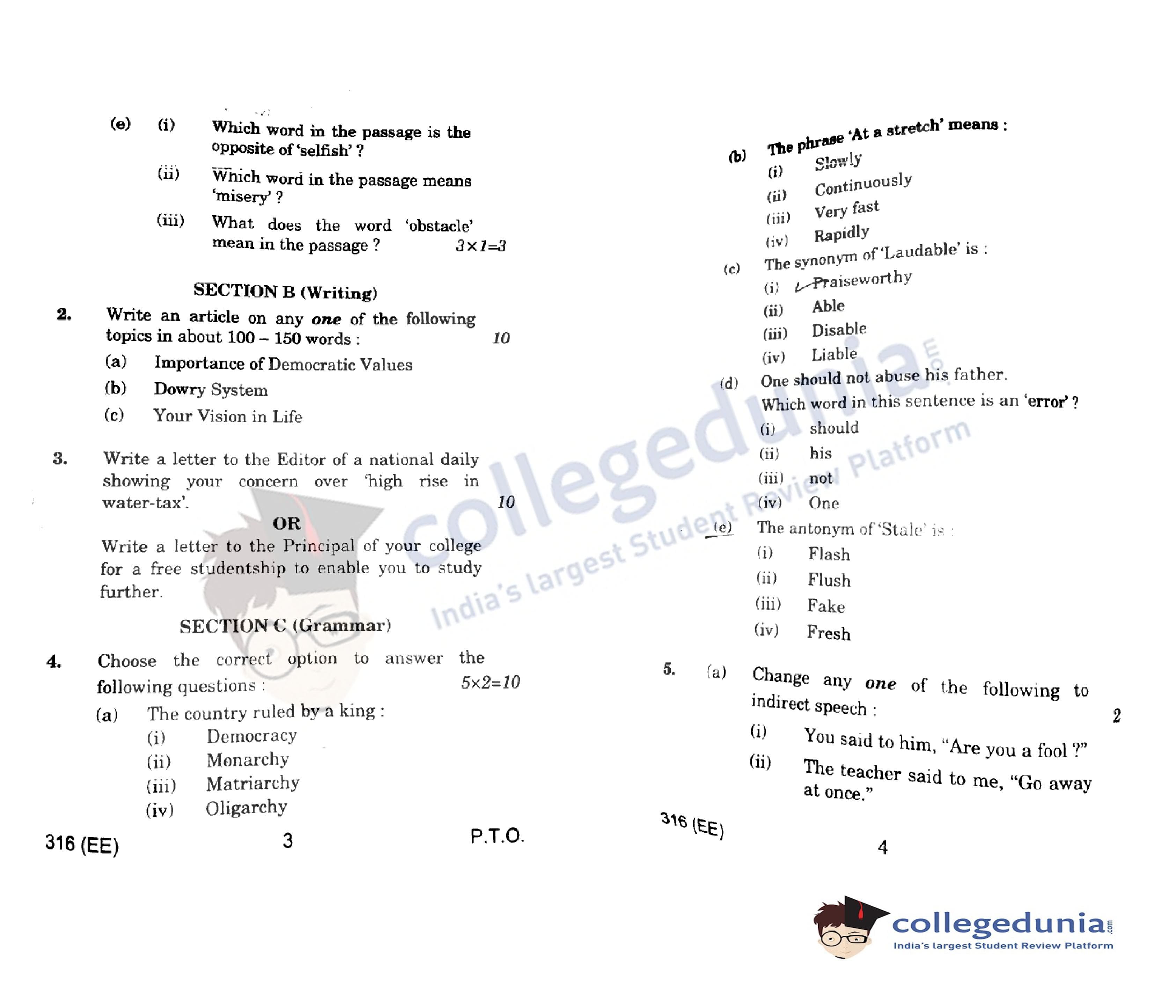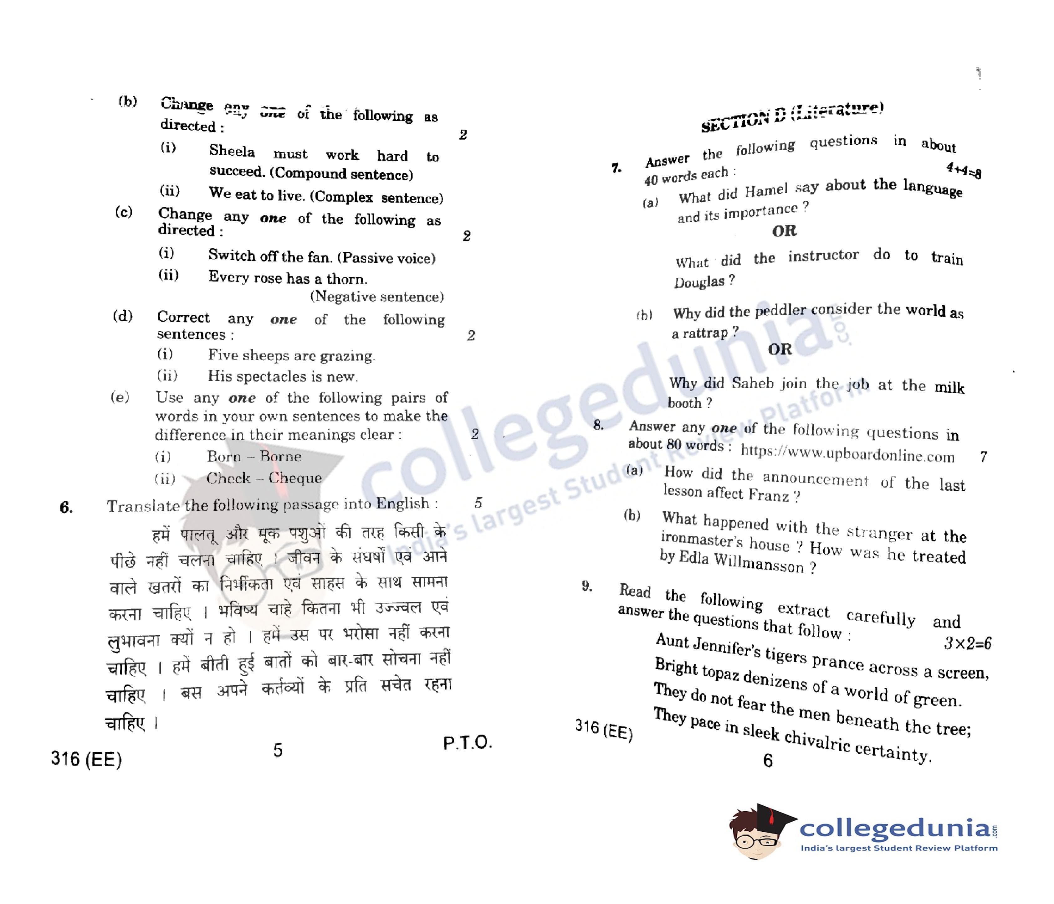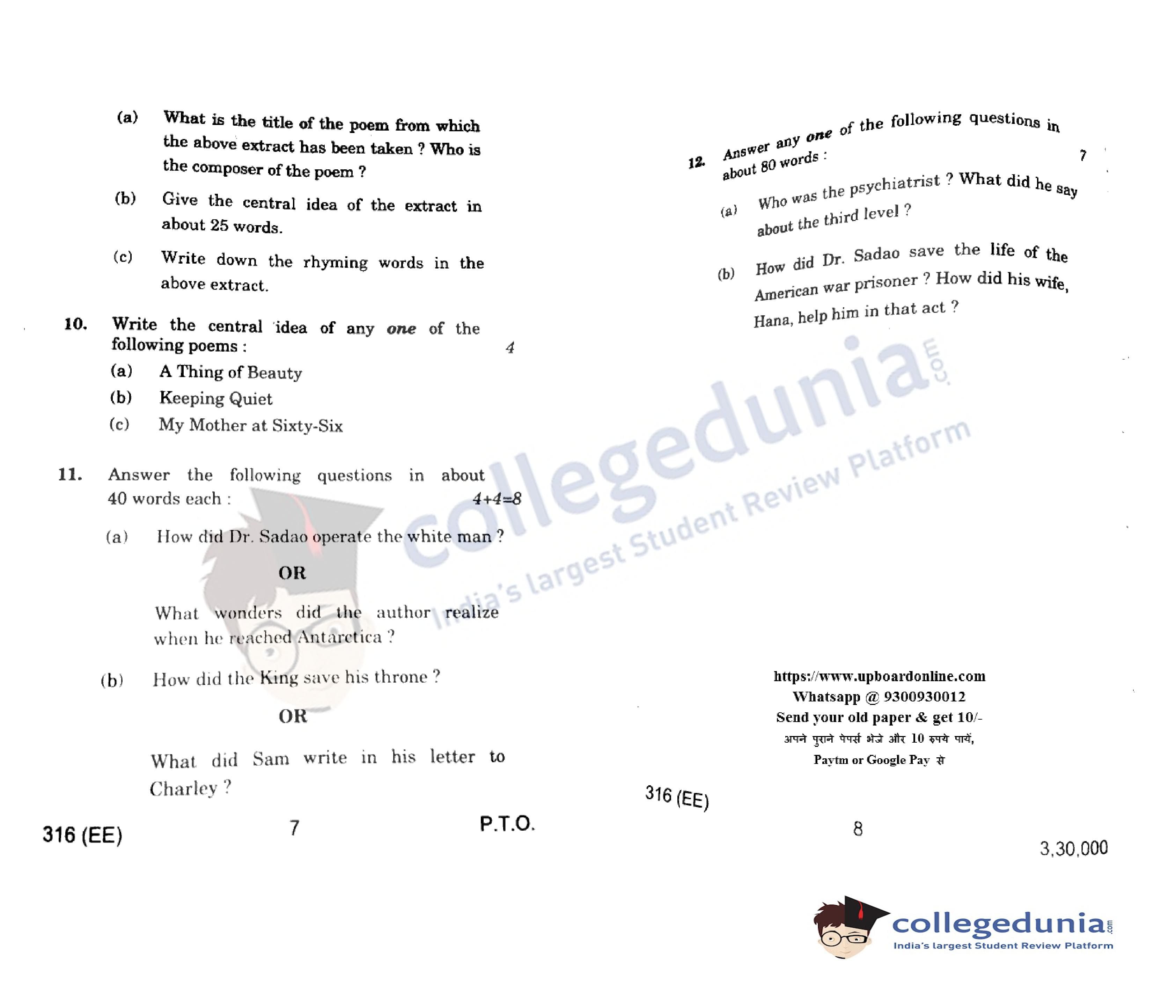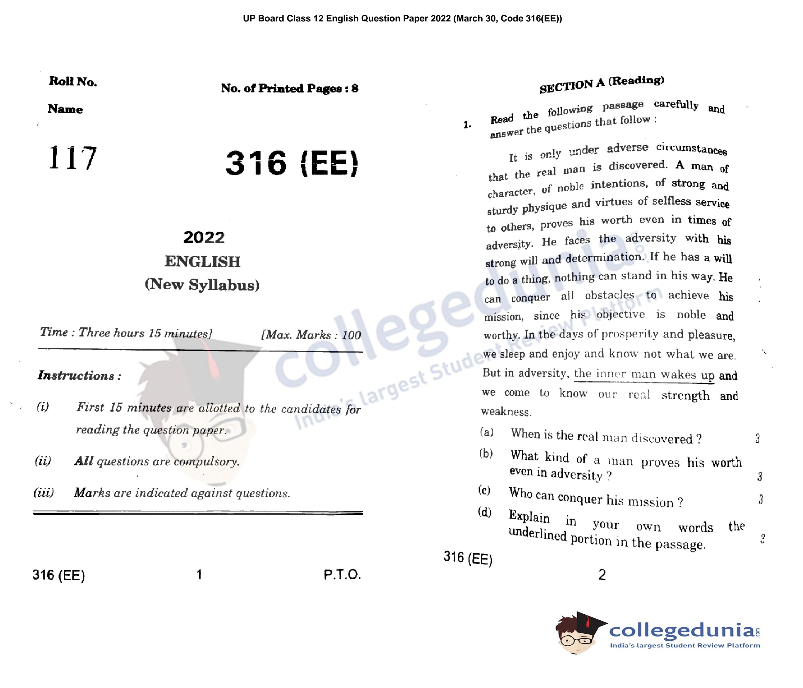 UP Board Class 12 English Code 316(EE) Question Paper 2022 with Answer Key (March 30)