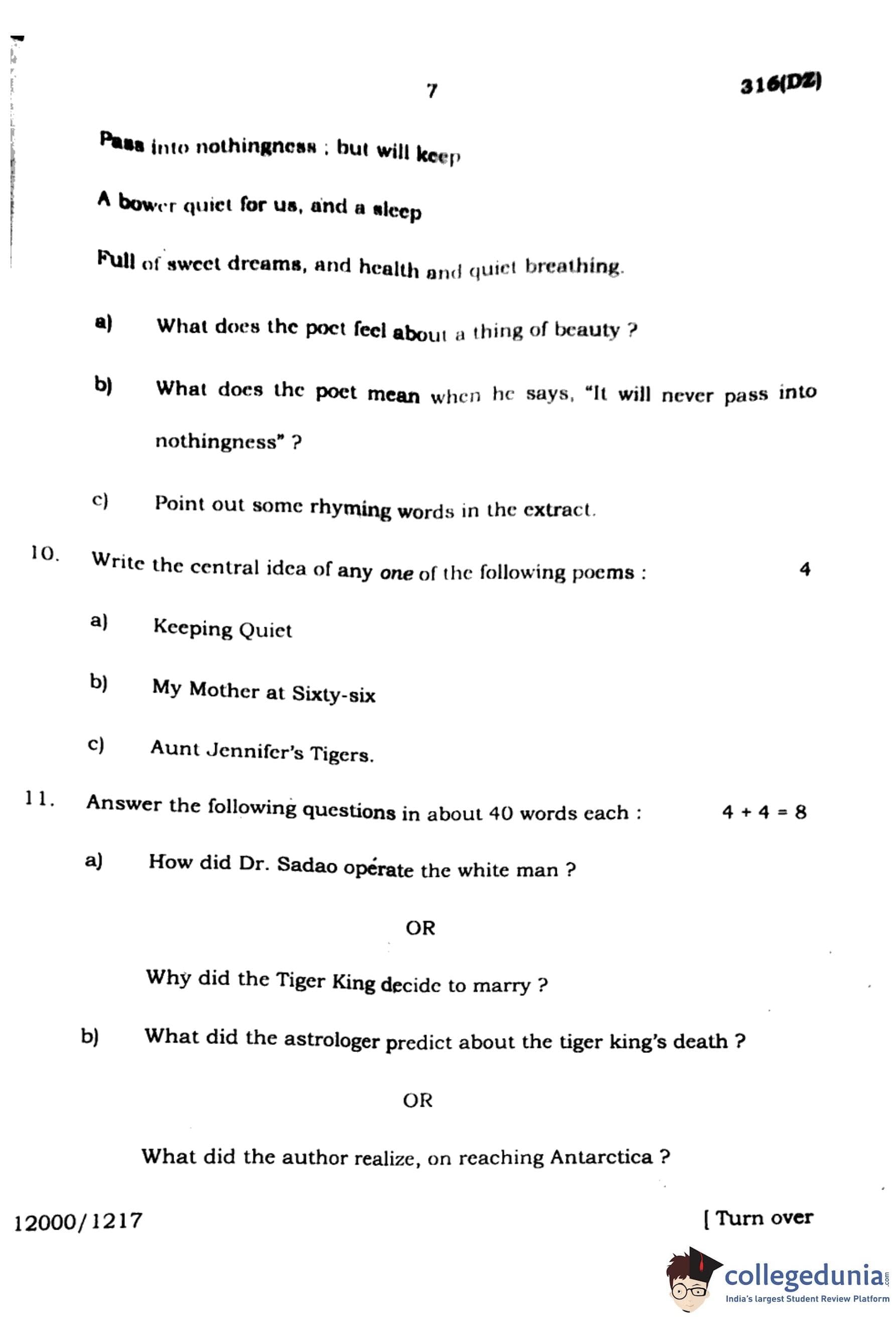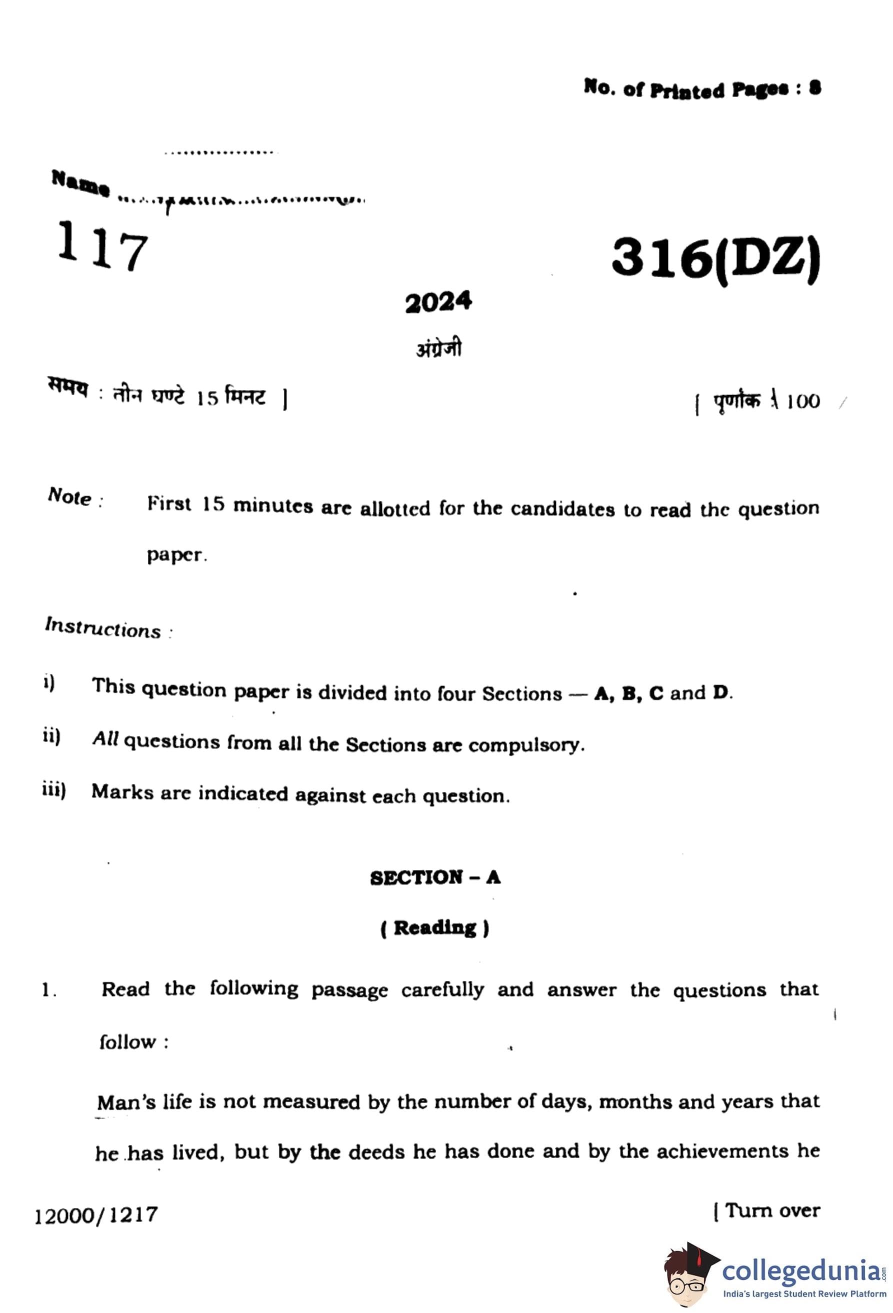 UP Board Class 12 English Question Paper 2024 (Code 316 DZ) with Solutions