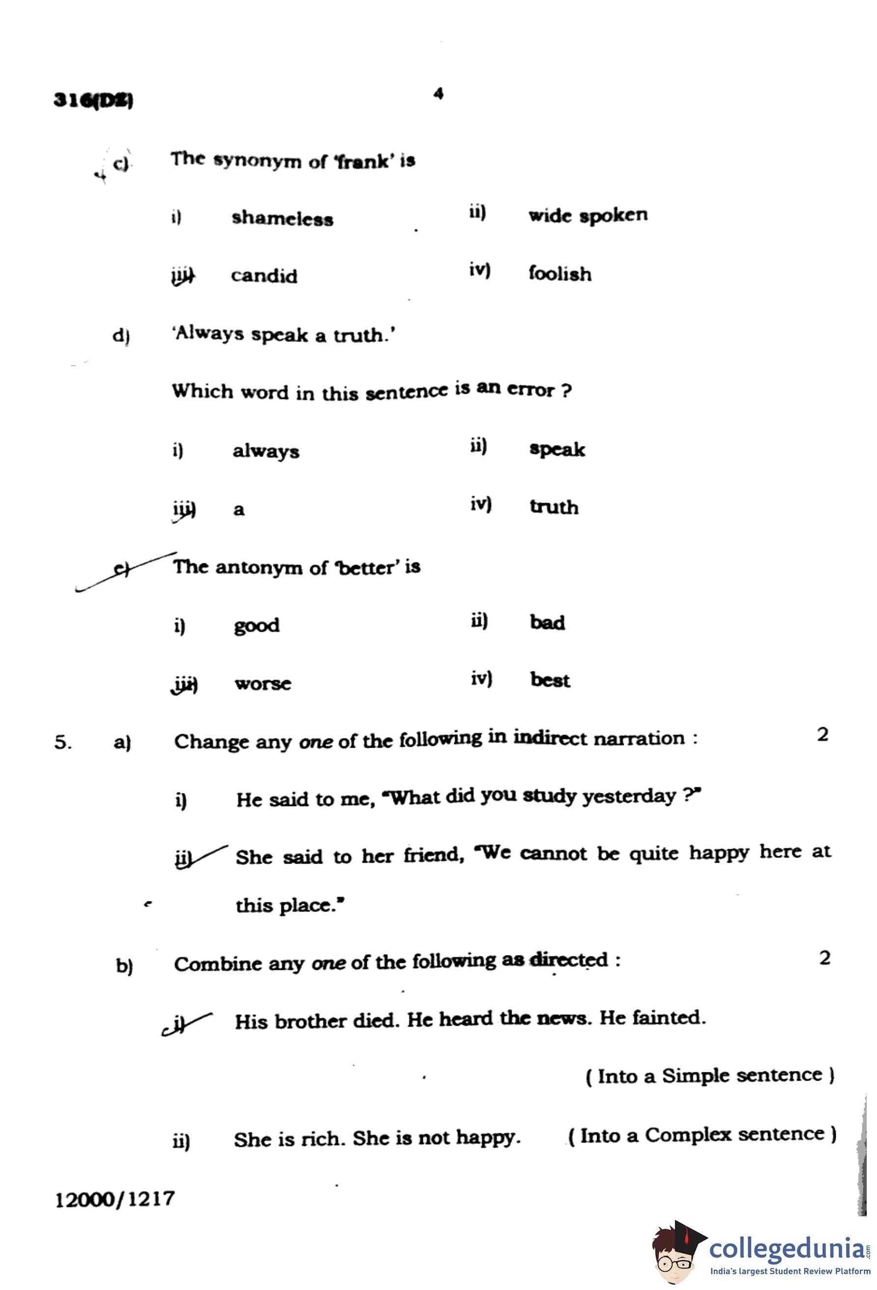 (c) The synonym of 'frank' is: