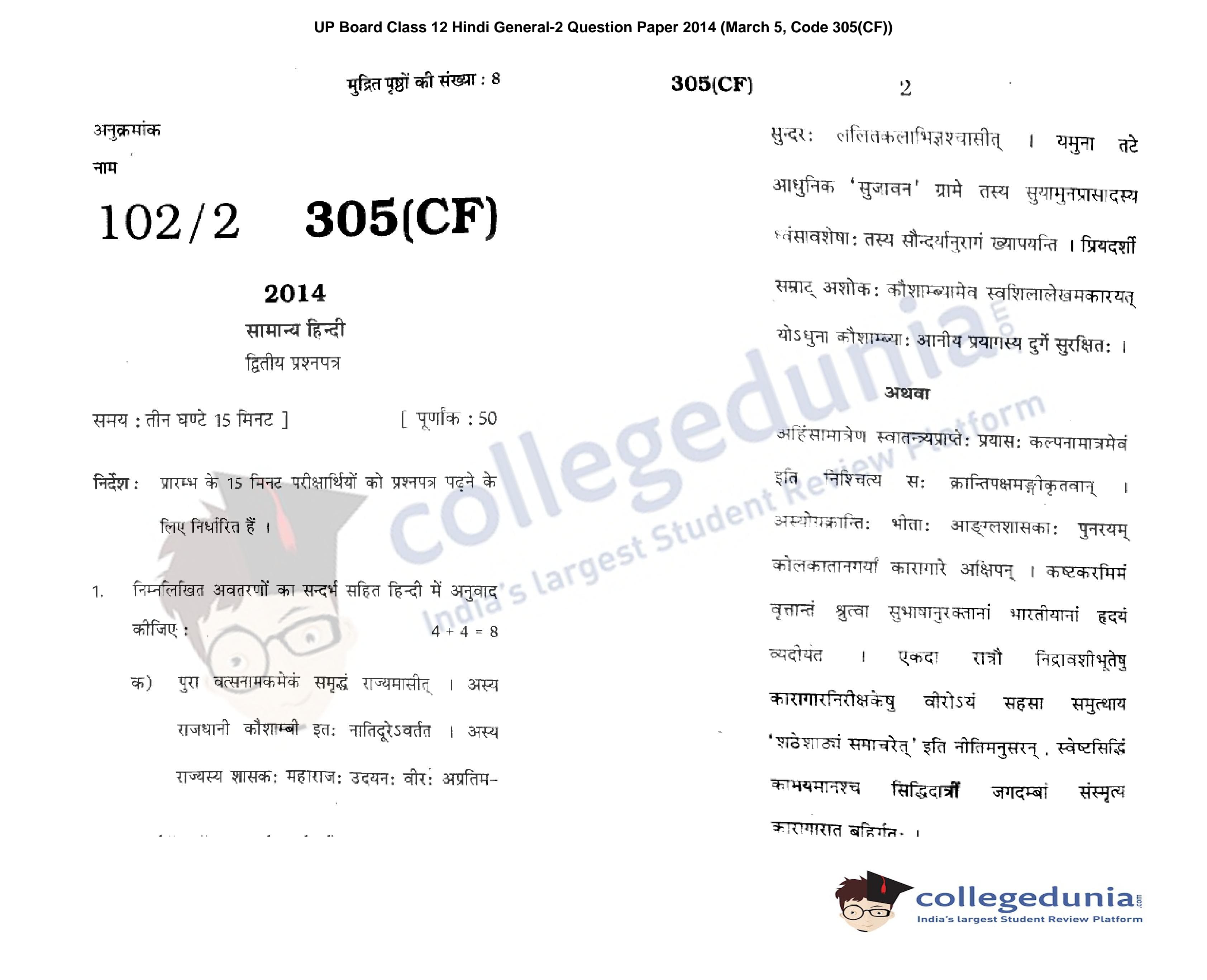 UP Board Class 12 Hindi General-2 Code 305(CF) Question Paper 2014 with Answer Key (March 5)