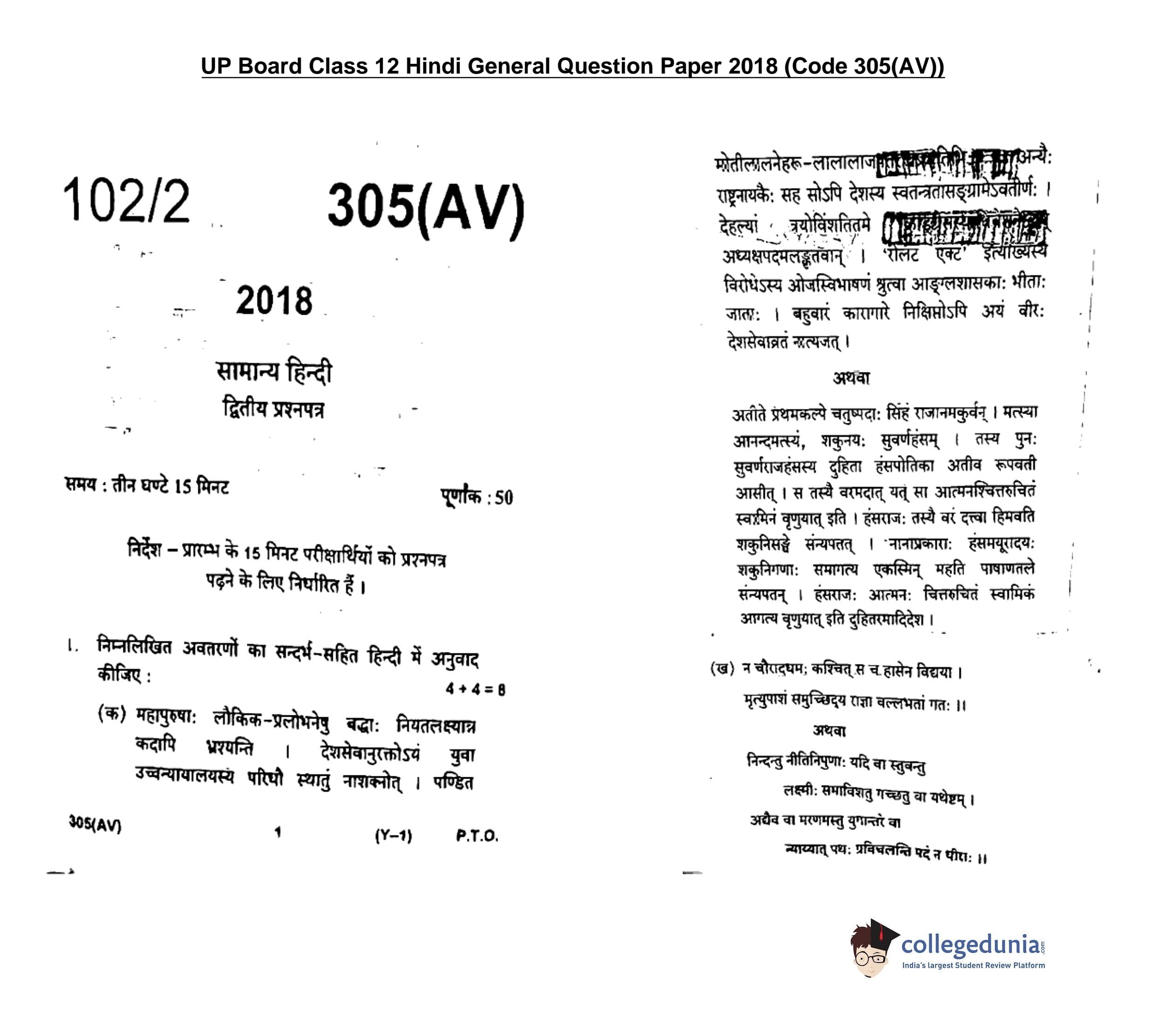 UP Board Class 12 Hindi General-2 Code 305(AV) Question Paper 2018 with Answer Key (February 8)