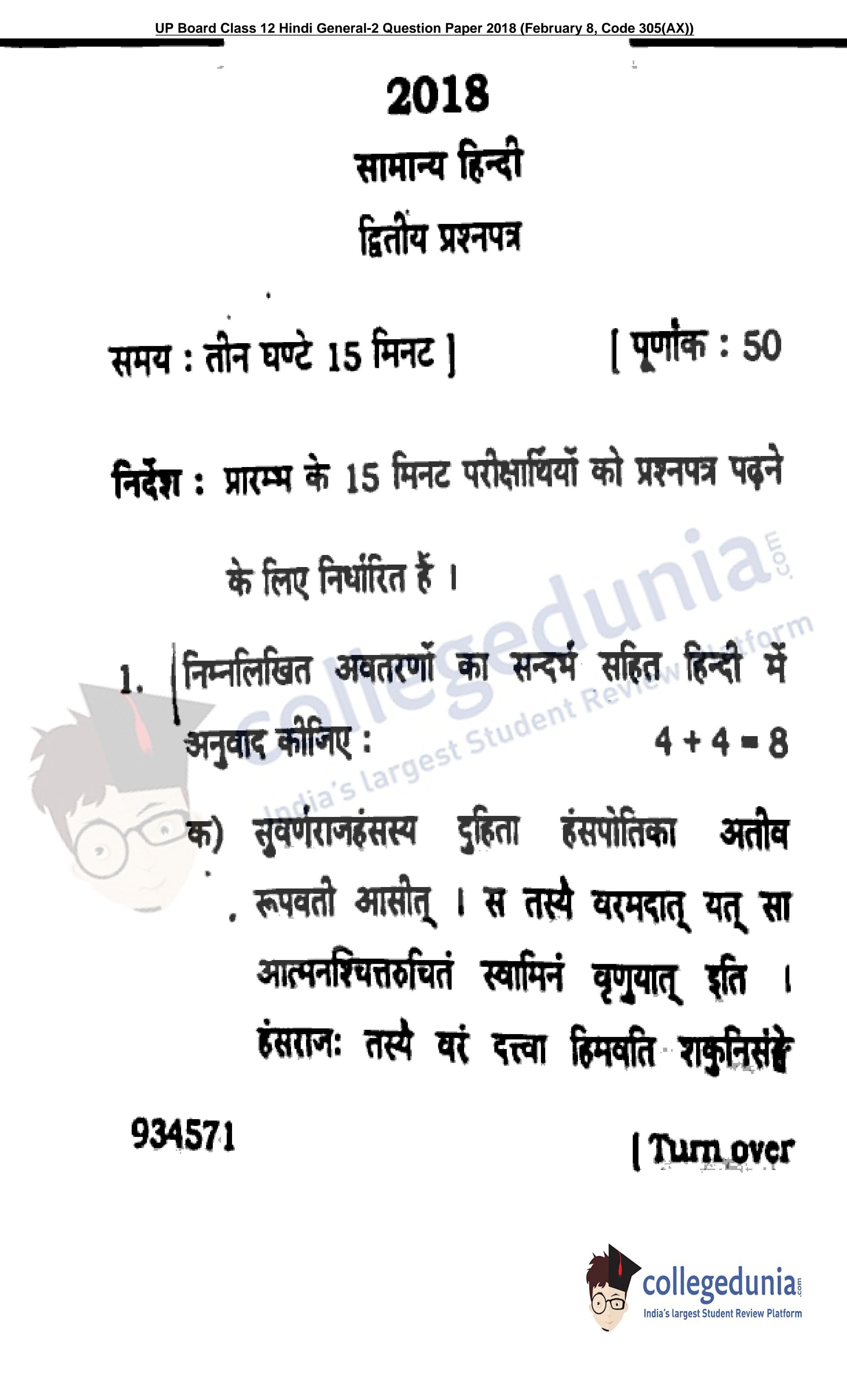 UP Board Class 12 Hindi General-2 Code 305(AX) Question Paper 2018 with Answer Key (February 8)