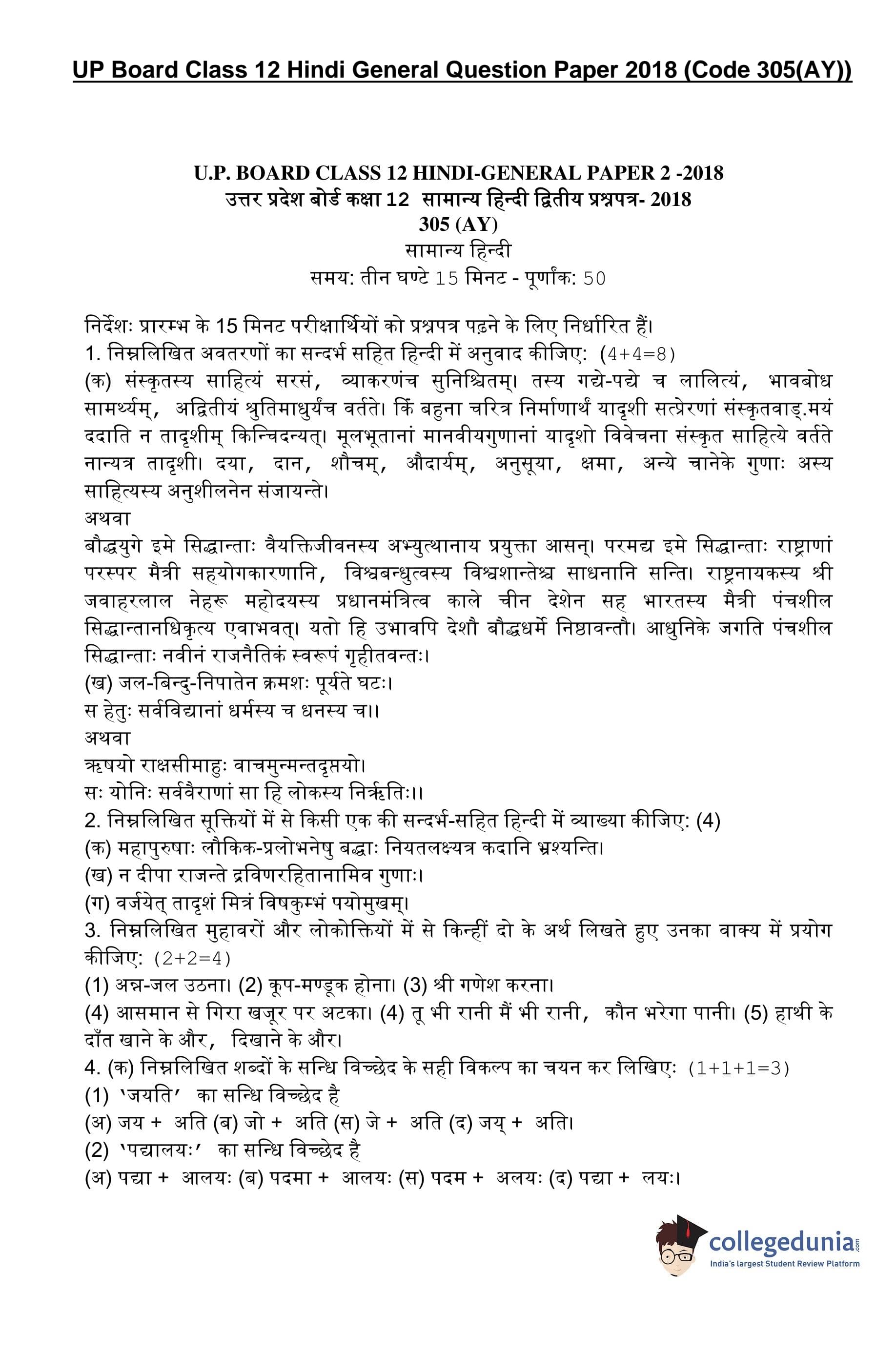 UP Board Class 12 Hindi General-2 Code 305(AY) Question Paper 2018 with Answer Key (February 8)