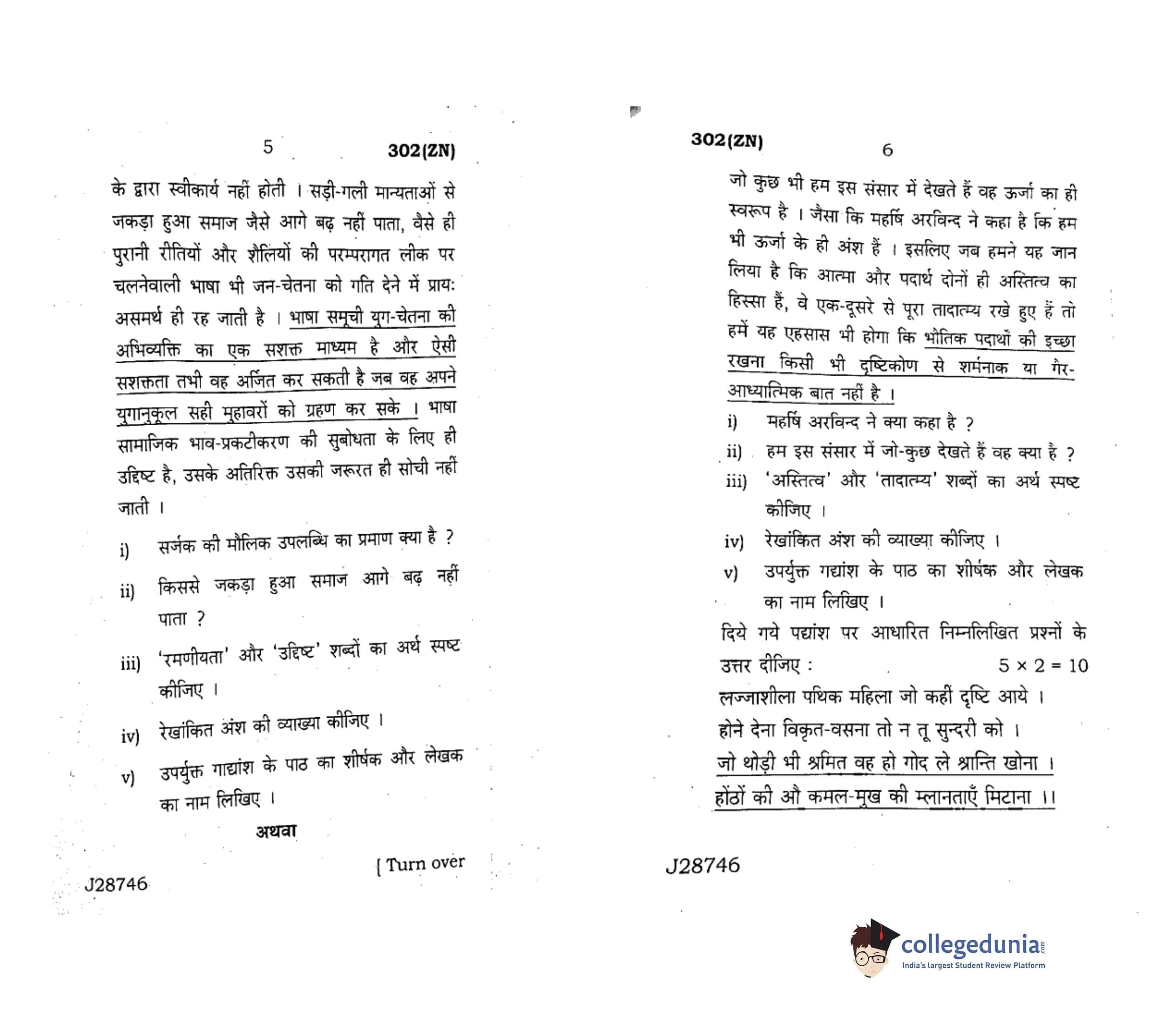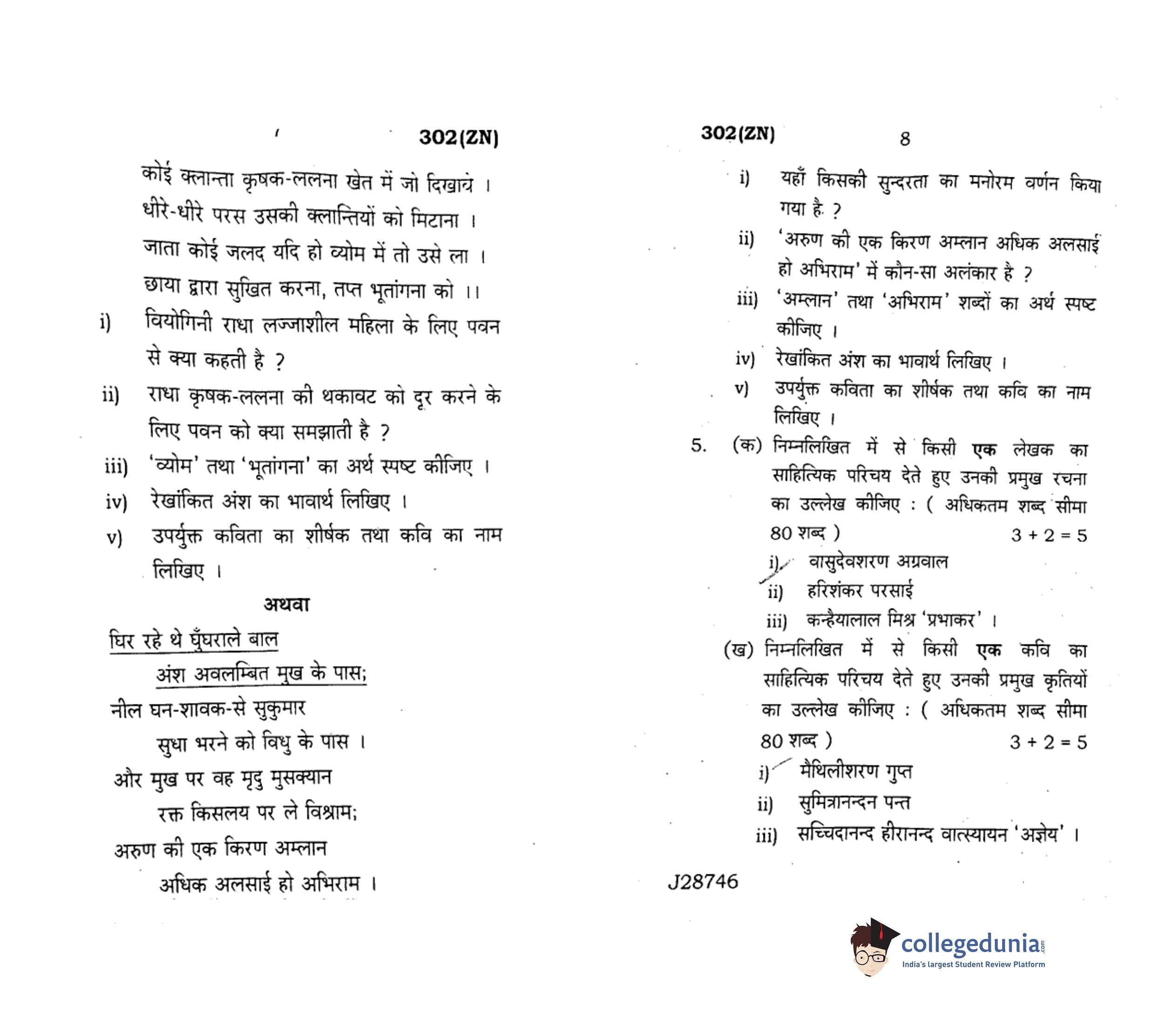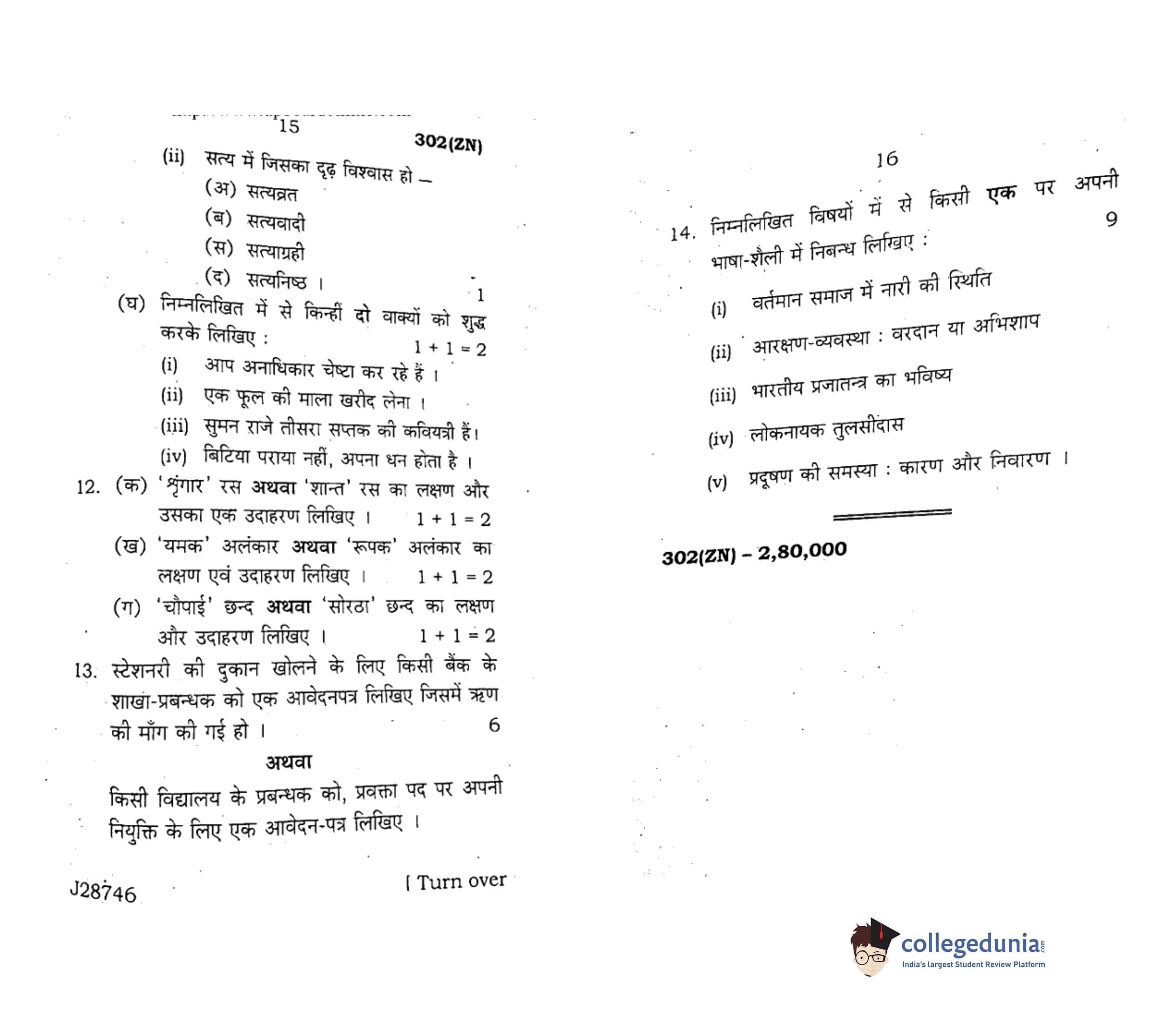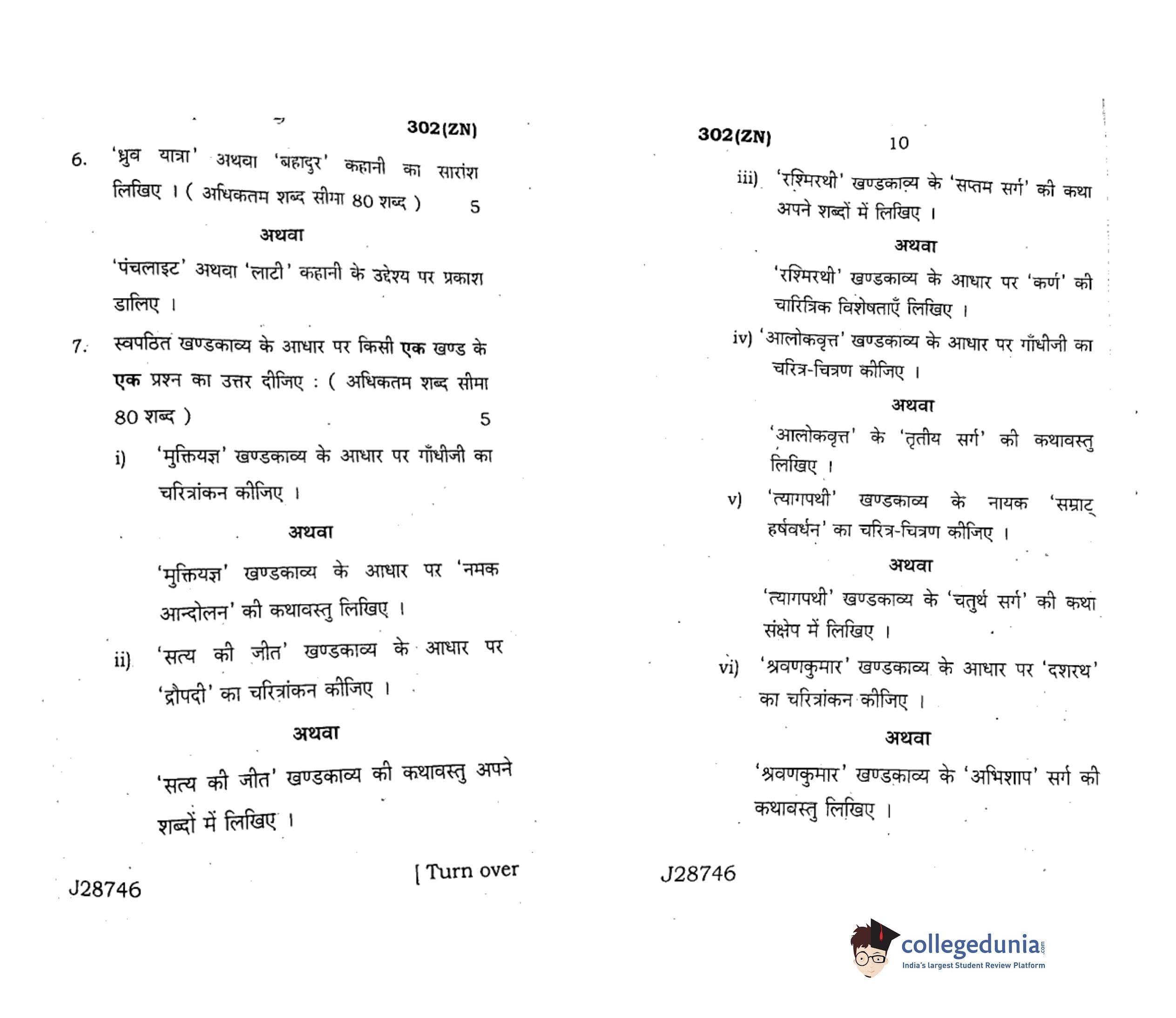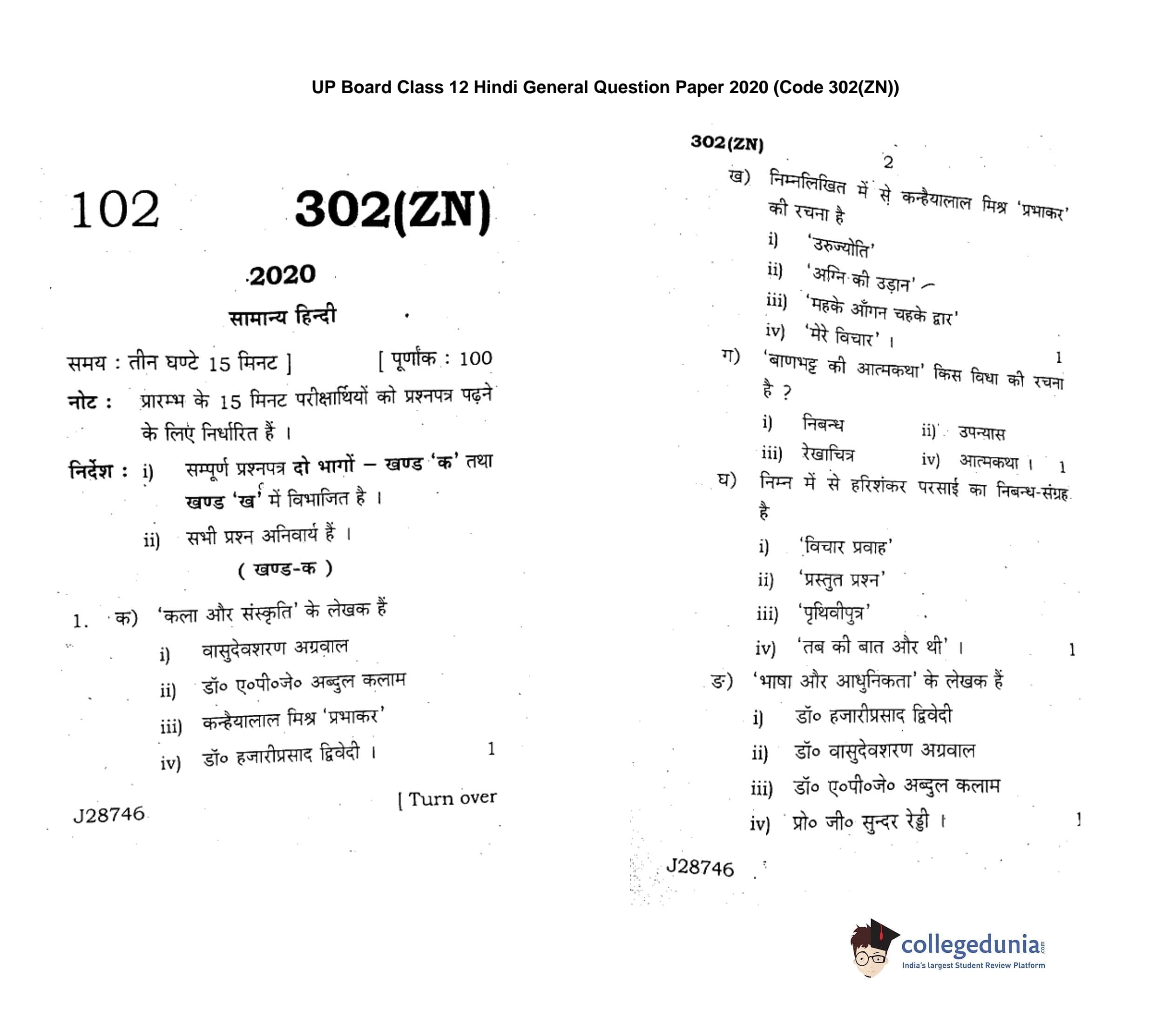 UP Board Class 12 Hindi General Code 302(ZN) Question Paper 2020 with Answer Key (February 18)