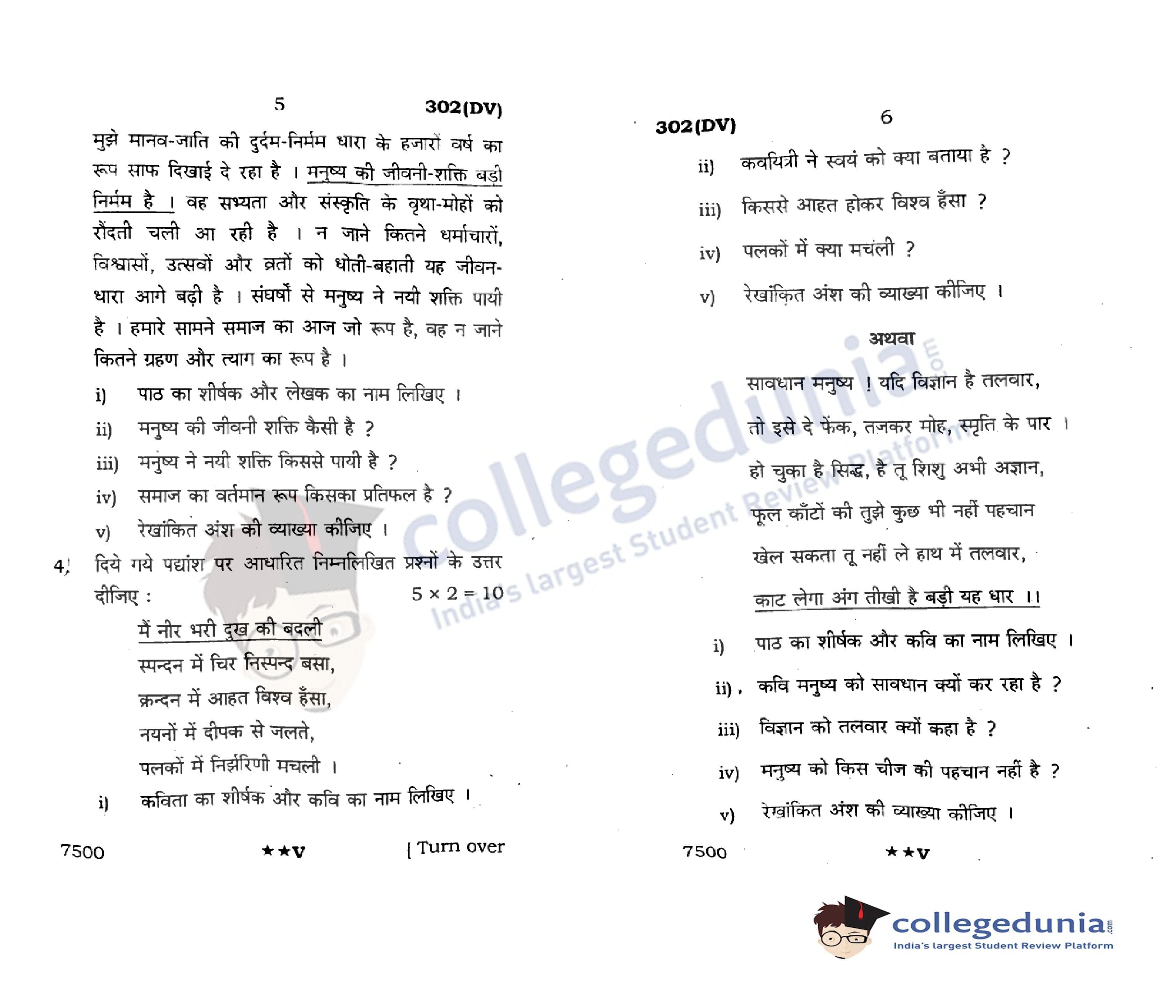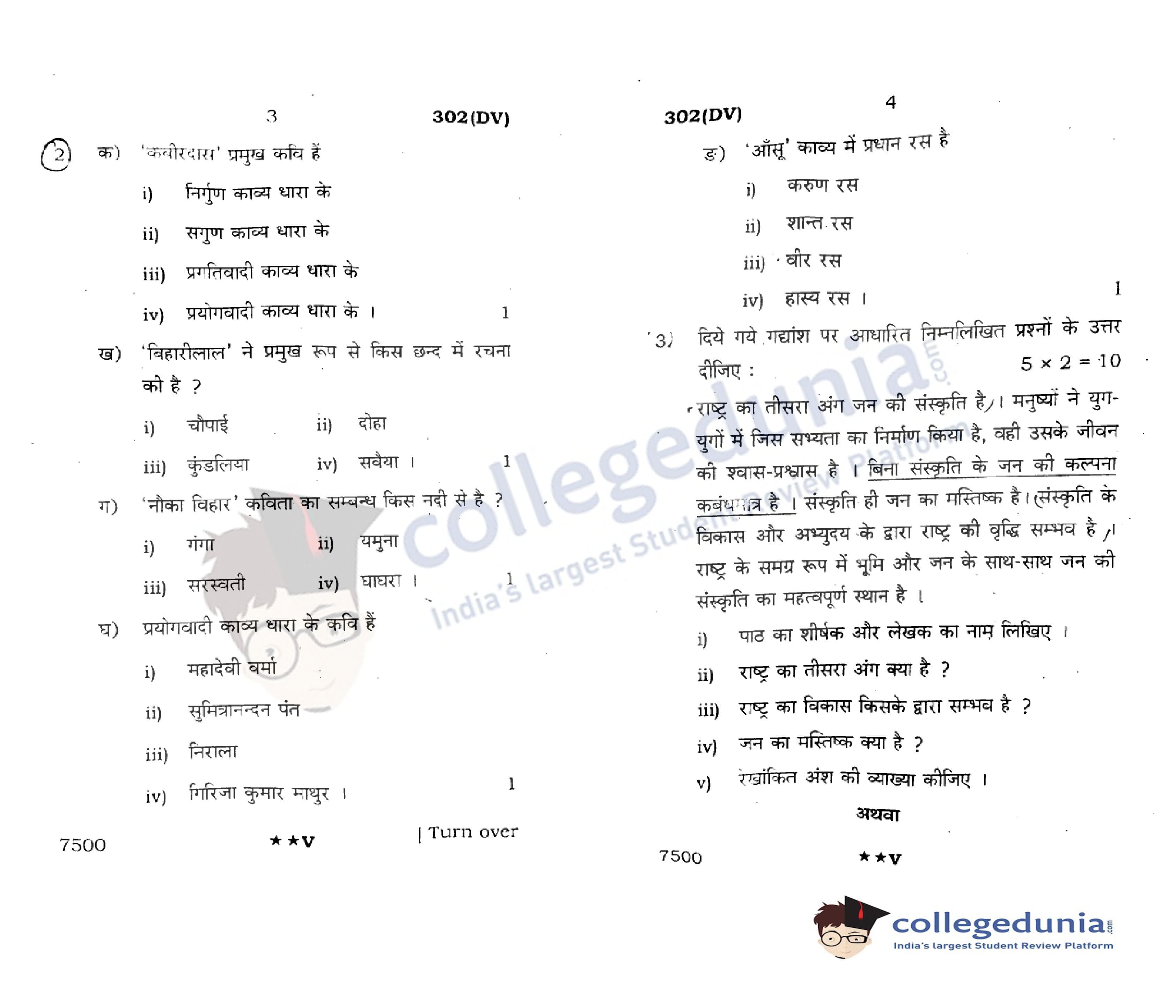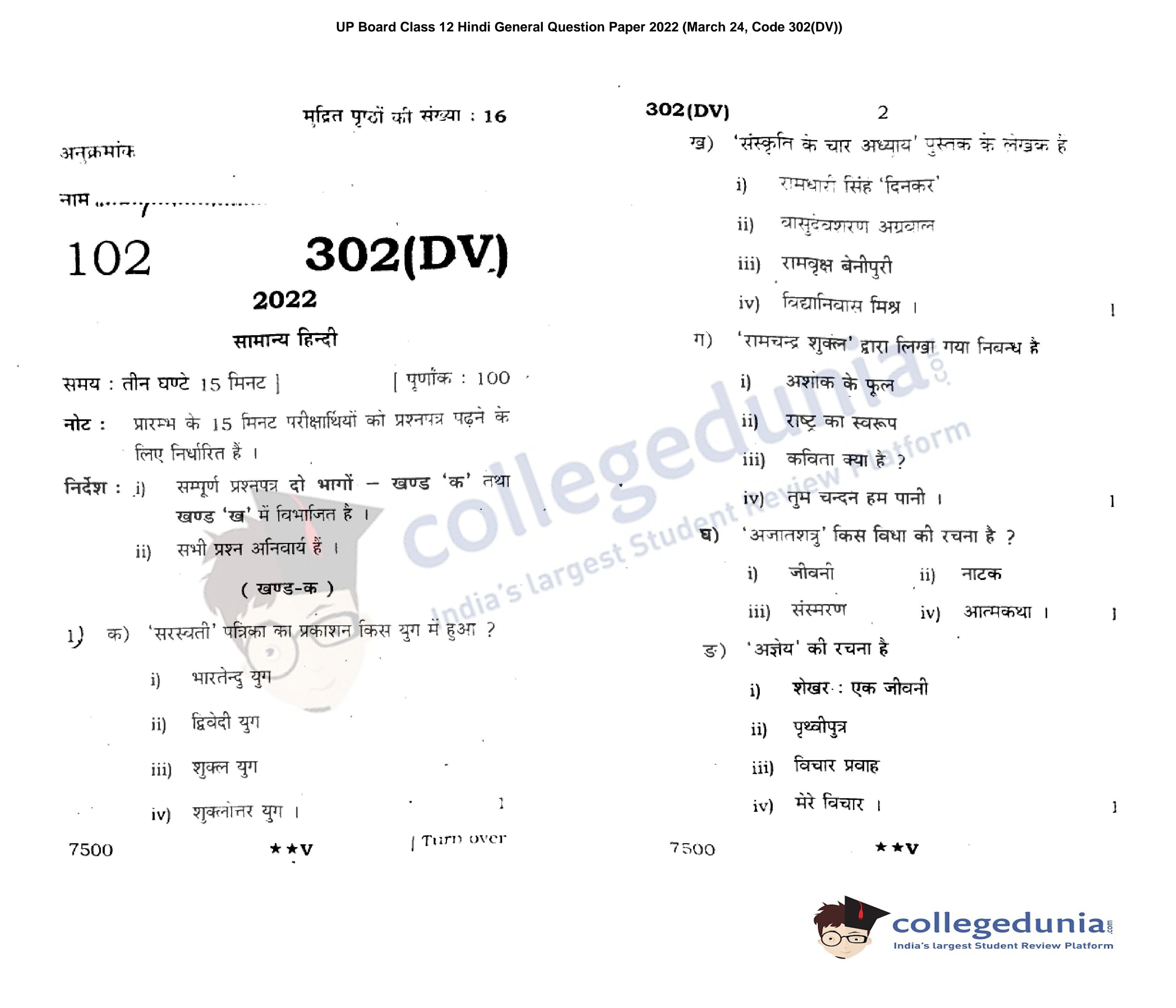 UP Board Class 12 Hindi General Code 302(DV) Question Paper 2022 with Answer Key (March 24)