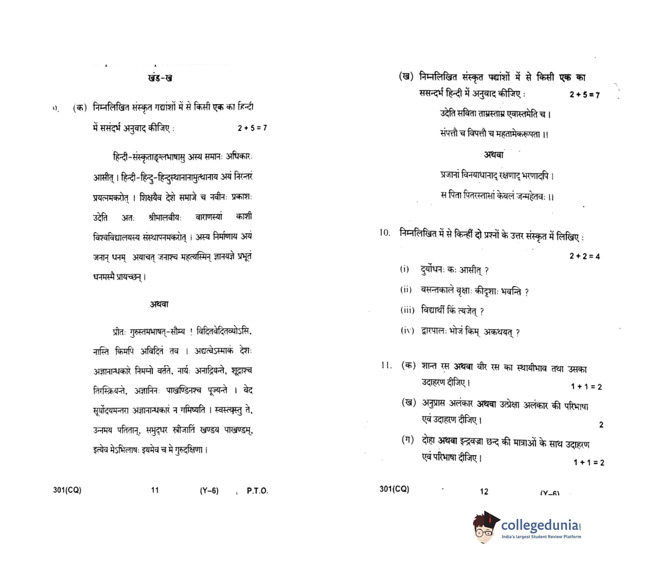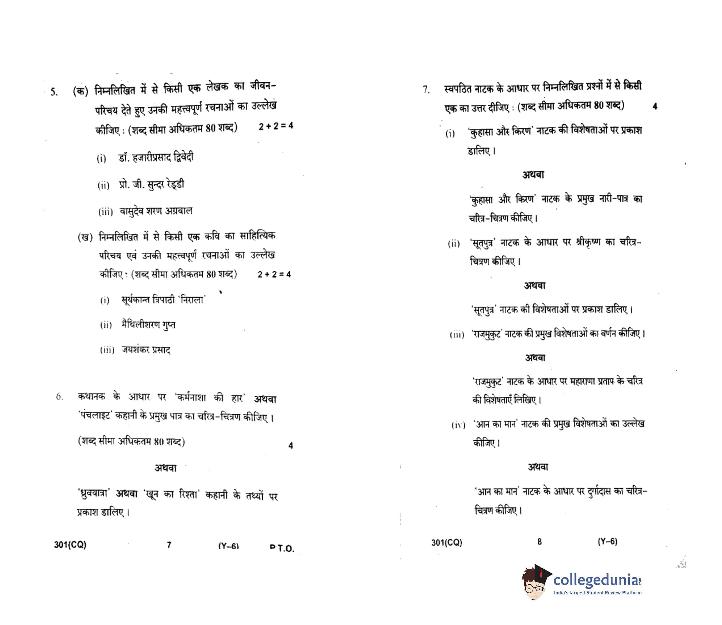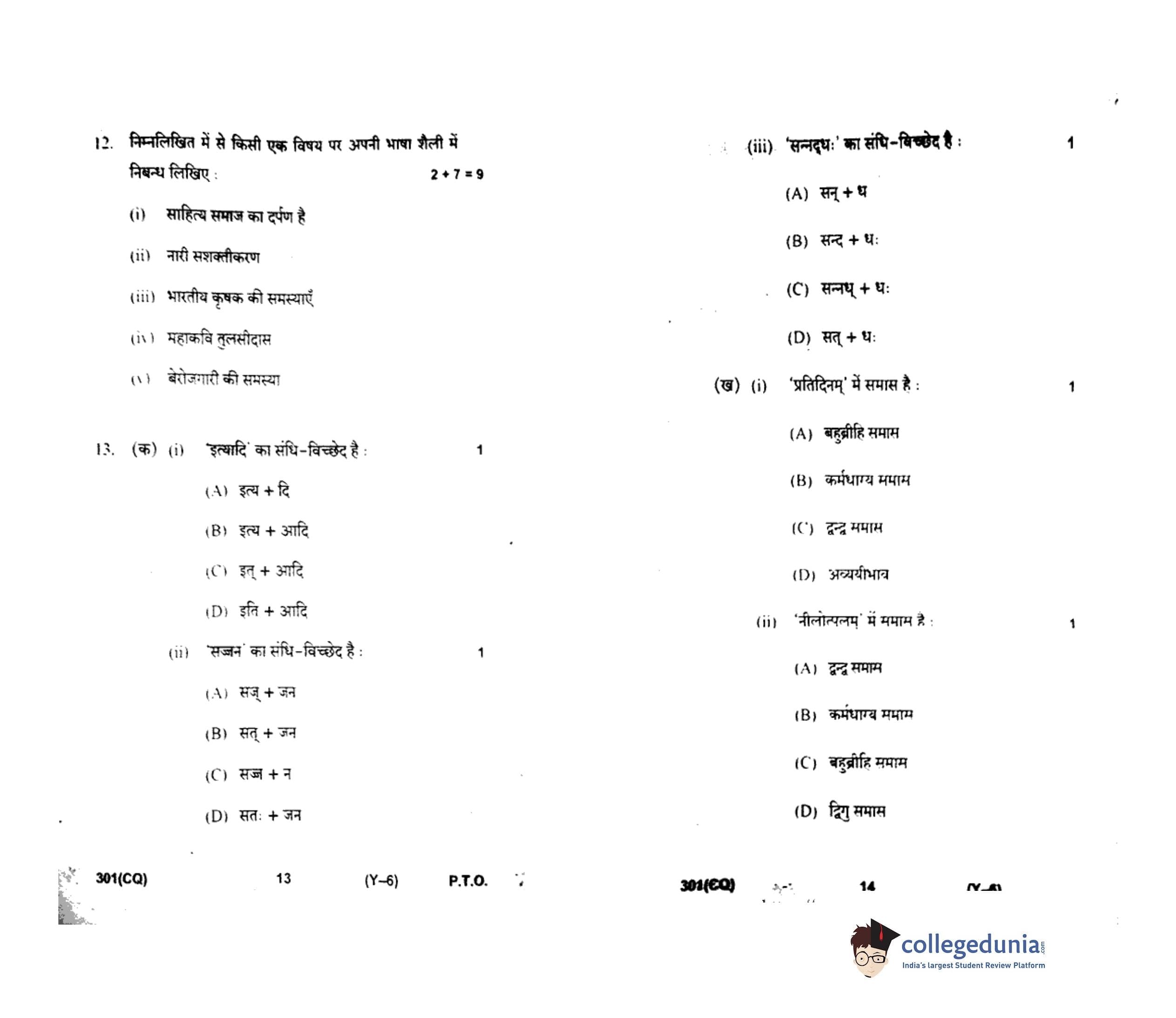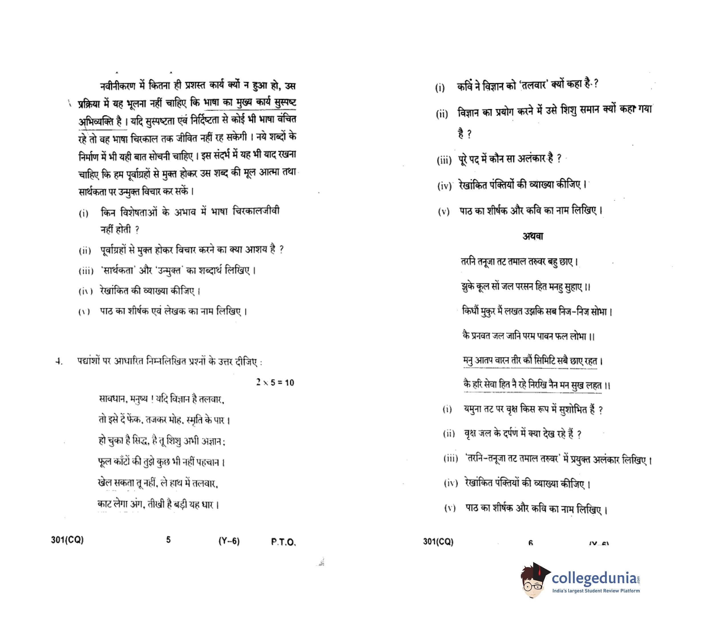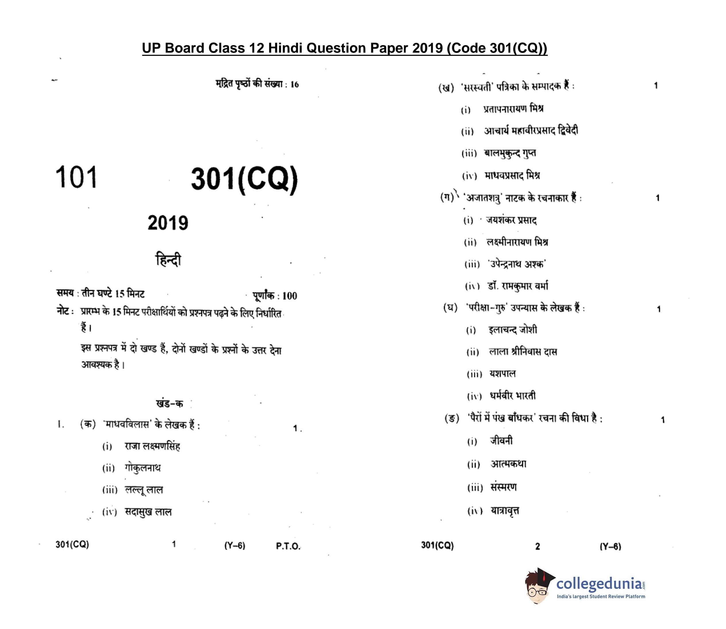 UP Board Class 12 Hindi Code 301(CQ) Question Paper 2019 with Answer Key (February 12)