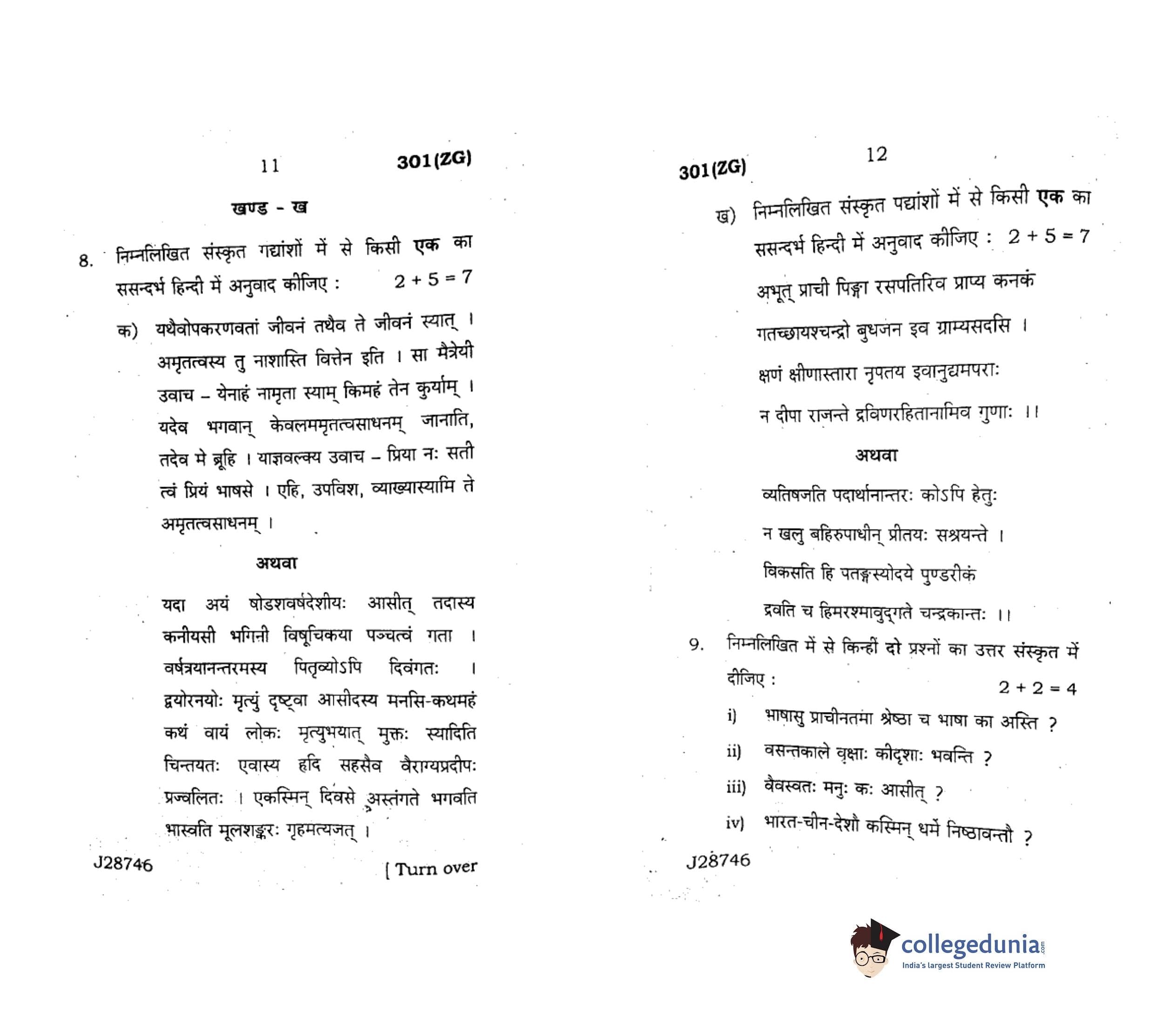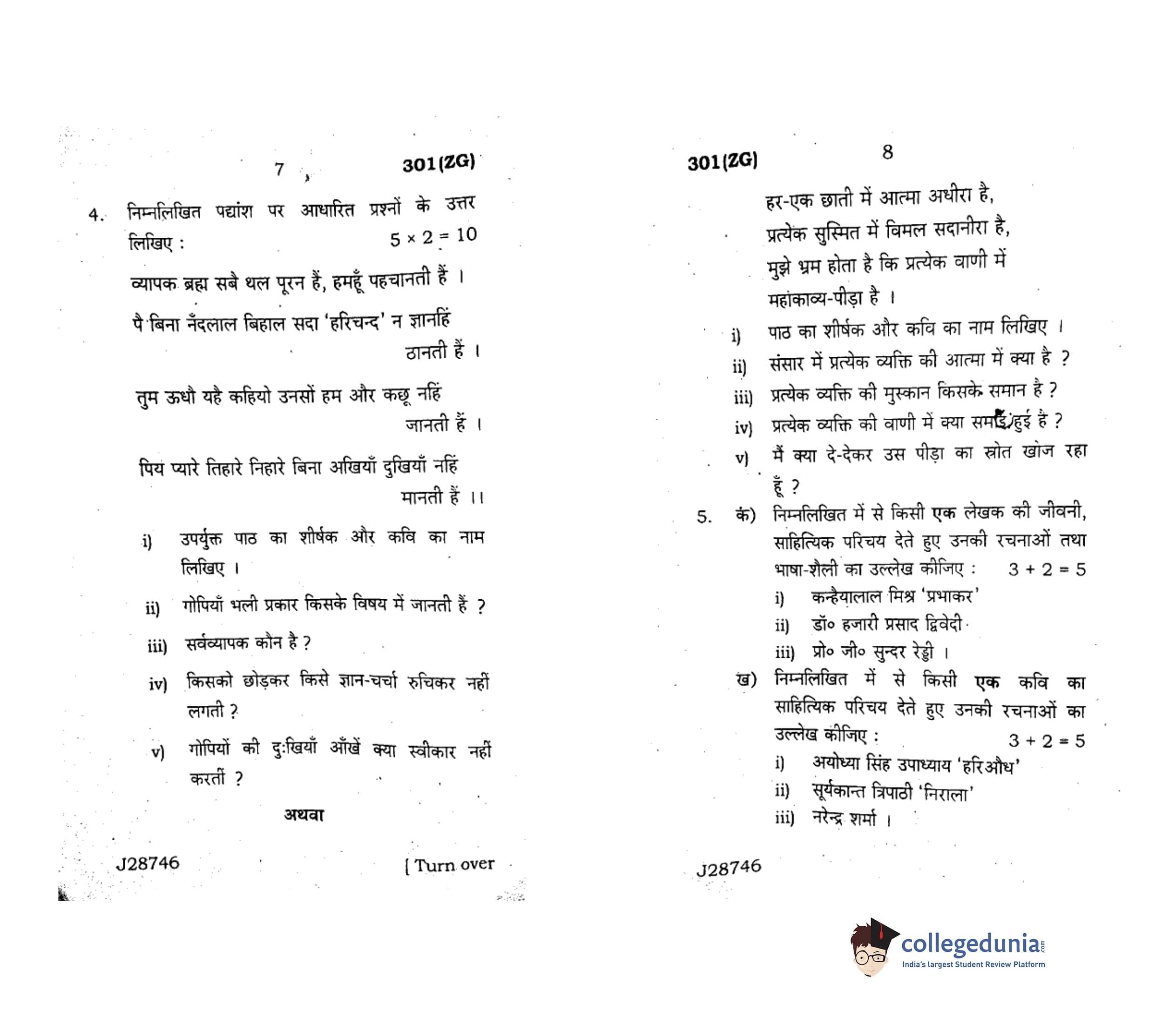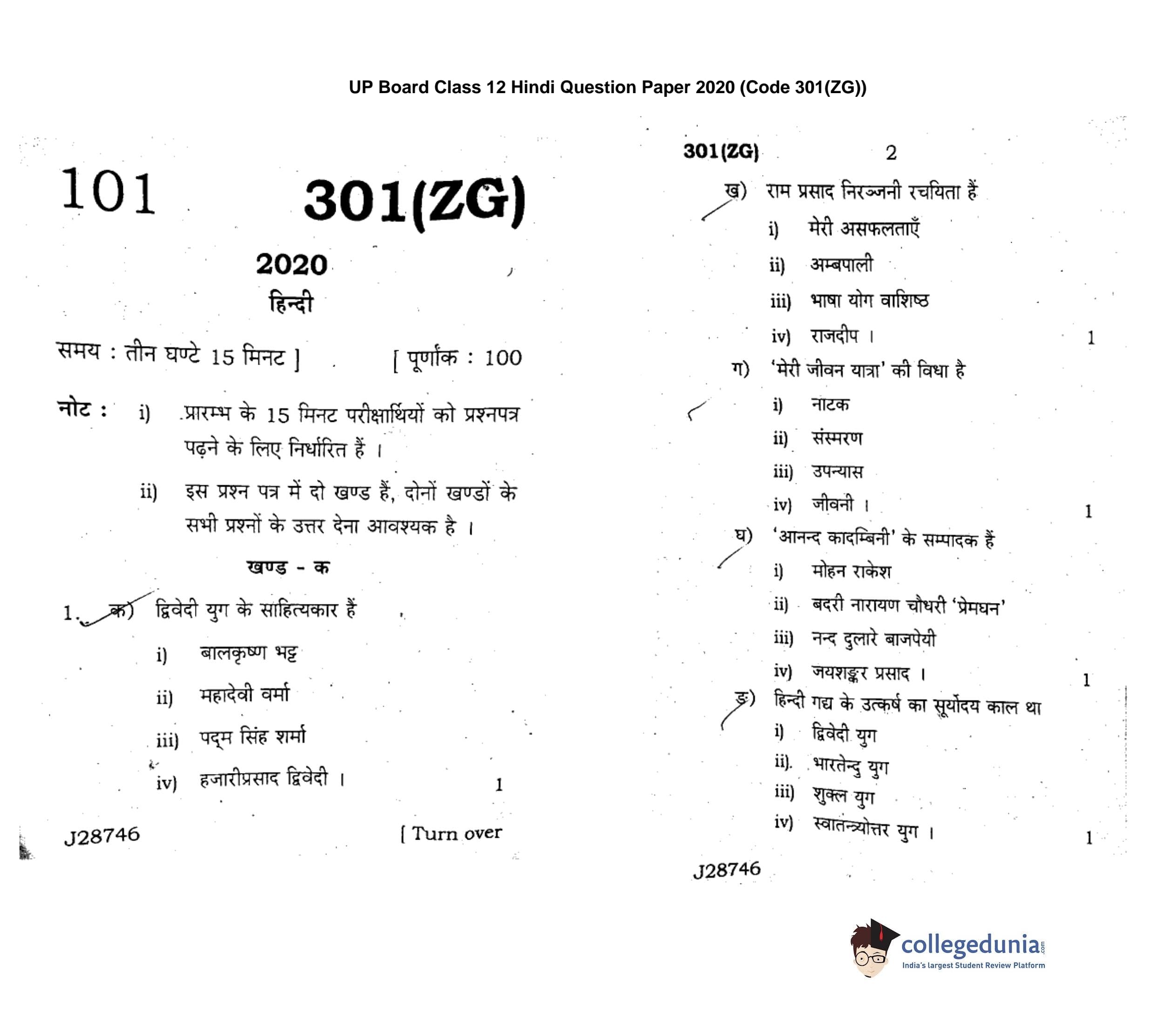 UP Board Class 12 Hindi Code 301(ZG) Question Paper 2020 with Answer Key (February 18)