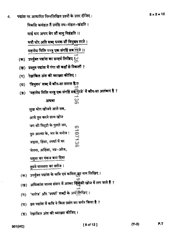 निम्नलिखित से ही किसी पंक्ति गंगों का संदर्भ देते हुए उसके नीचे अंकित प्रश्नों के उत्तर दीजिए : \( 5 \times 2 = 10 \)