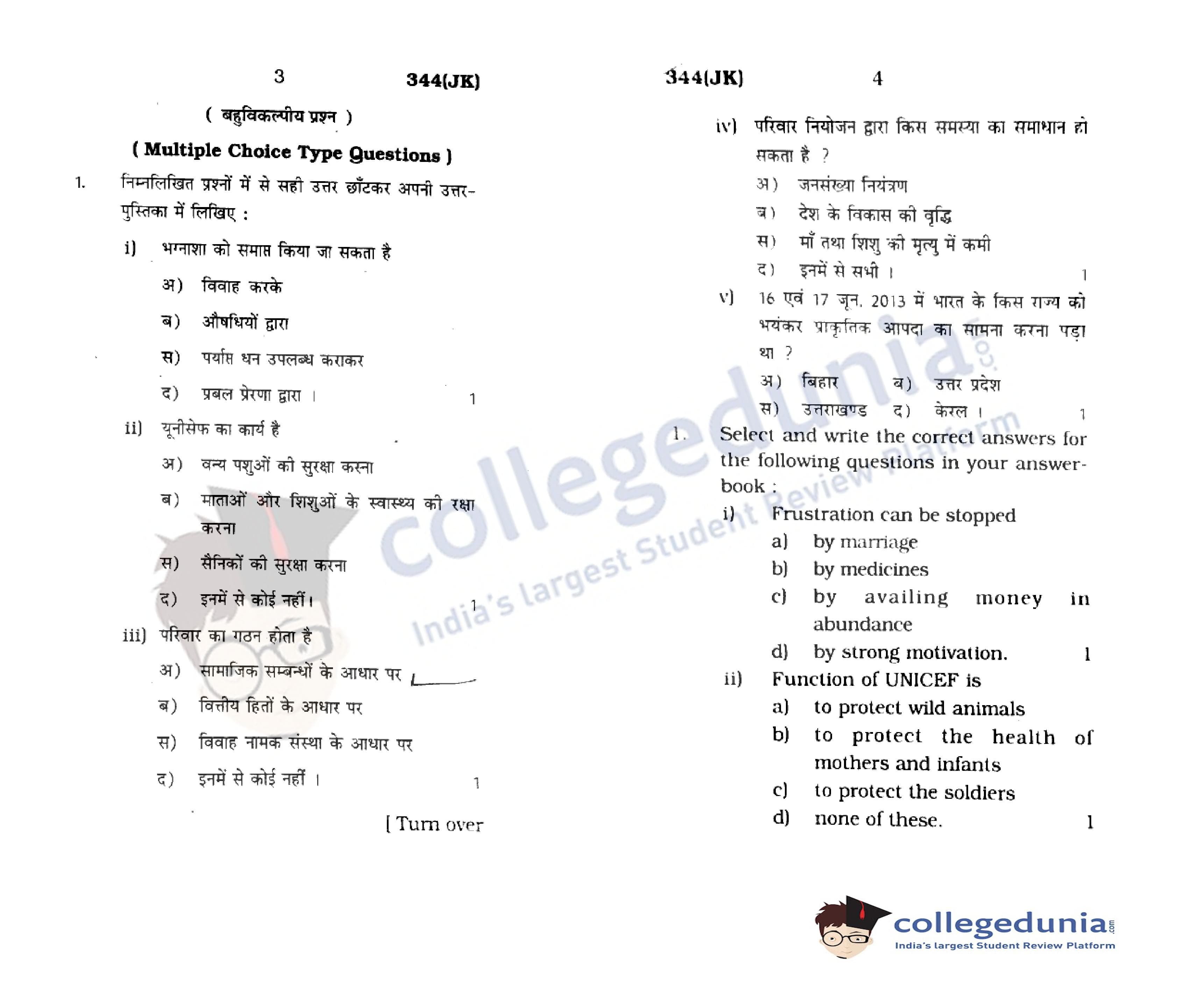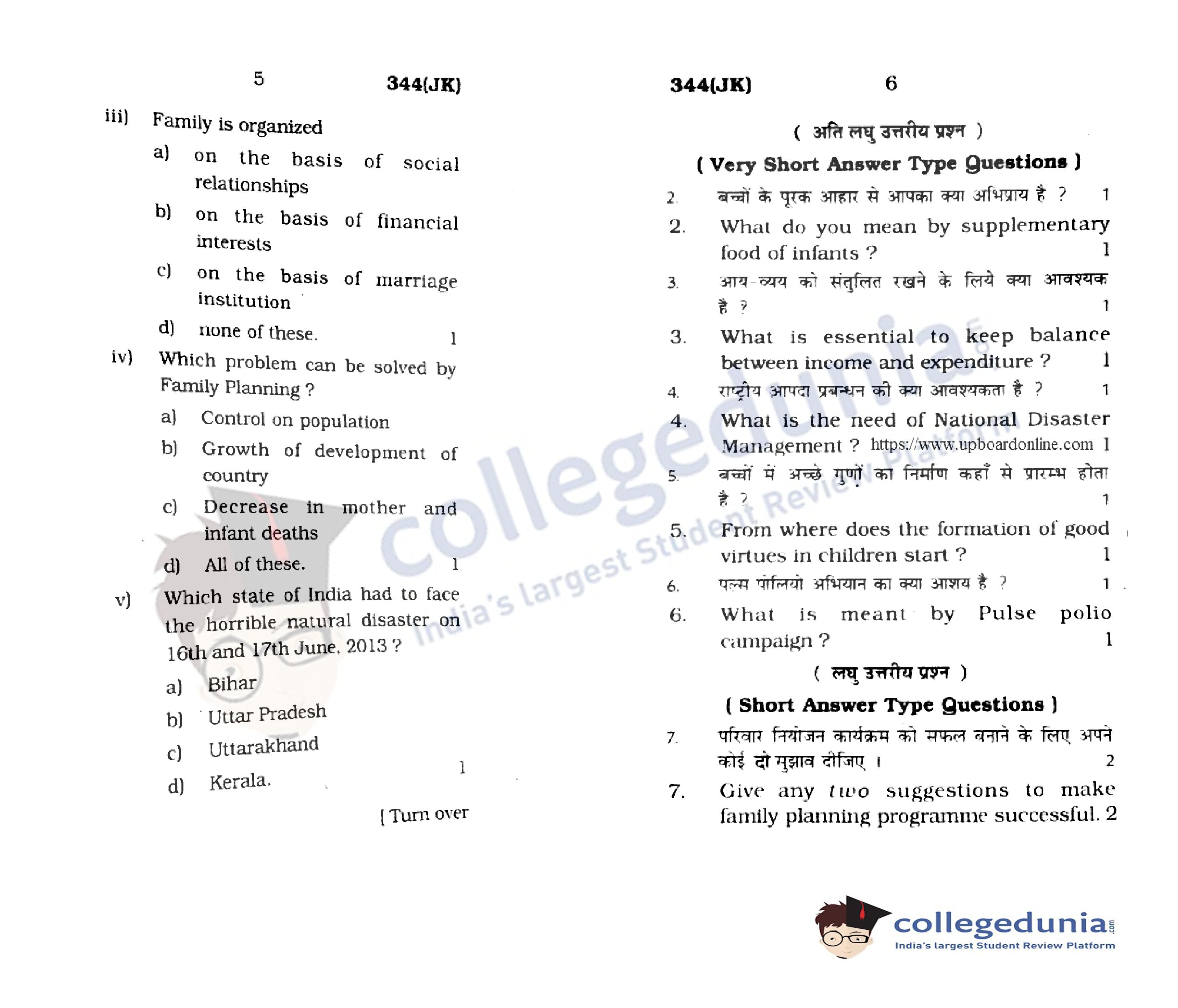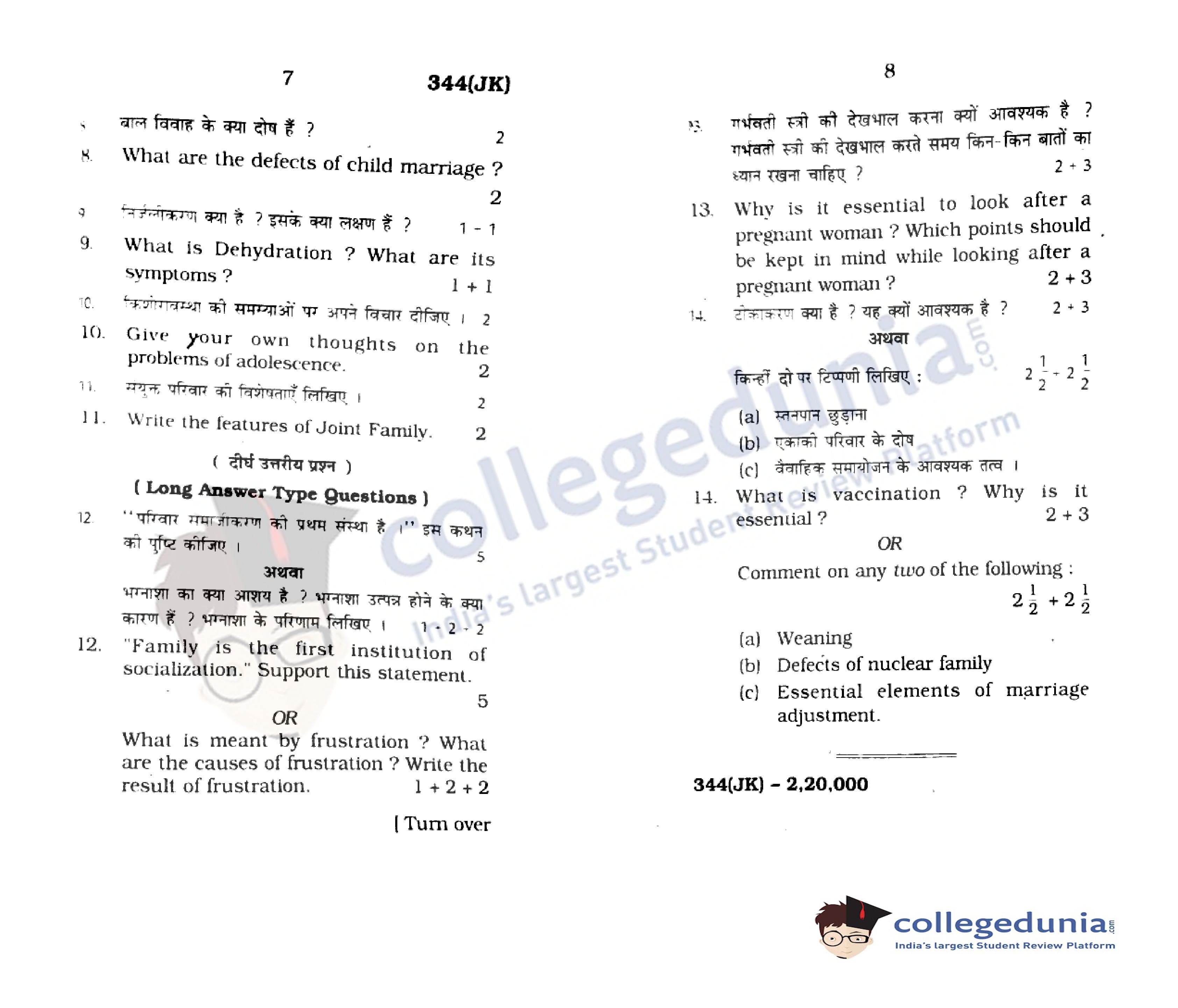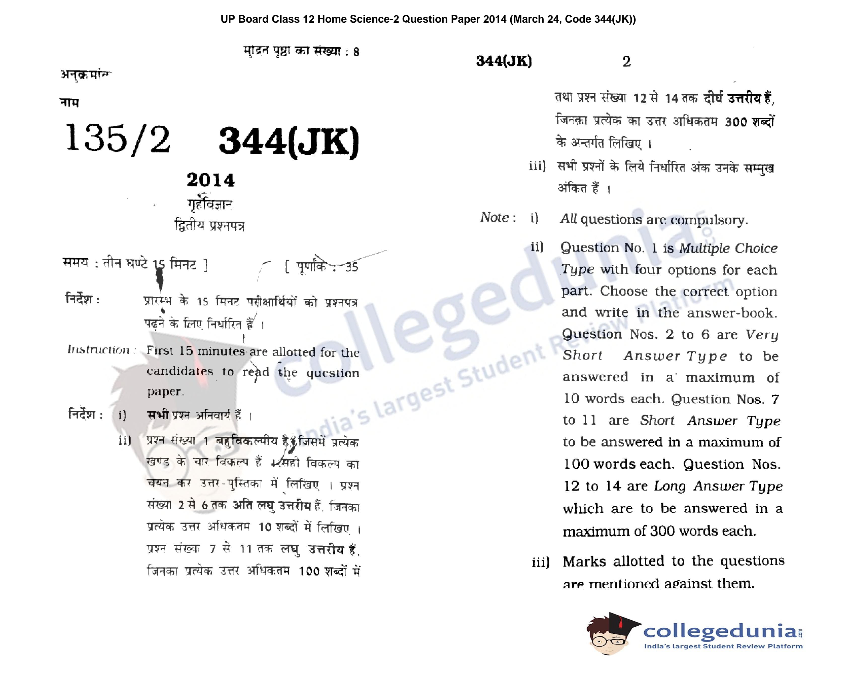 UP Board Class 12 Home Science-2 Question Paper 2014 with Answer Key Code 344(JK) is available for download. The exam was conducted by the Uttar Pradesh Madhyamik Shiksha Parishad (UPMSP) on March 24, 2014 in the Morning Session 7:30 AM to 10:45 AM. The medium of paper was English and Hindi. The question paper comprised a total of 14 questions.