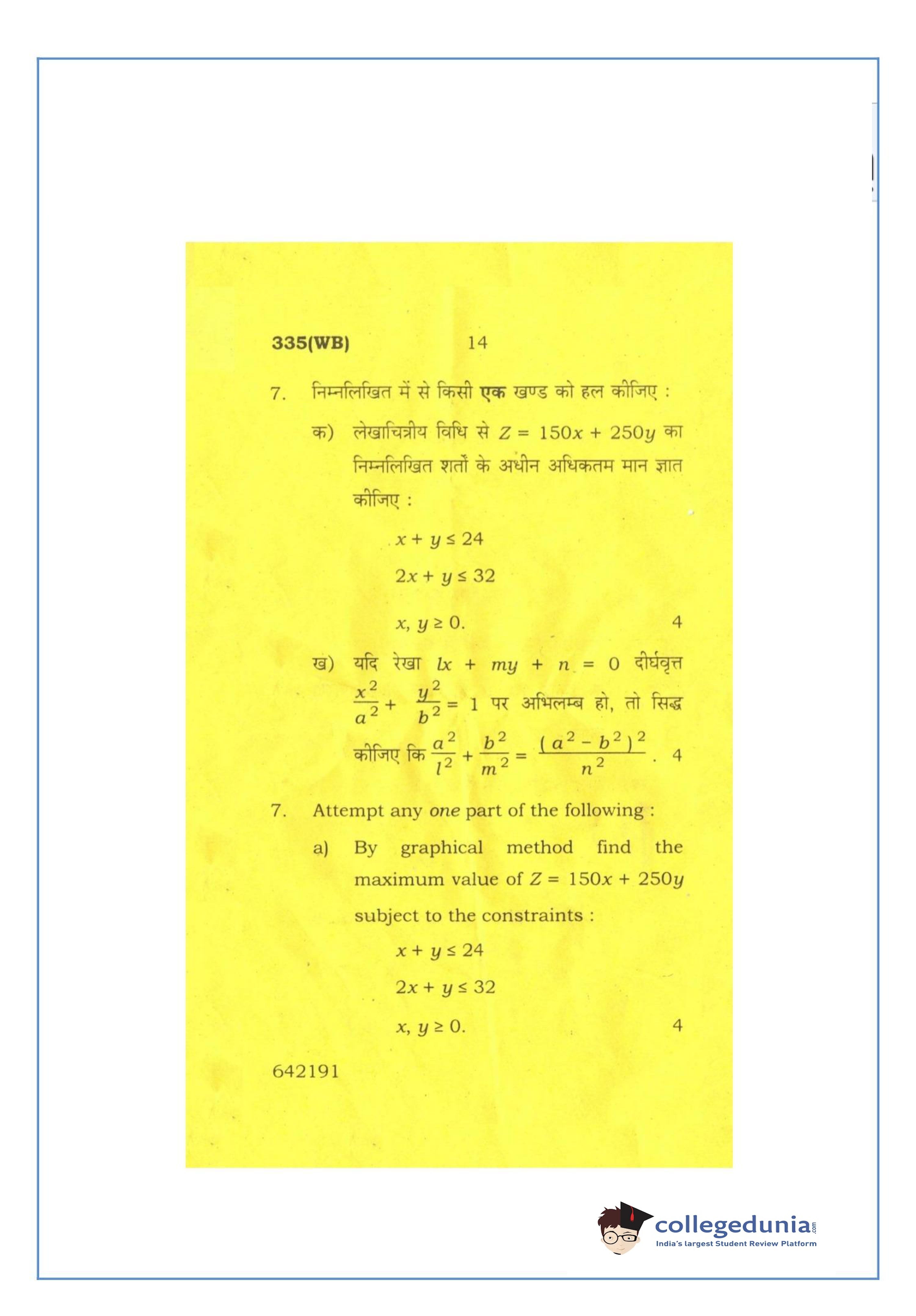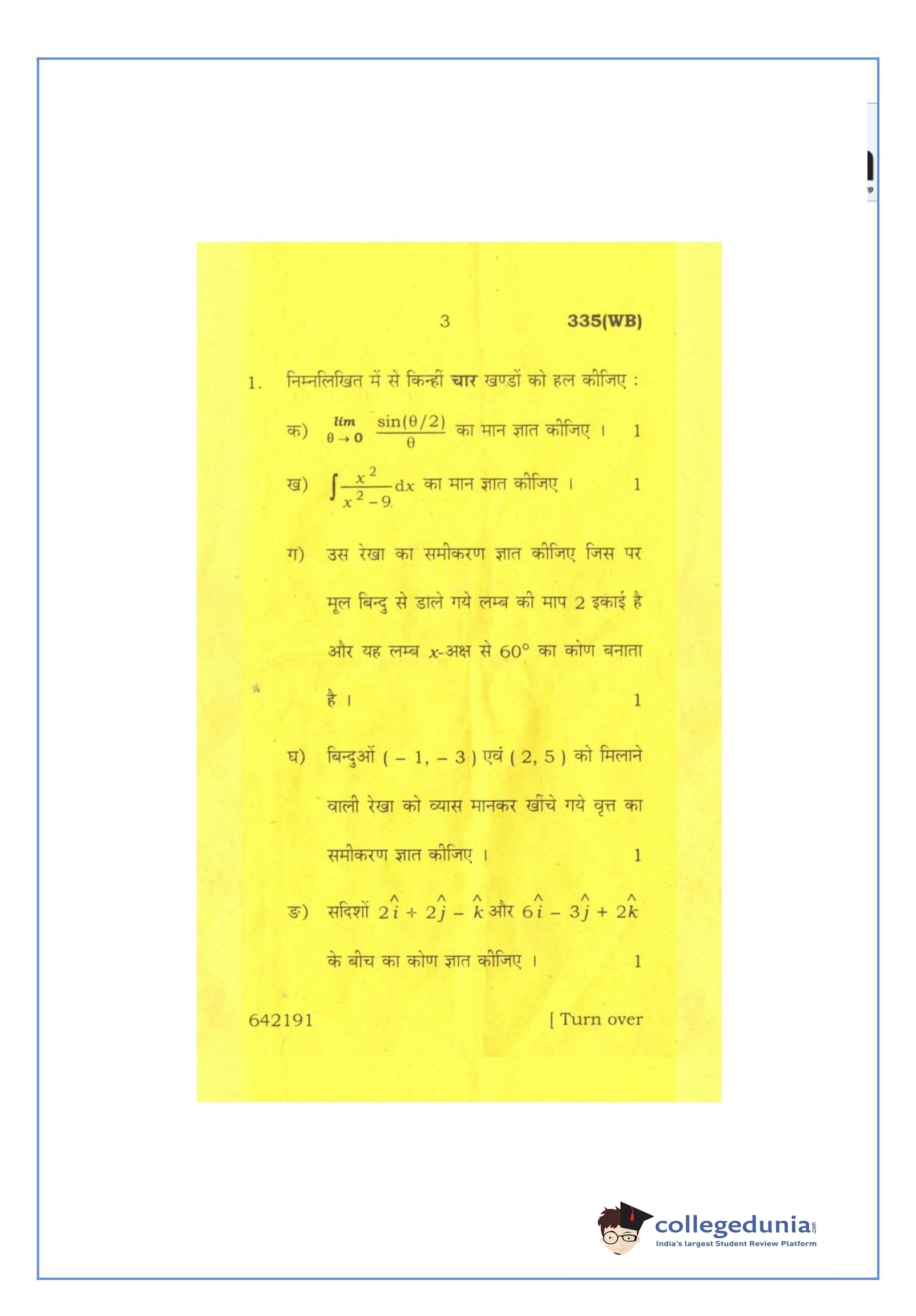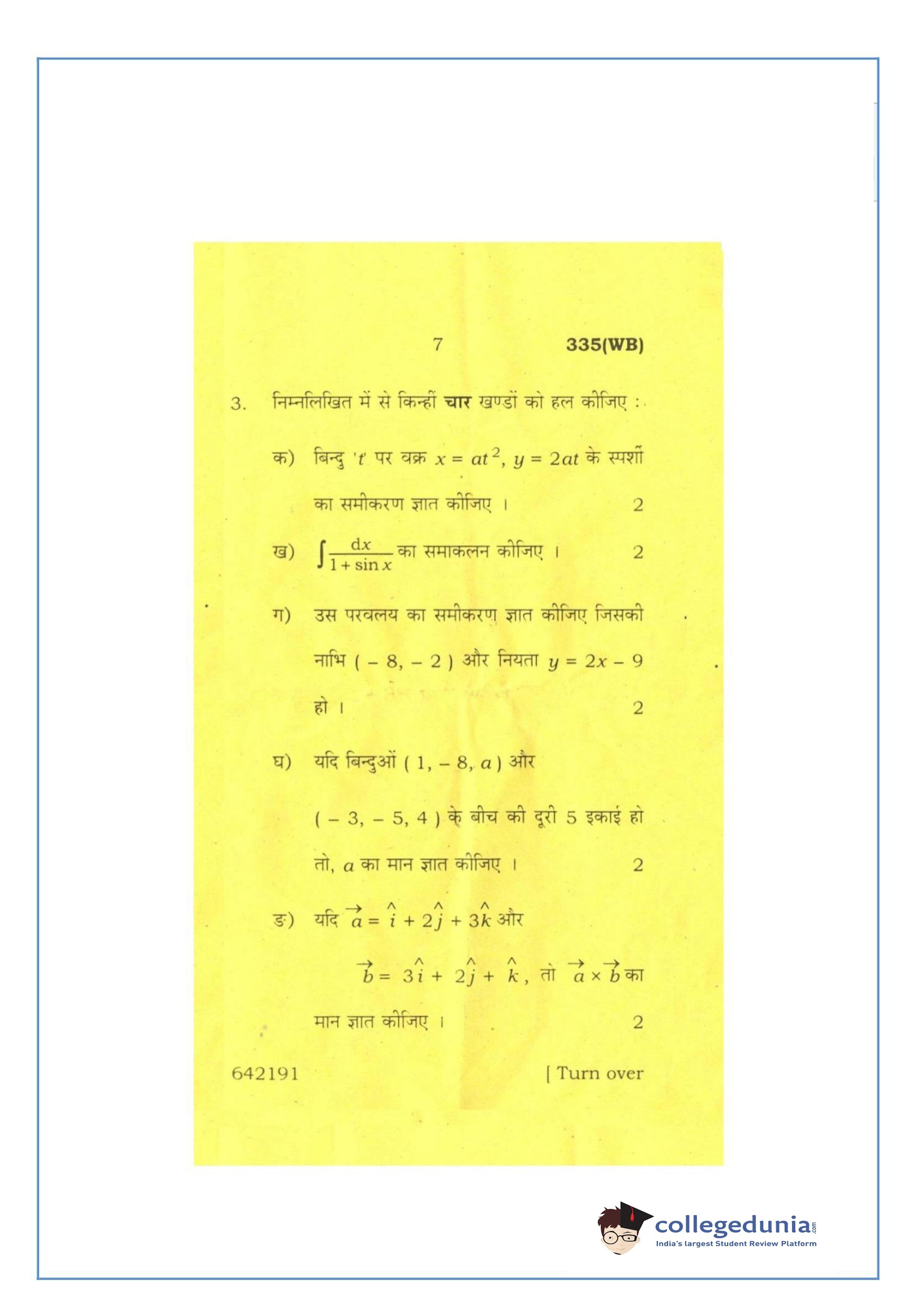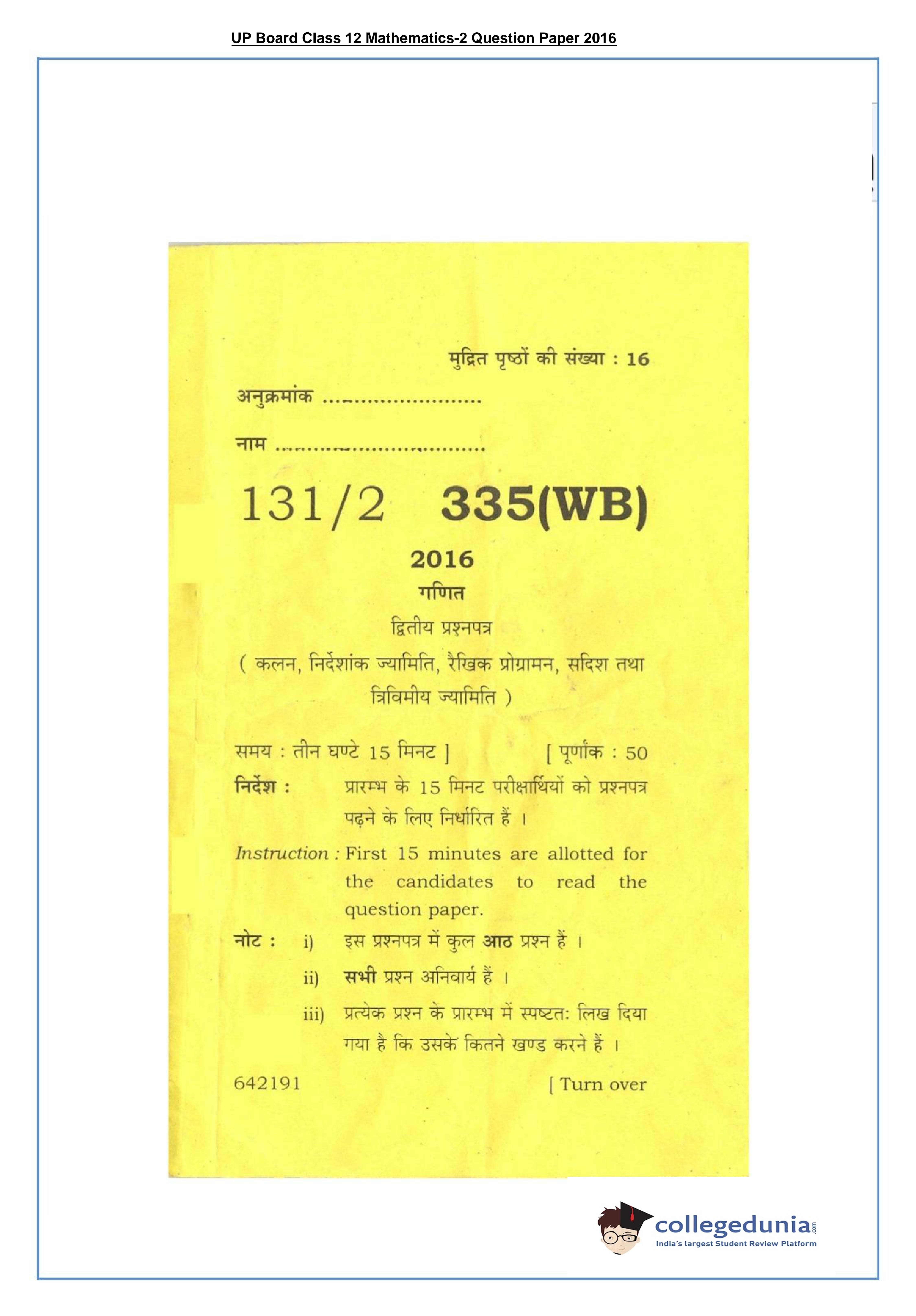 UP Board Class 12 Mathematics-2 Question Paper 2016 with Answer Key Code 335(WB) is available for download. The exam was conducted by the Uttar Pradesh Madhyamik Shiksha Parishad (UPMSP) on March 12, 2016 in the Afternoon Session 2 PM to 5:15 PM. The medium of paper was English and Hindi. The question paper comprised a total of 8 questions.