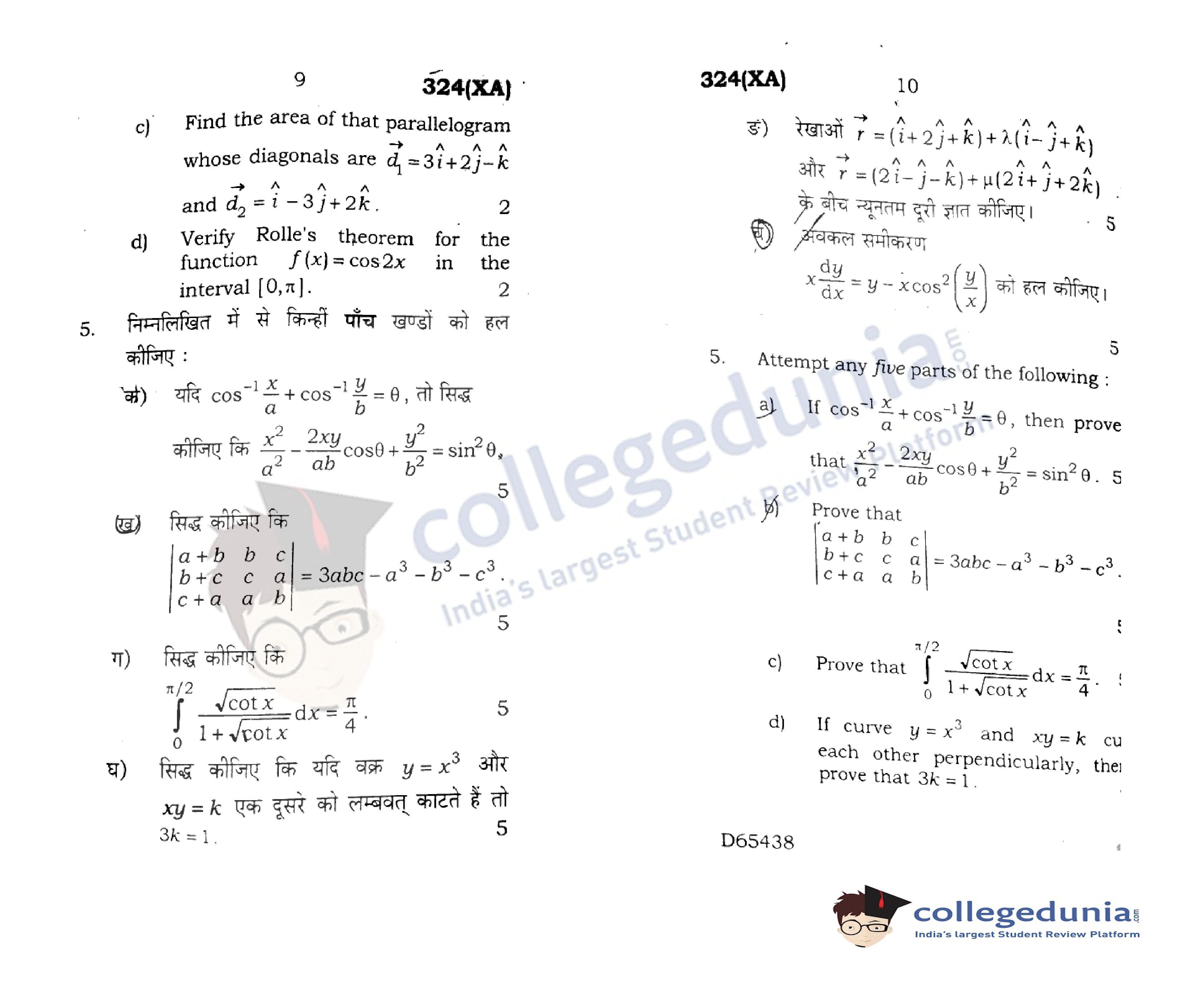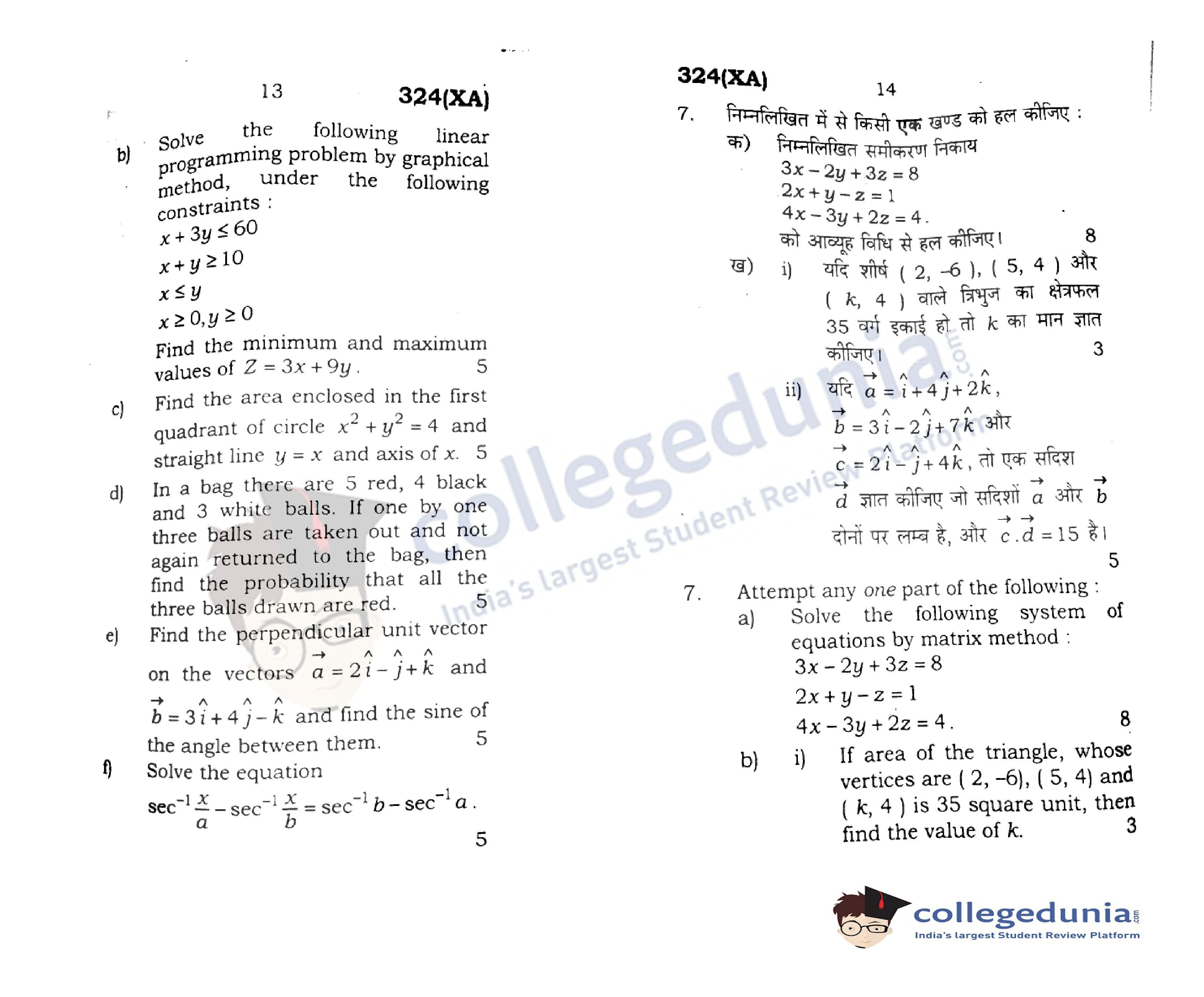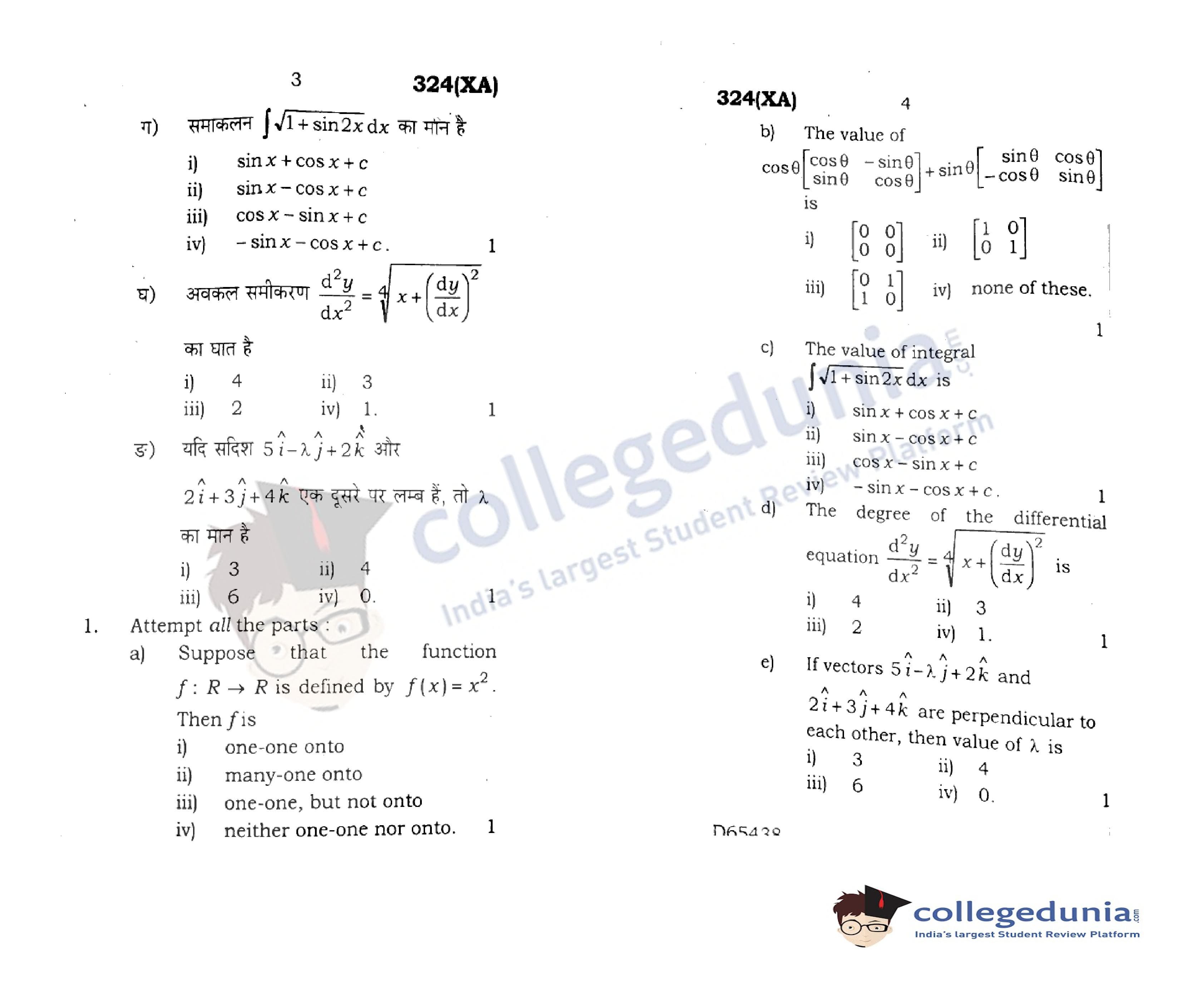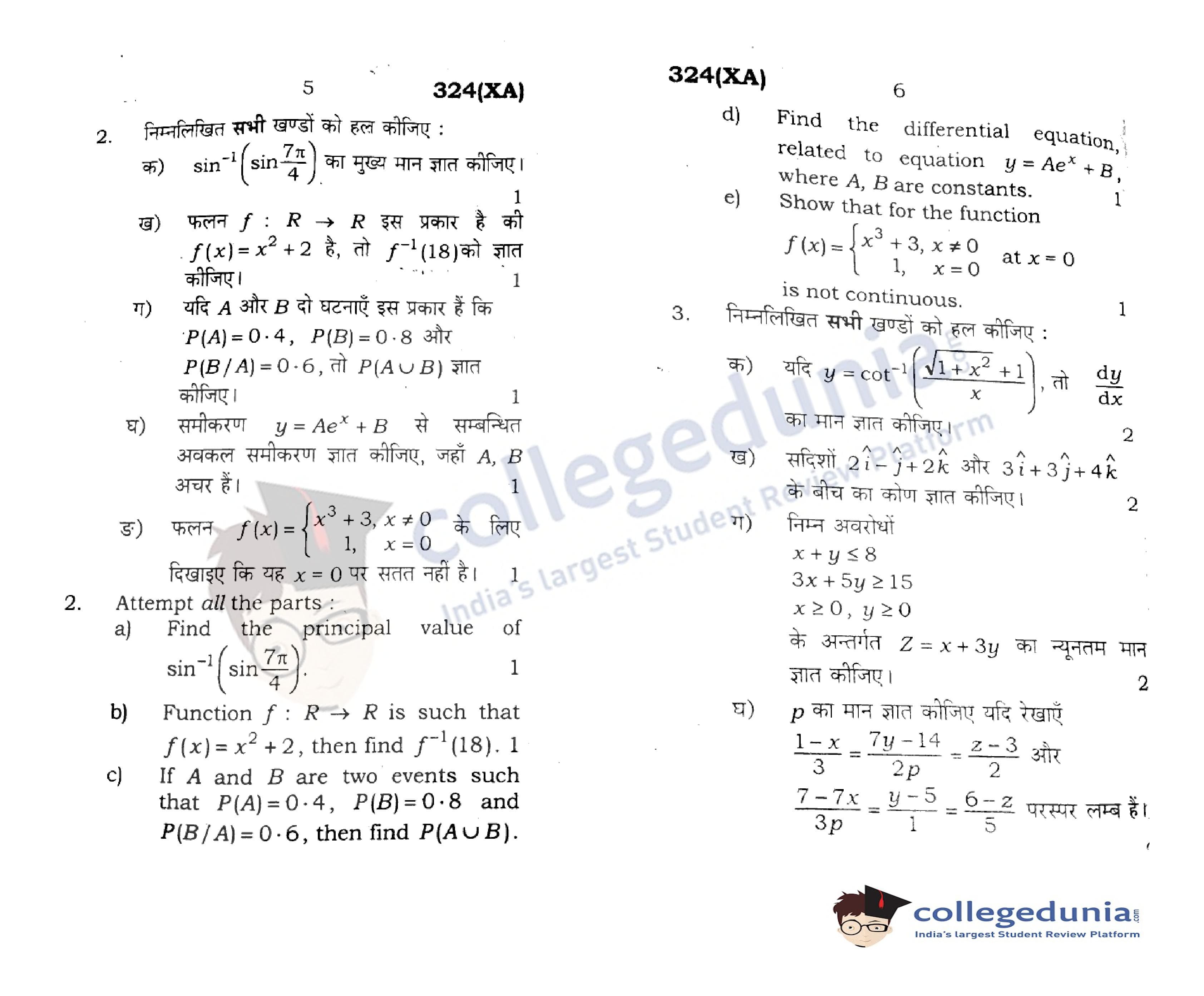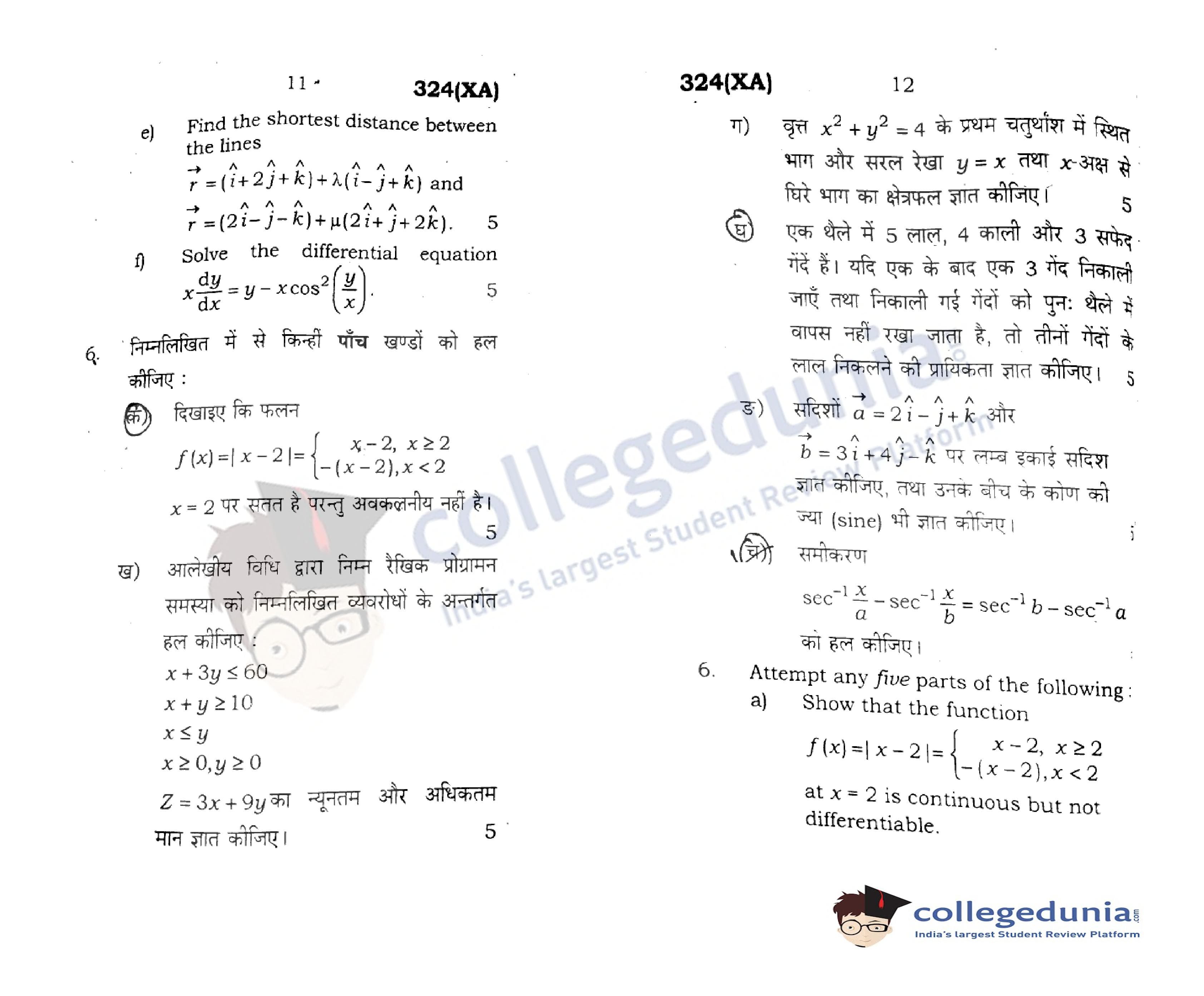 UP Board Class 12 Mathematics Code 324(XA) Question Paper 2020 with Answer Key (February 29)