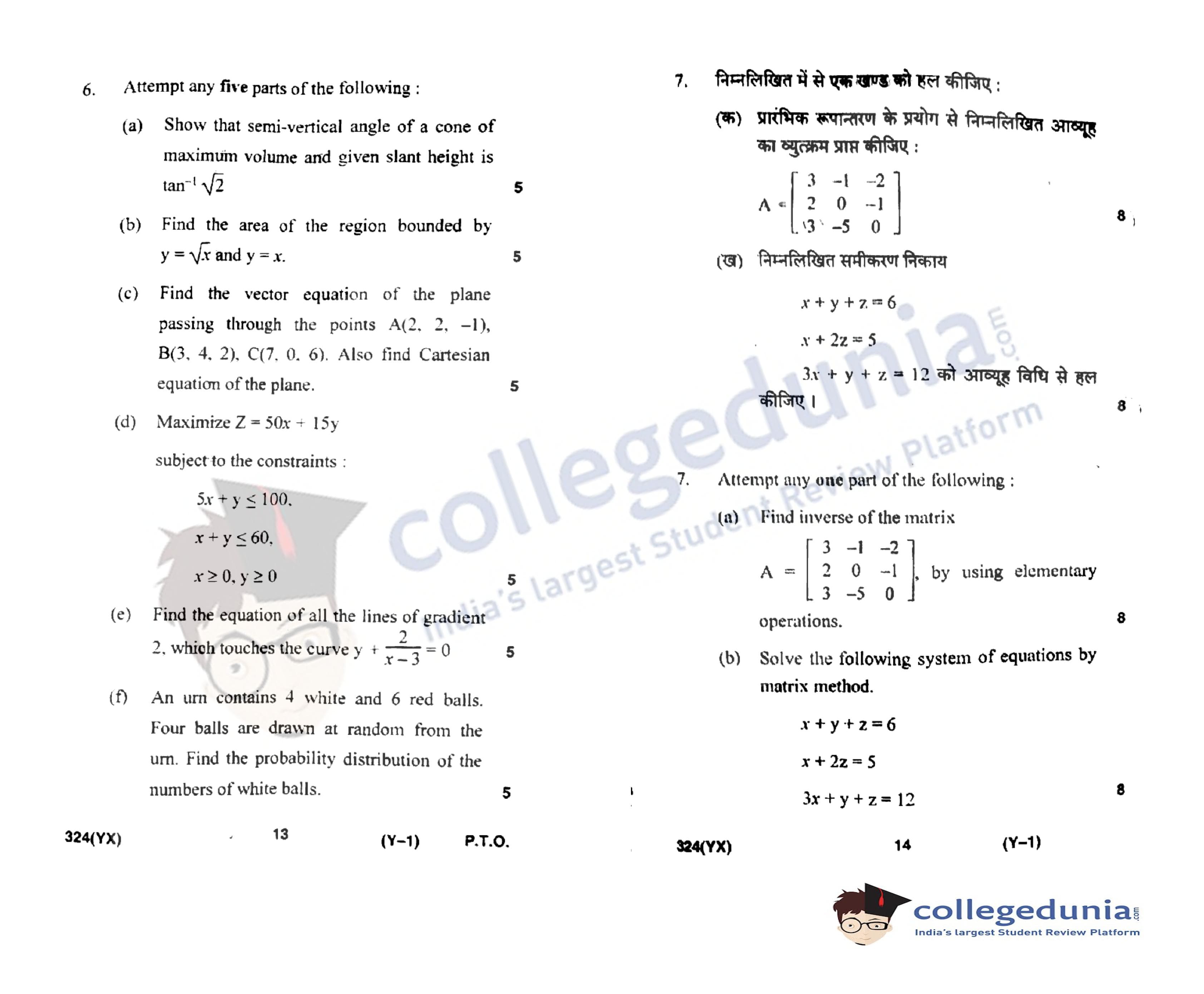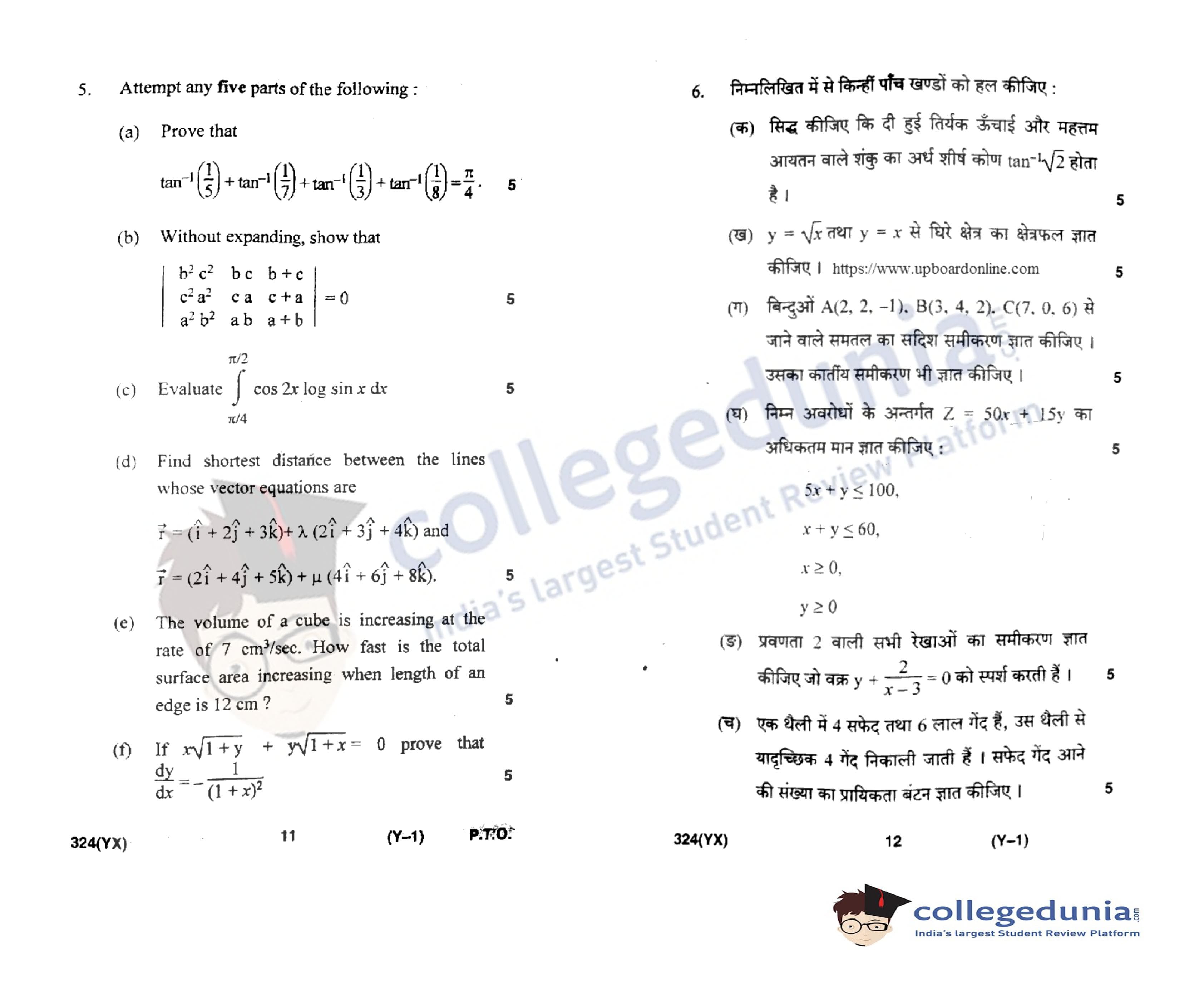 UP Board Class 12 Mathematics Code 324(YX) Question Paper 2020 with Answer Key (February 29)