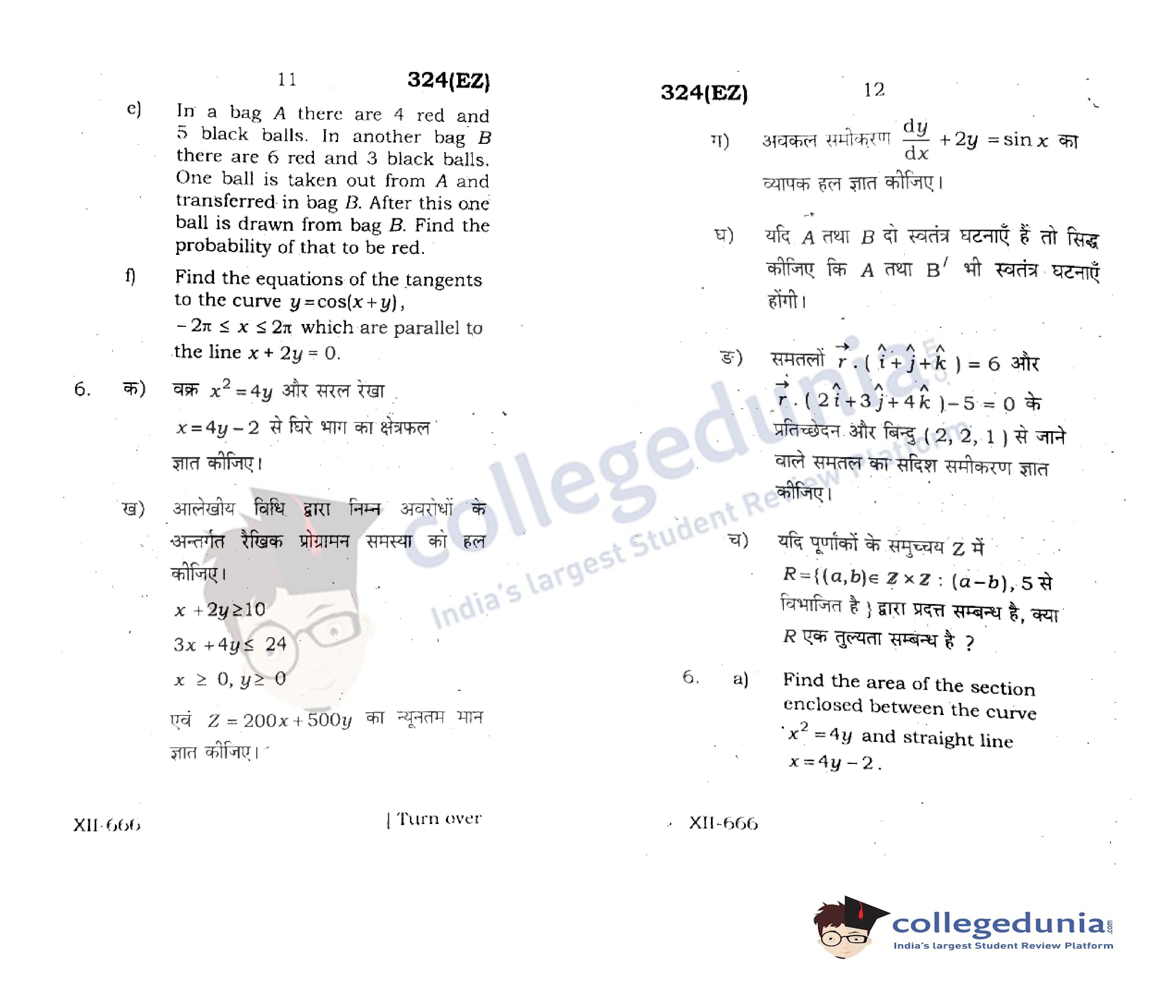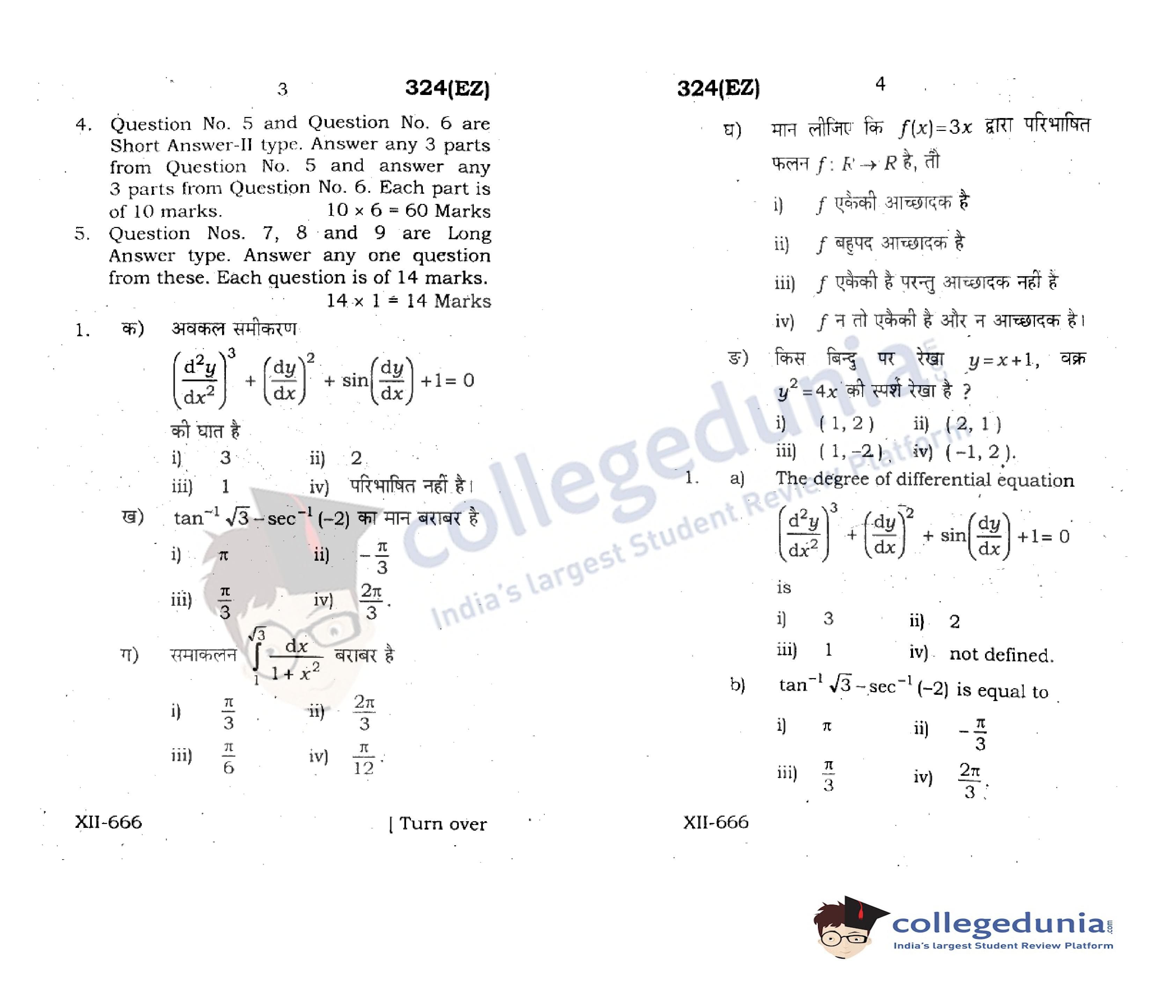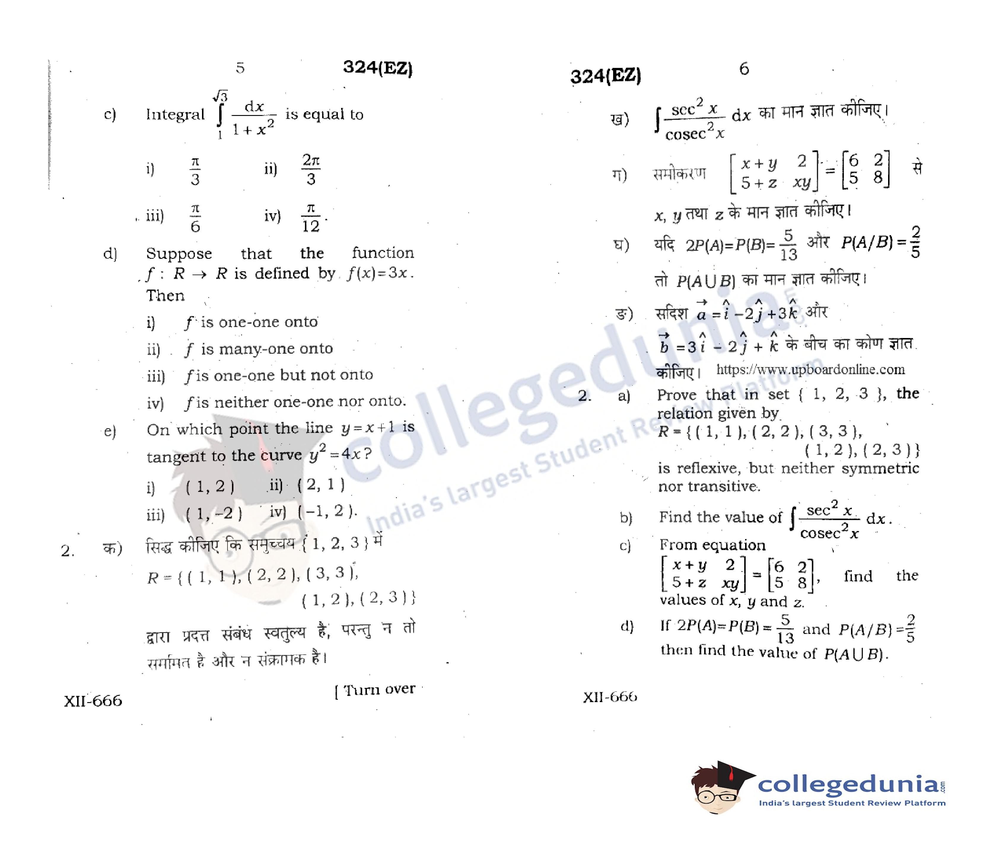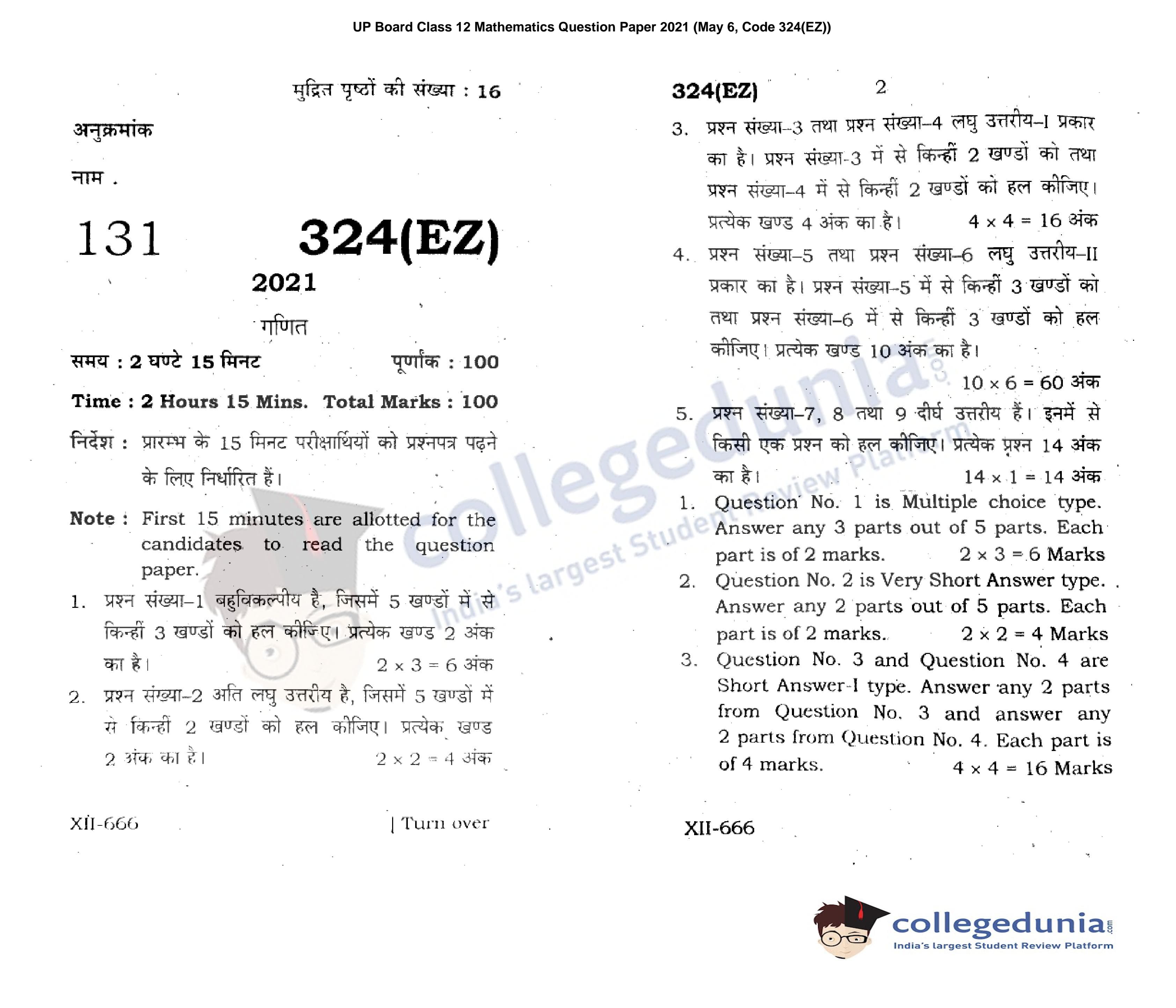 UP Board Class 12 Mathematics Question Paper 2021 with Answer Key Code 324(EZ) is available for download. The exam was conducted by the Uttar Pradesh Madhyamik Shiksha Parishad (UPMSP) on May 6, 2021 in the Afternoon Session 2 PM to 5:15 PM. The medium of paper was English and Hindi. The question paper comprised a total of 9 questions.