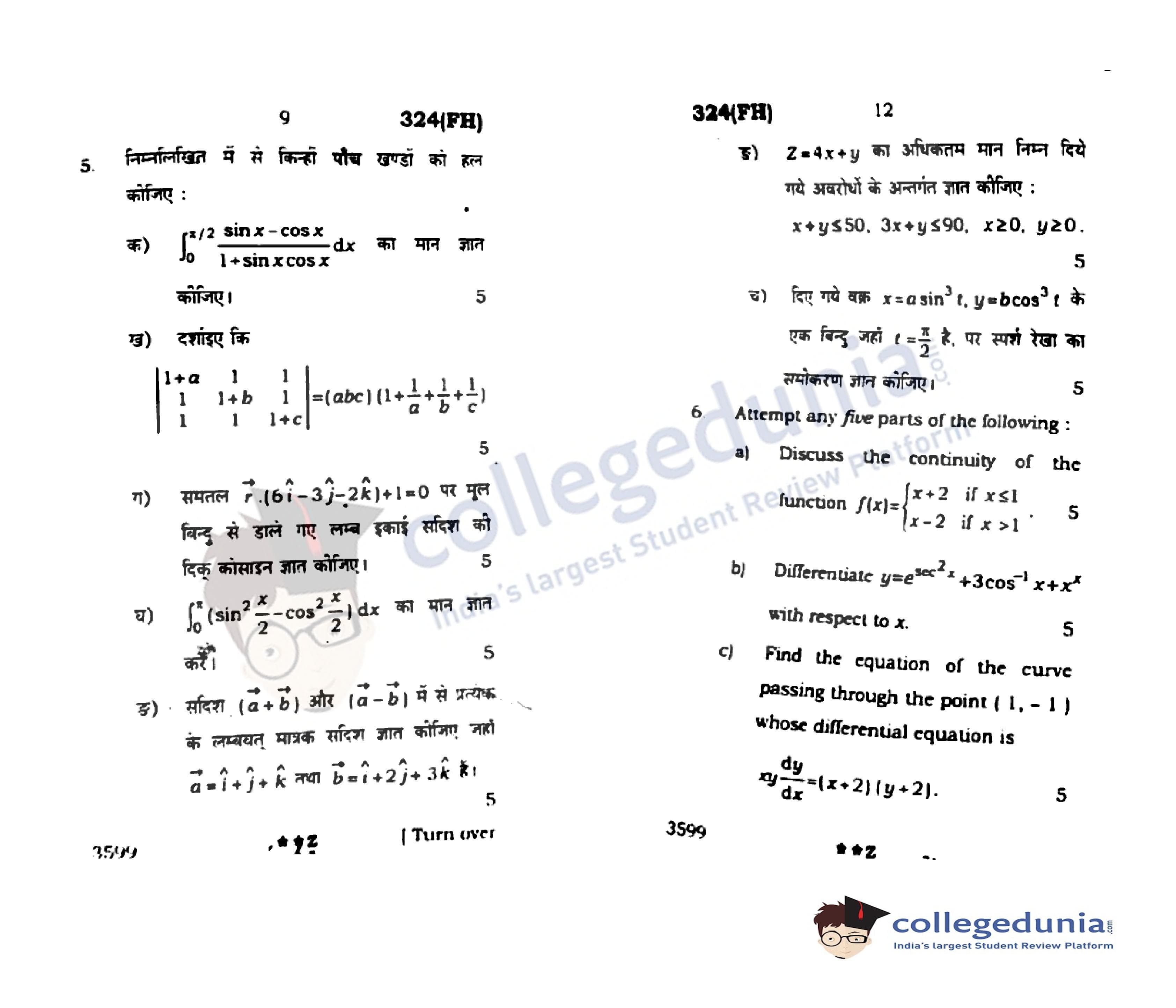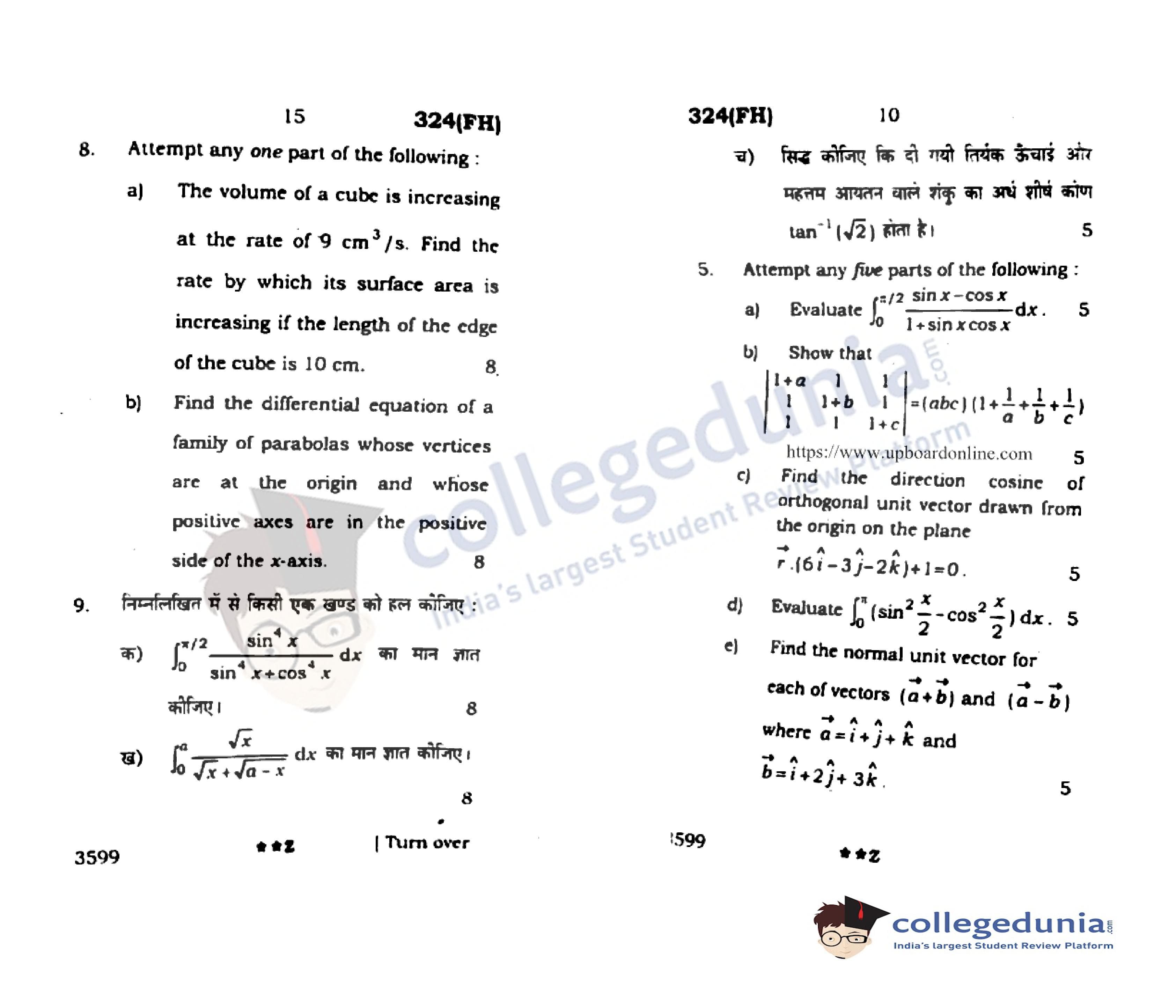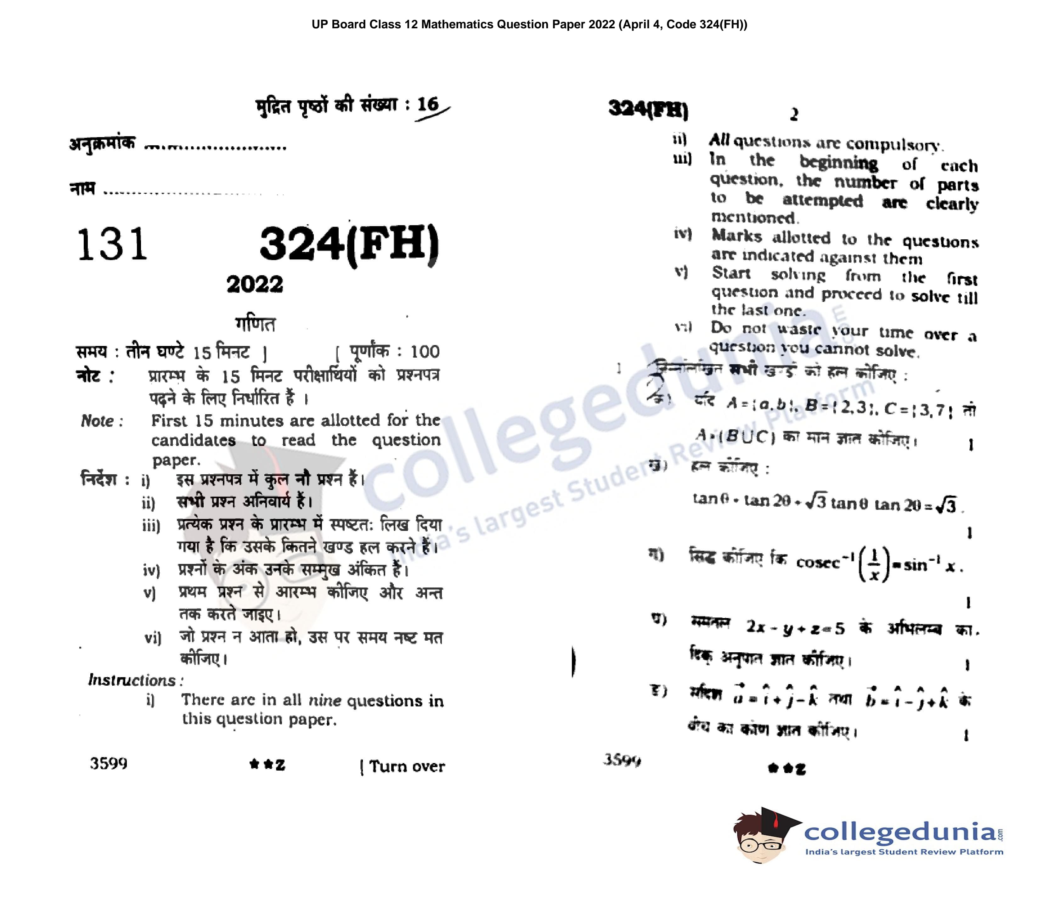 UP Board Class 12 Mathematics Question Paper 2022 with Answer Key Code 324(FH) is available for download. The exam was conducted by the Uttar Pradesh Madhyamik Shiksha Parishad (UPMSP) on April 4, 2022 in the Afternoon Session 2 PM to 5:15 PM. The medium of paper was English and Hindi. The question paper comprised a total of 9 questions.