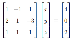 Thus, the solution to the system of equations is \( x = 3, y = -1, z = 2 \). Quick Tip: When solving systems of linear equations using matrices, represent the system in matrix form, calculate the inverse of the coefficient matrix, and multiply by the constant vector to get the solution.