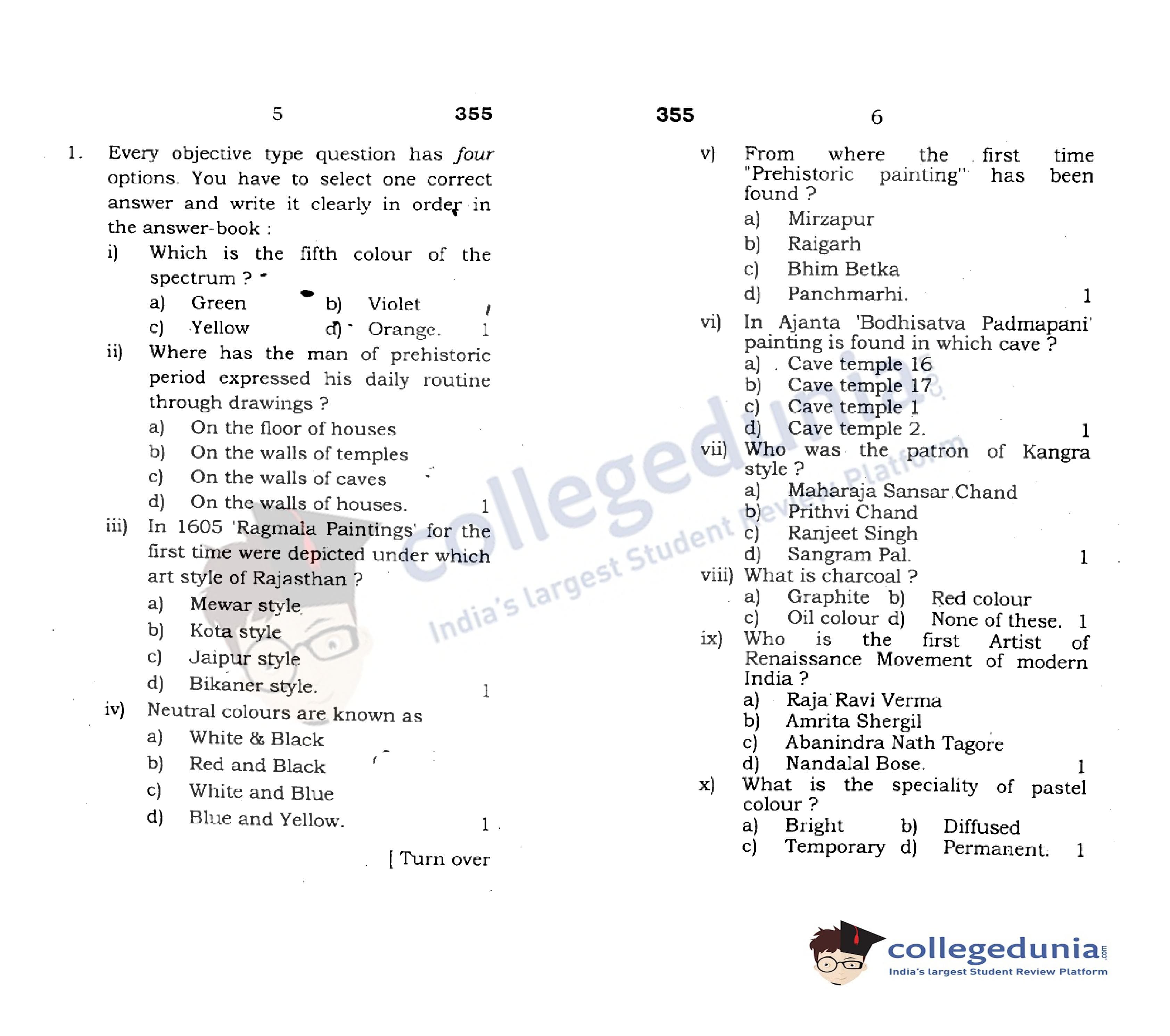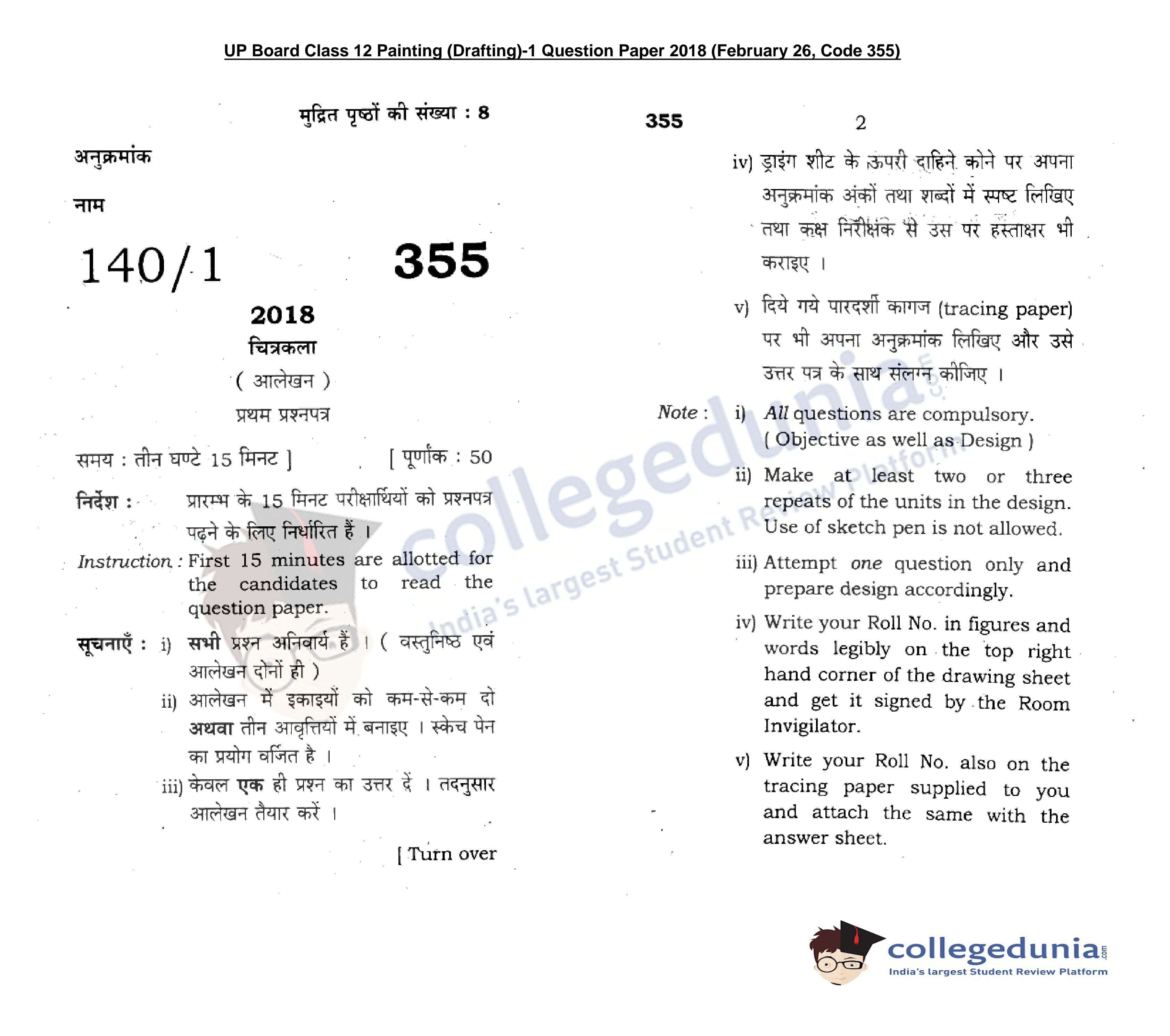 UP Board Class 12 Painting (Drafting)-1 Code 355 Question Paper 2018 with Answer Key (February 26)