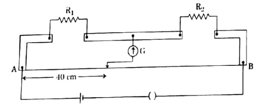The circuit diagram of a balanced meter bridge is shown in the figure. The balanced point is obtained at \(40 \, cm\) from the end A. When a \(10 \, \Omega\) resistor is joined in series with \(R_1\), the balanced point is obtained at \(40 \, cm\) from the end B. Find the values of \(R_1\) and \(R_2\).