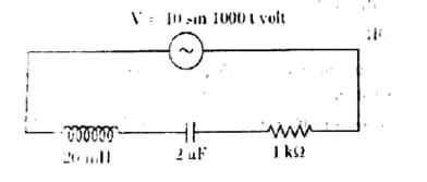 In an A.C. circuit, potential difference and current are given as, \[ V = 100 \sin(100t) \, volts, \quad i = 100 \sin\left(100t + \frac{\pi}{3}\right) \, mA. \]