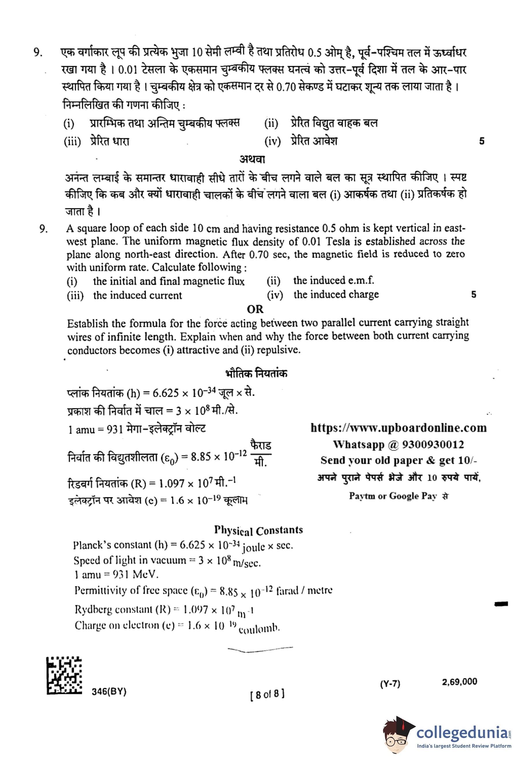 UP Board Class 12 Physics Question Paper 2023 with Answer Key Code 346 BY is available for download. The exam was conducted by the Uttar Pradesh Madhyamik Shiksha Parishad (UPMSP) on March 1, 2023 in Afternoon Session 2 PM to 5:15 PM. The medium of paper was English and Hindi. In terms of difficulty level, UP Board Class 12 Physics paper was Easy. The question paper comprised a total of 9 questions.
