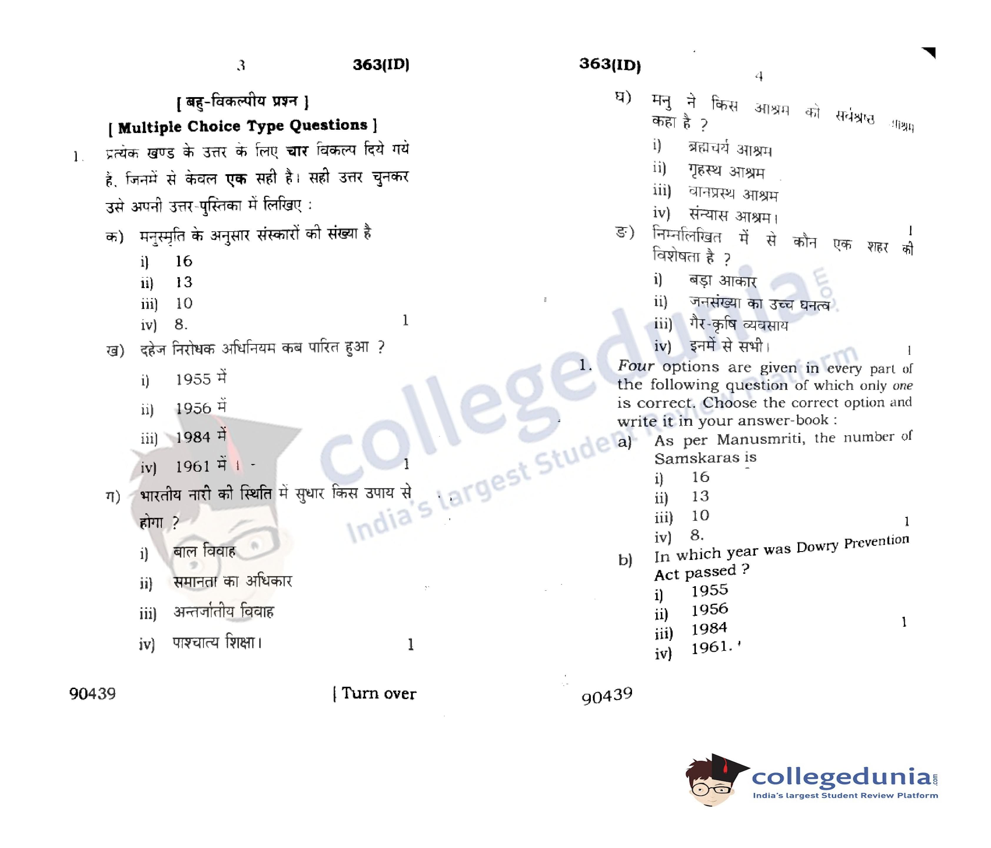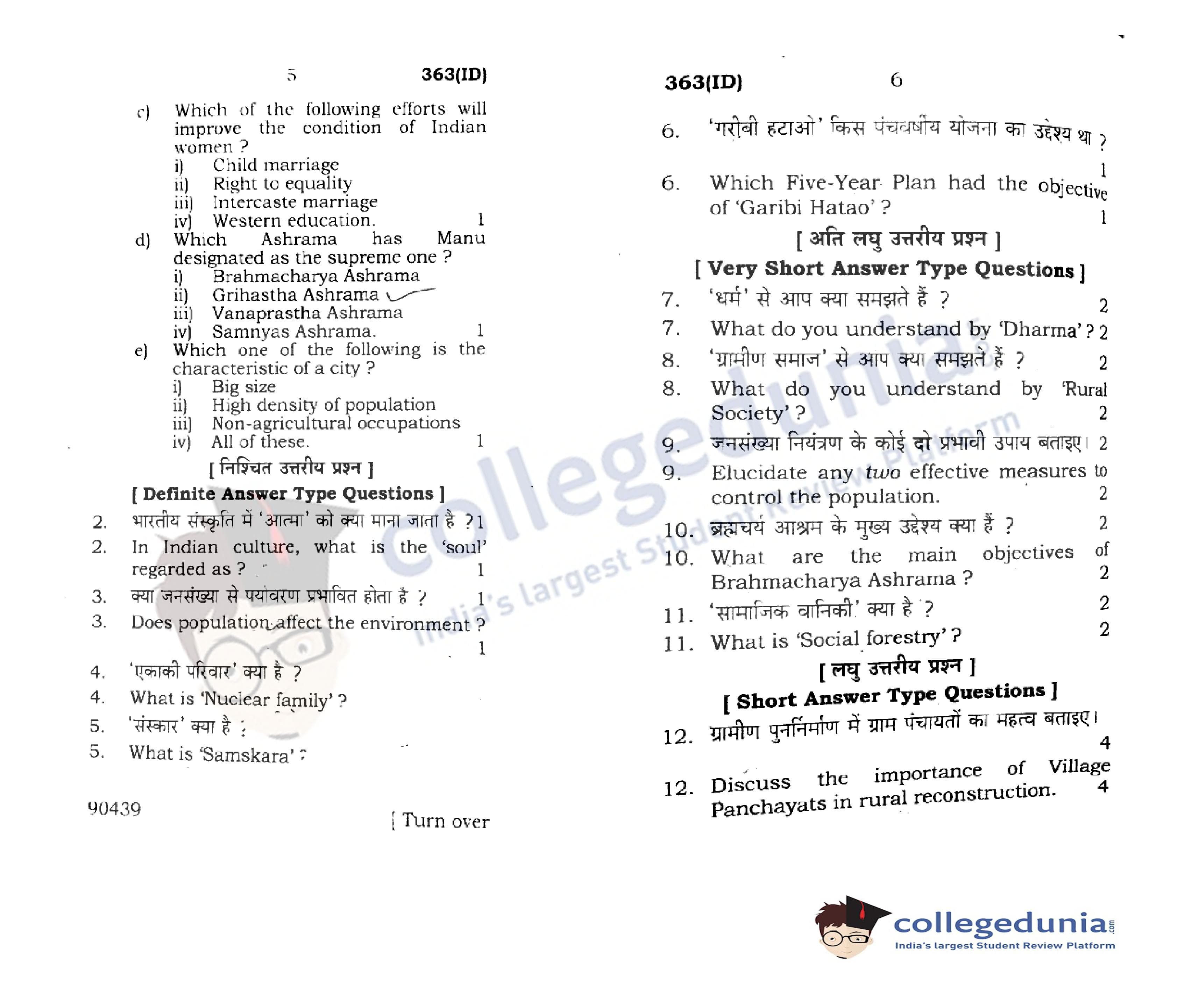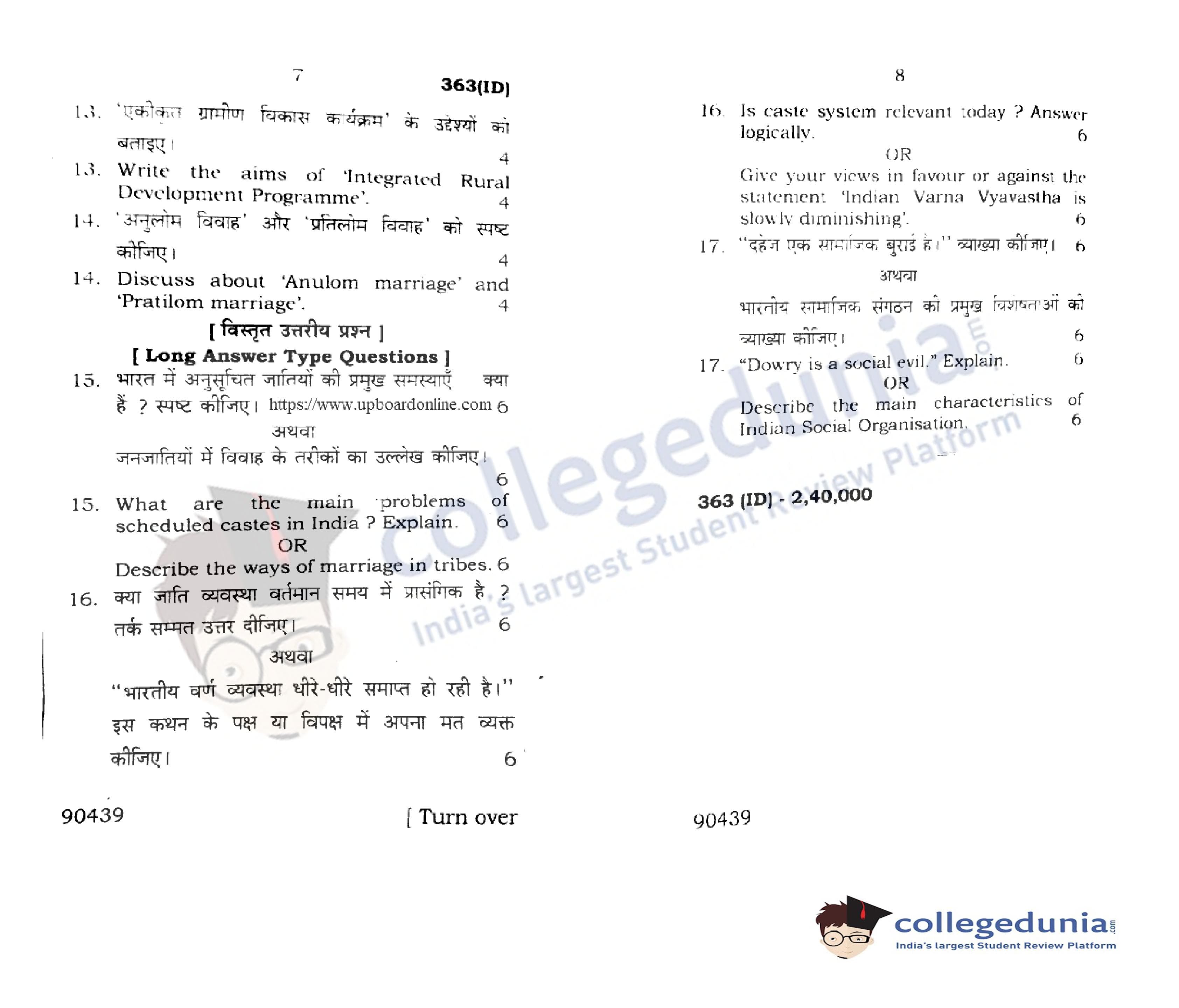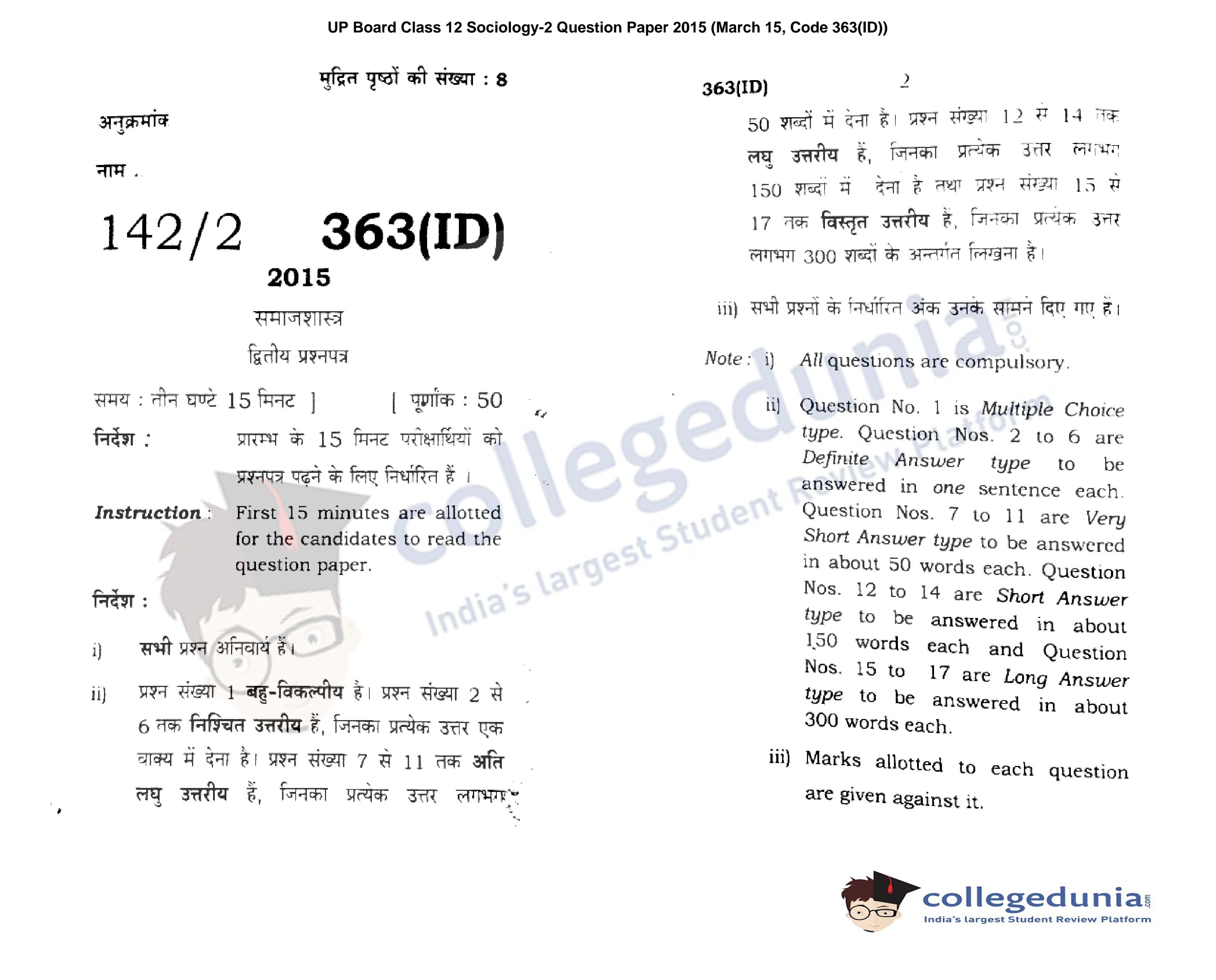 UP Board Class 12 Sociology-2 Question Paper 2015 with Answer Key Code 363(ID) is available for download. The exam was conducted by the Uttar Pradesh Madhyamik Shiksha Parishad (UPMSP) on March 15, 2015 in the Morning Session 7:30 AM to 10:45 AM. The medium of paper was English and Hindi. The question paper comprised a total of 17 questions.