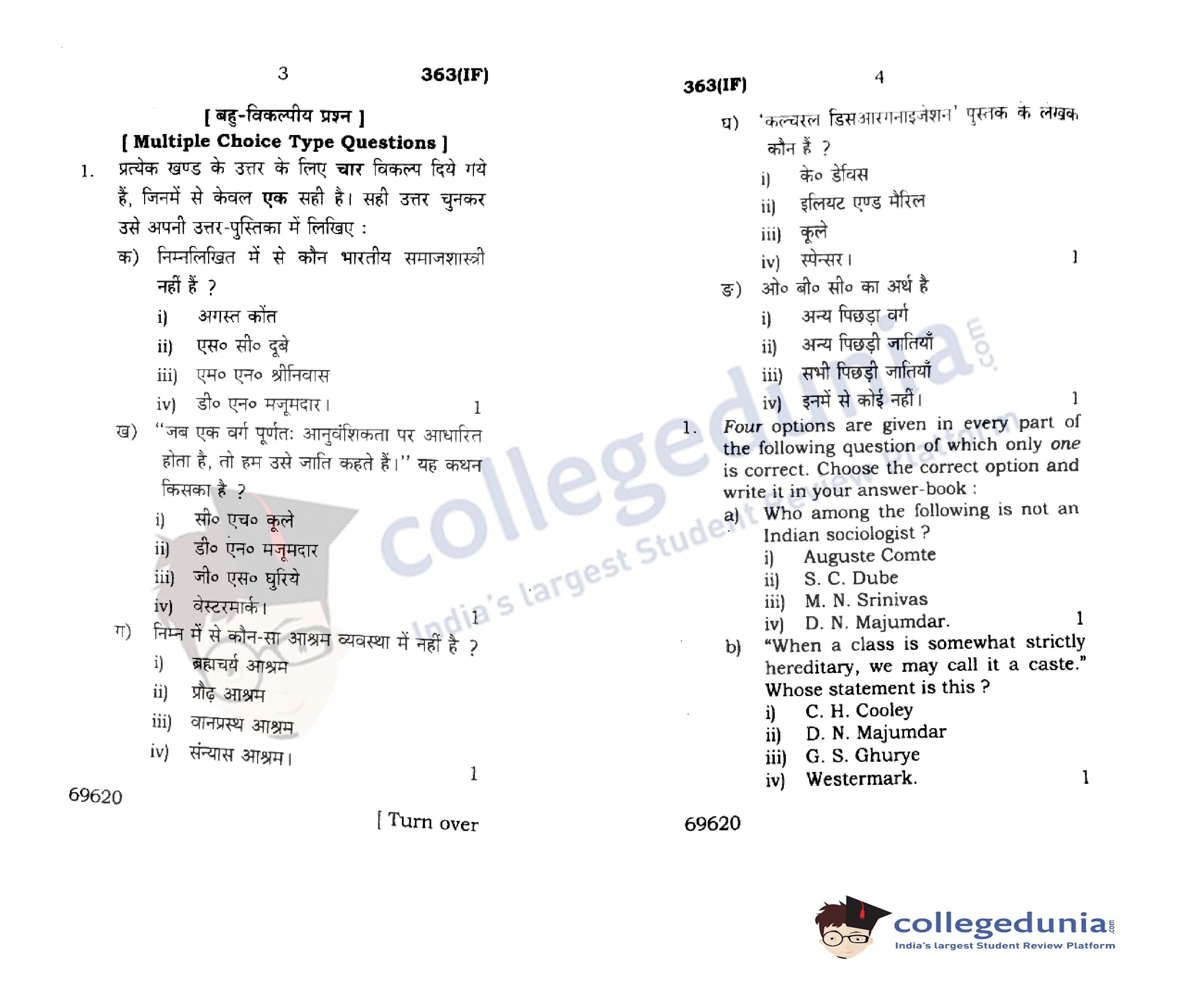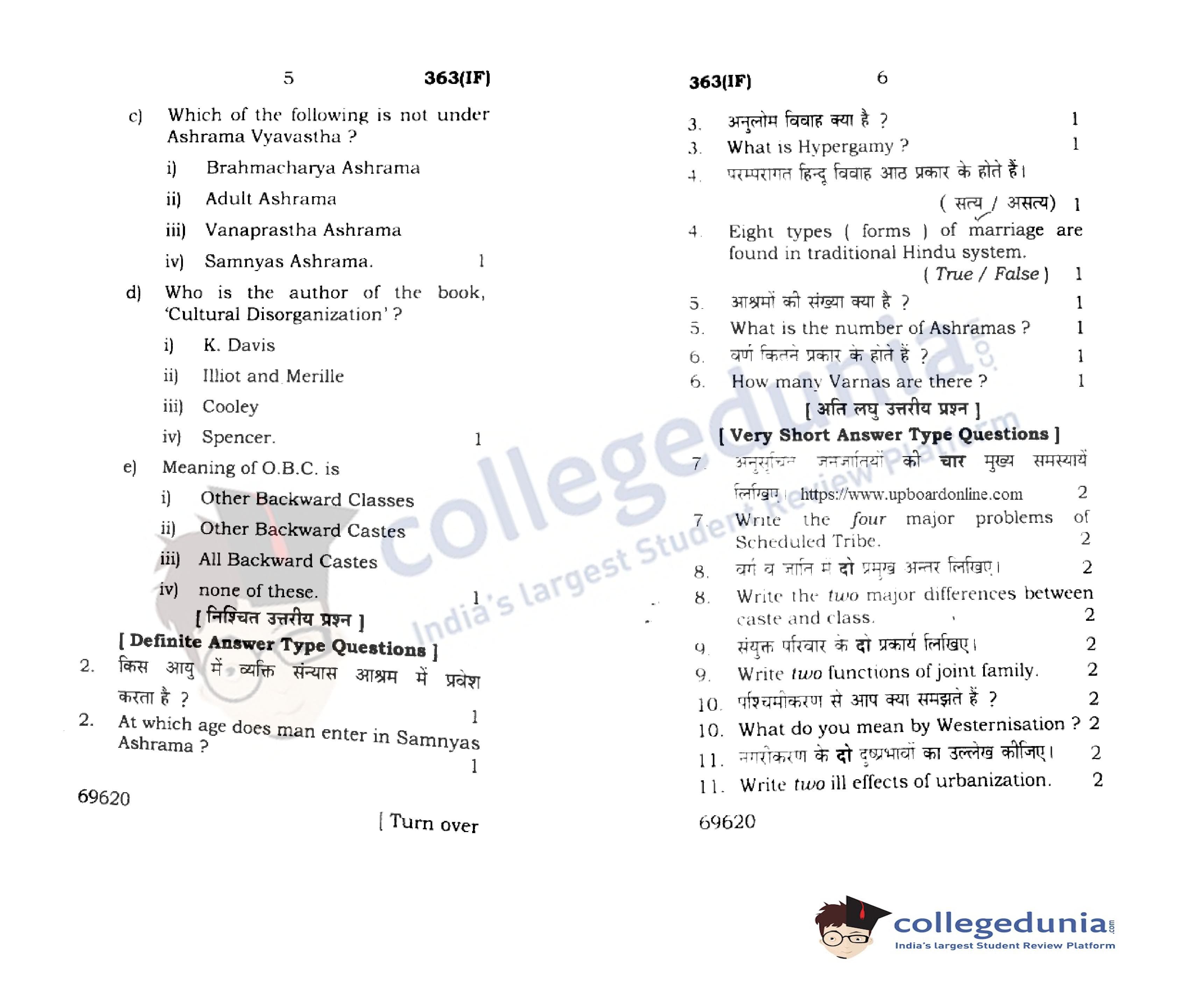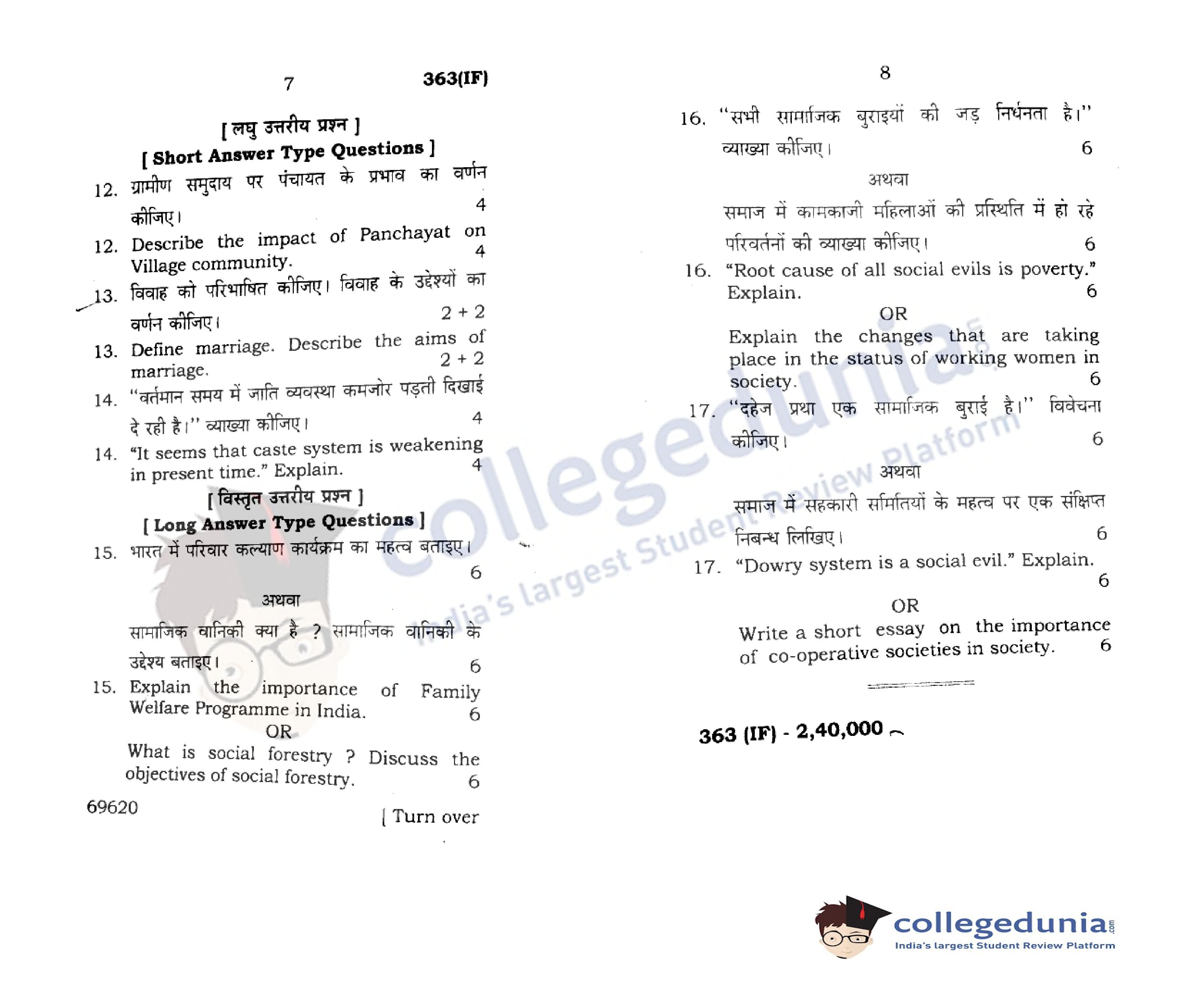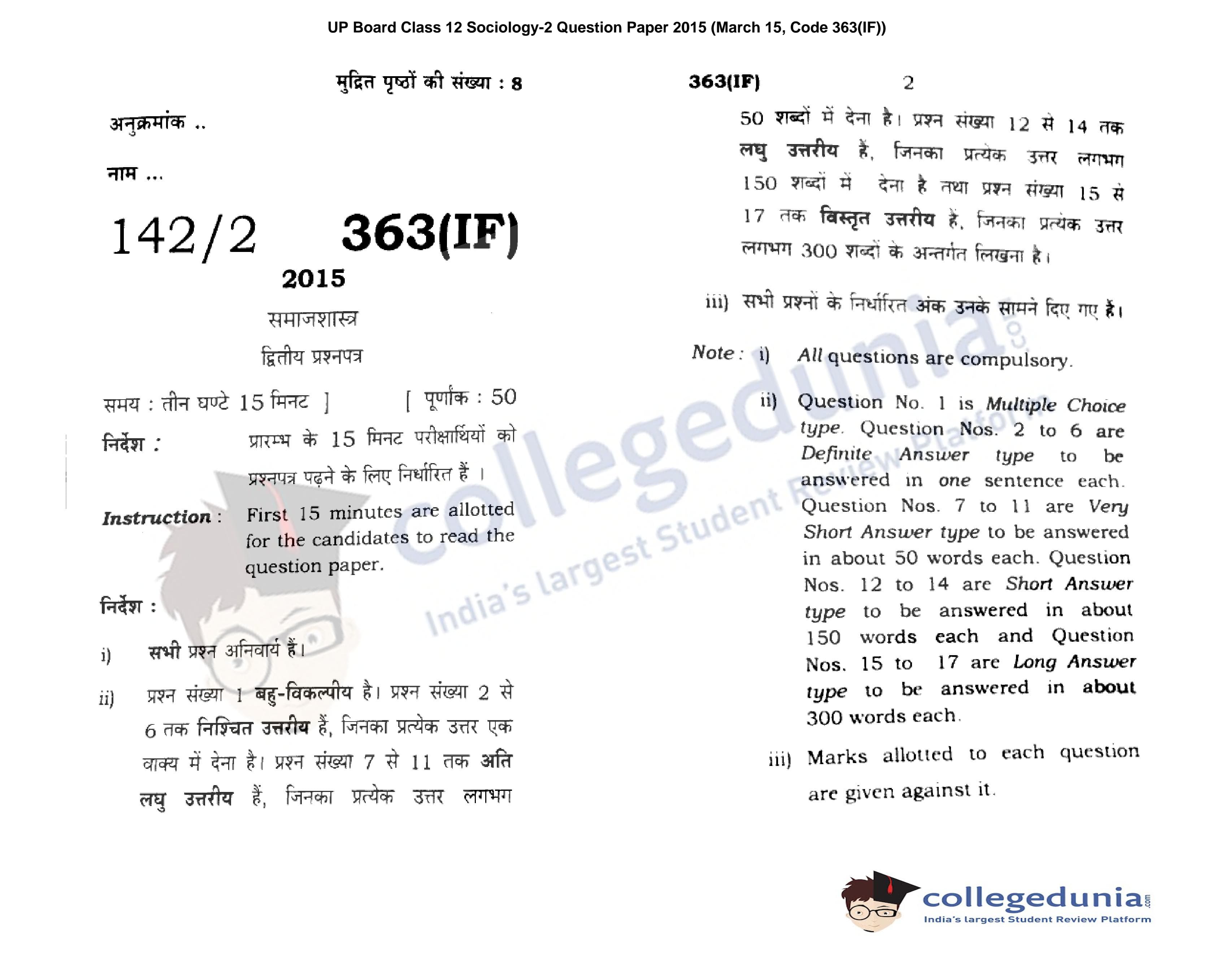 UP Board Class 12 Sociology-2 Question Paper 2015 with Answer Key Code 363(IF) is available for download. The exam was conducted by the Uttar Pradesh Madhyamik Shiksha Parishad (UPMSP) on March 15, 2015 in the Morning Session 7:30 AM to 10:45 AM. The medium of paper was English and Hindi. The question paper comprised a total of 17 questions.