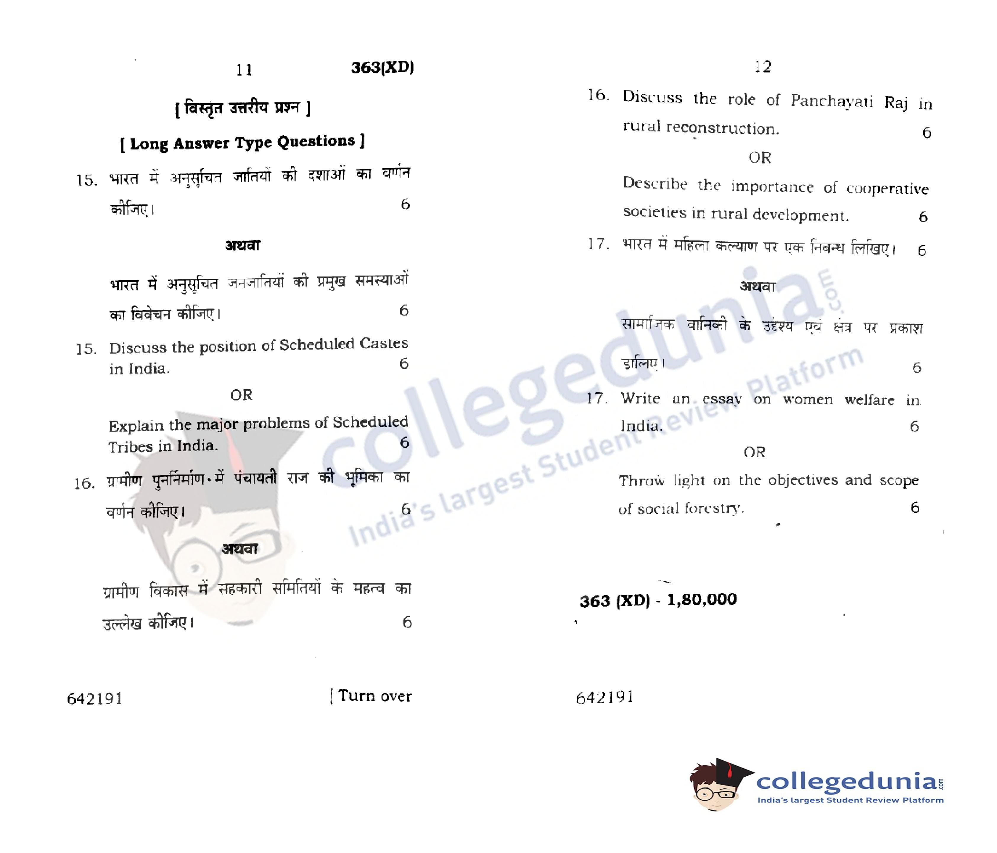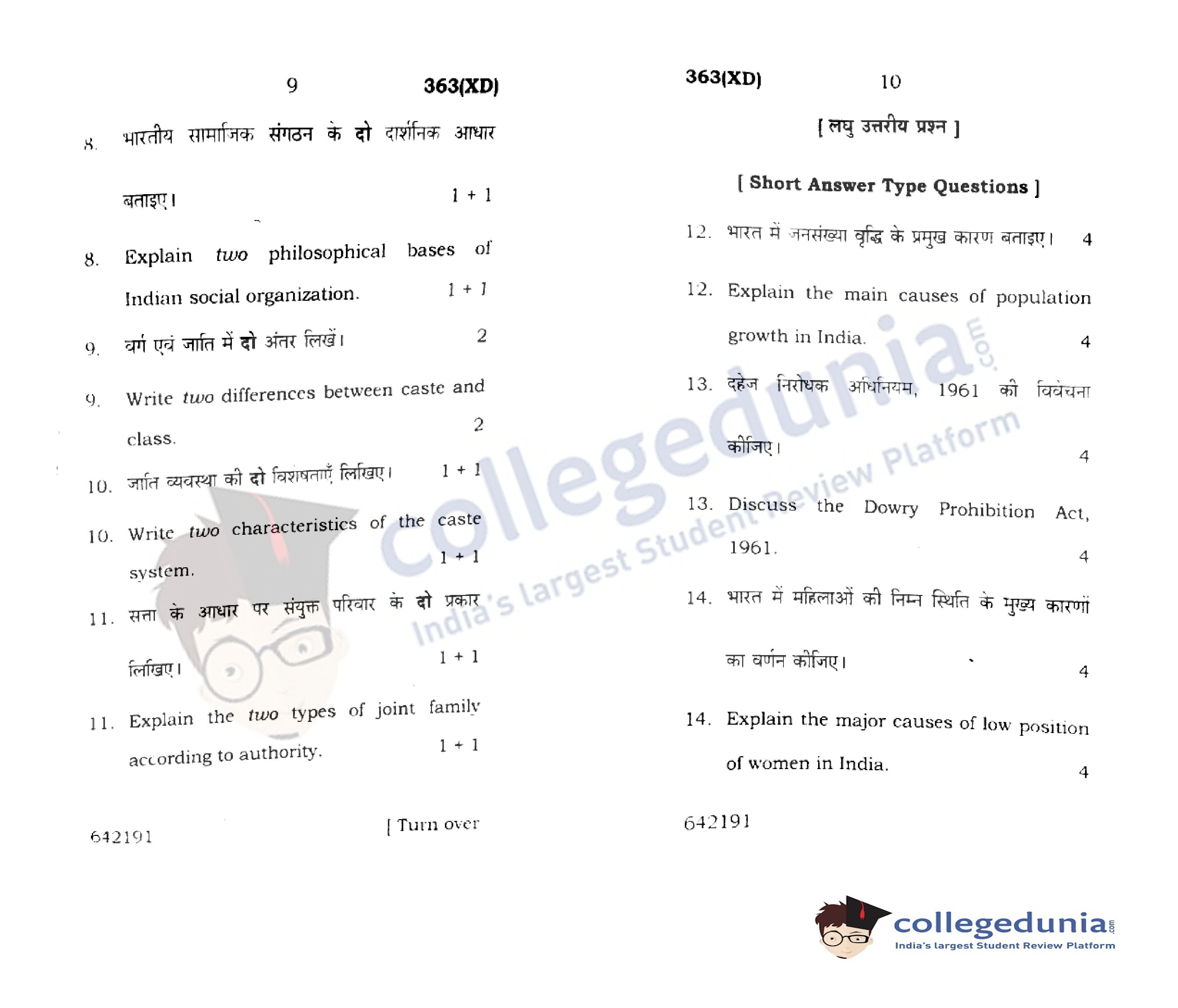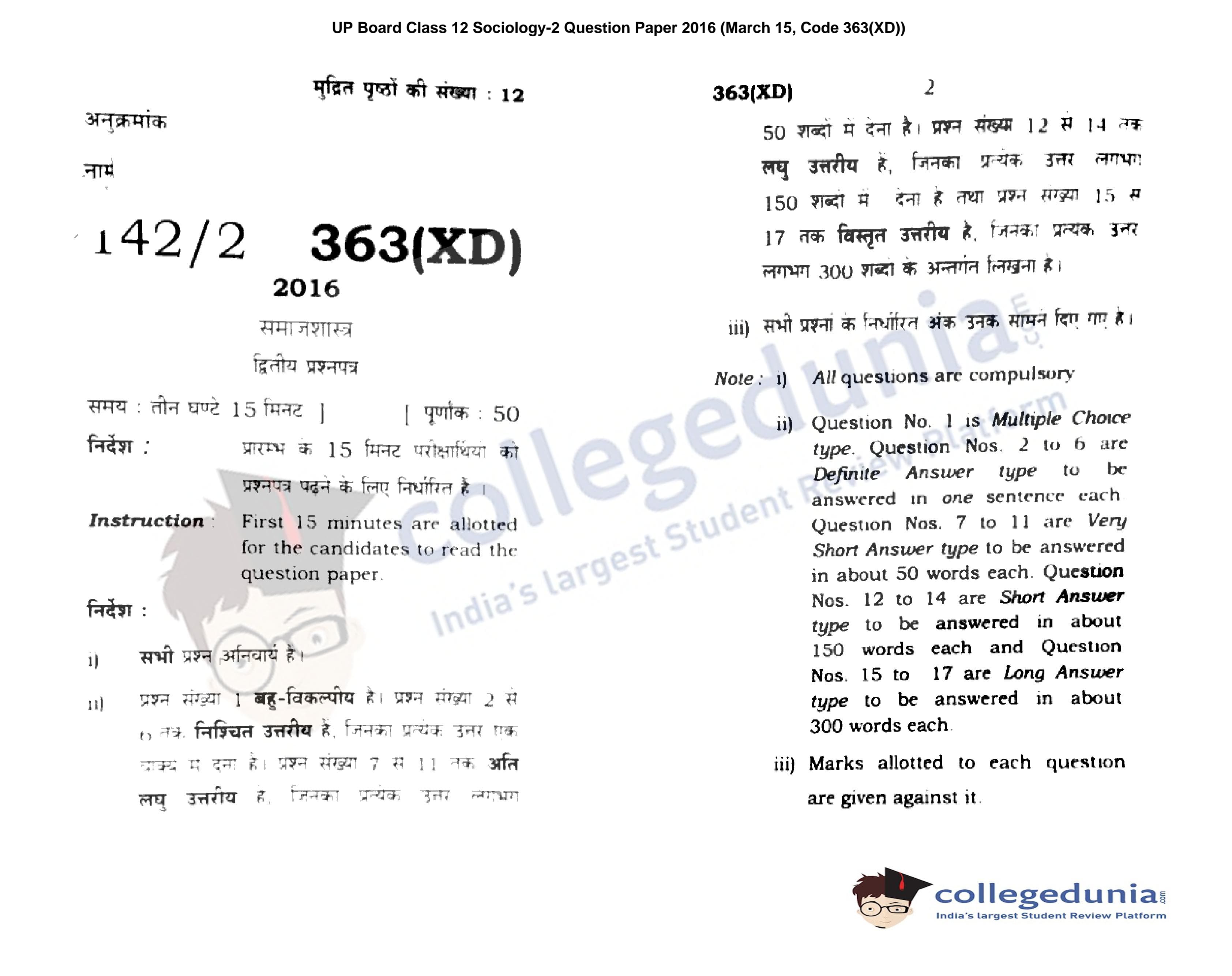UP Board Class 12 Sociology-2 Question Paper 2016 with Answer Key Code 363(XD) is available for download. The exam was conducted by the Uttar Pradesh Madhyamik Shiksha Parishad (UPMSP) on March 15, 2016 in the Morning Session 7:30 AM to 10:45 AM. The medium of paper was English and Hindi. The question paper comprised a total of 17 questions.